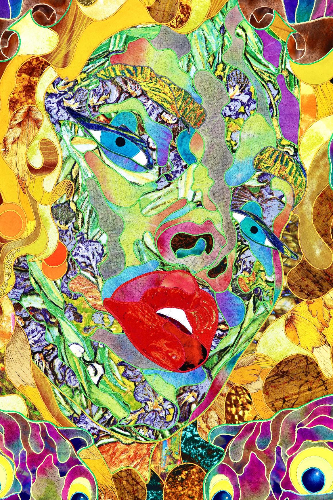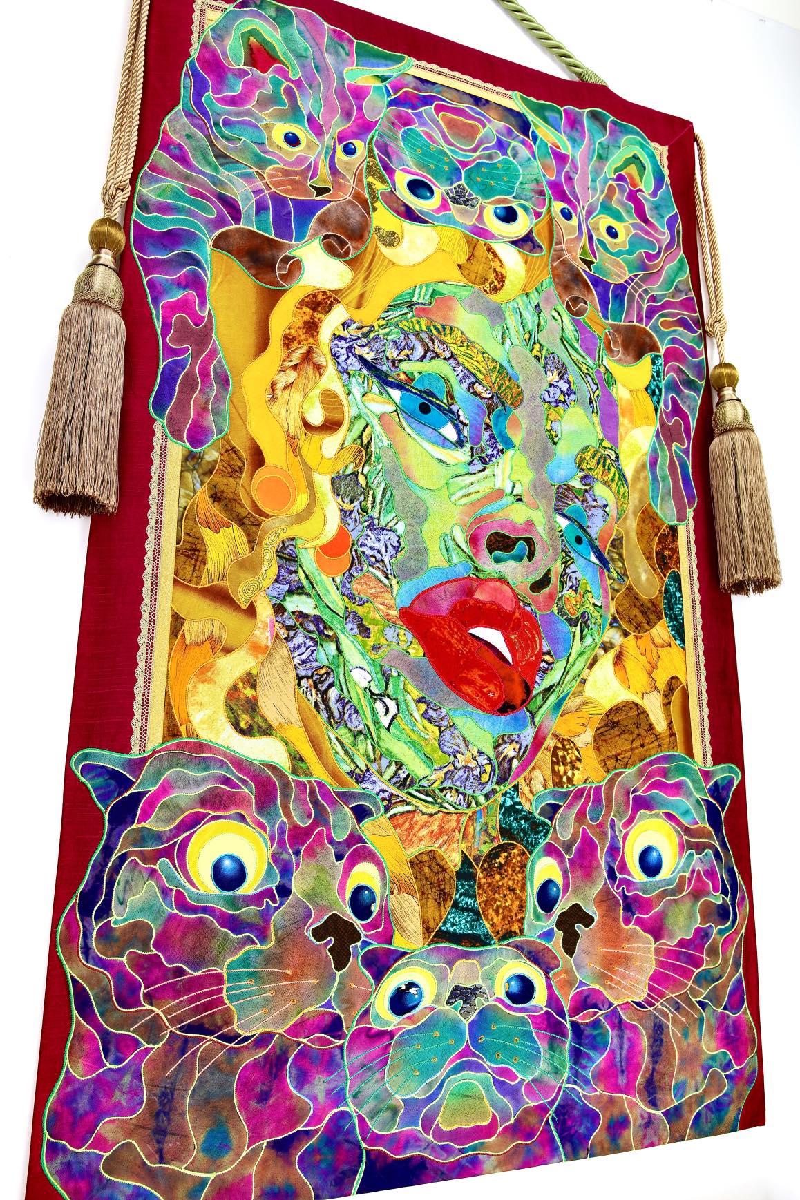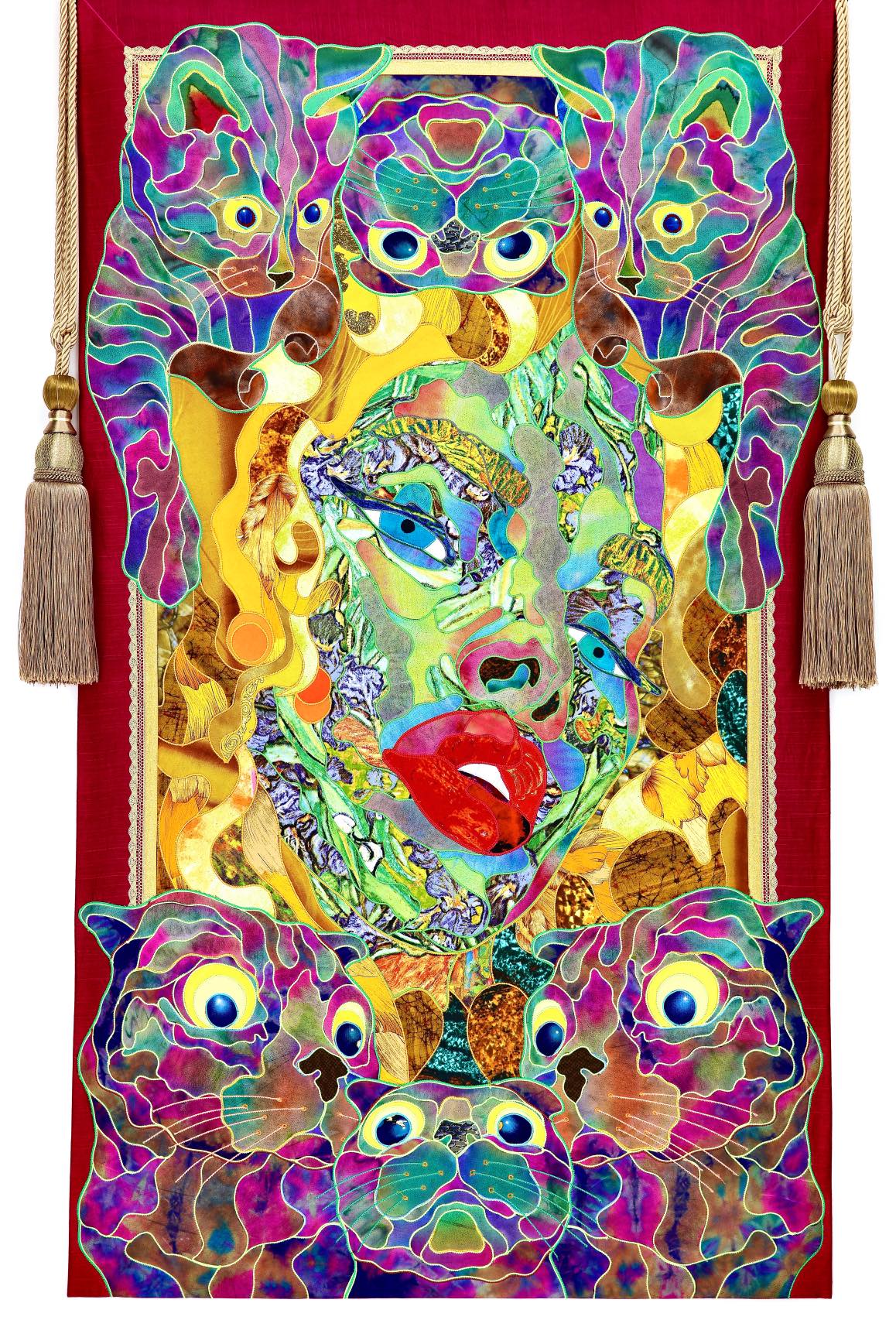 The artist is inspired by the works of Kinusaig. He developed and created a unique technique, the only one in the world in the field of textile art, combining original graphics and silk painting with factory paints of the highest class. This technology was developed using a special style of sewing. The work uses exclusive materials, silk, silk print and high-quality silk threads.