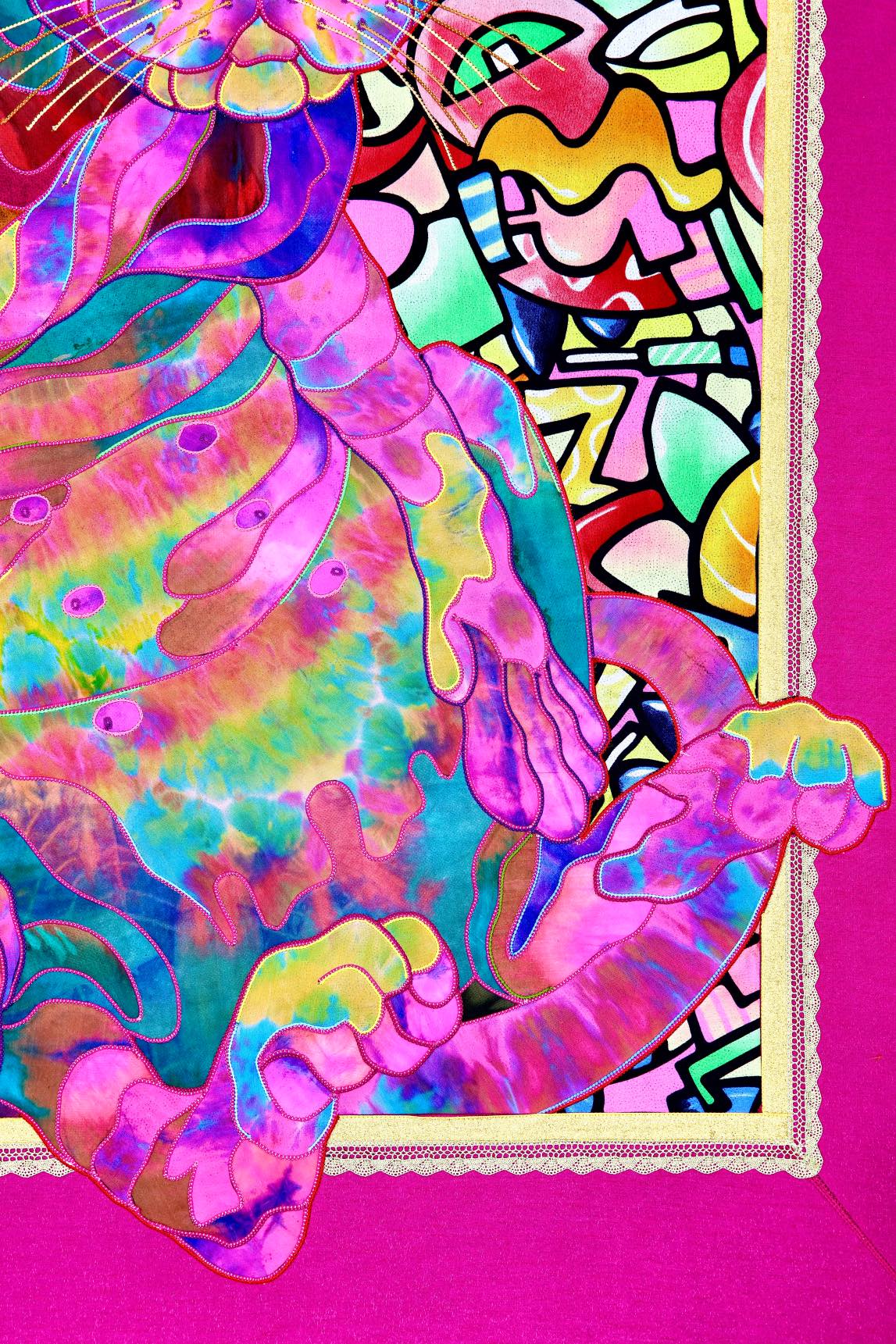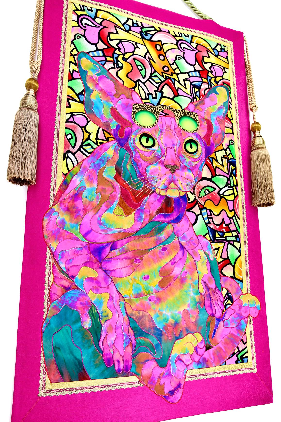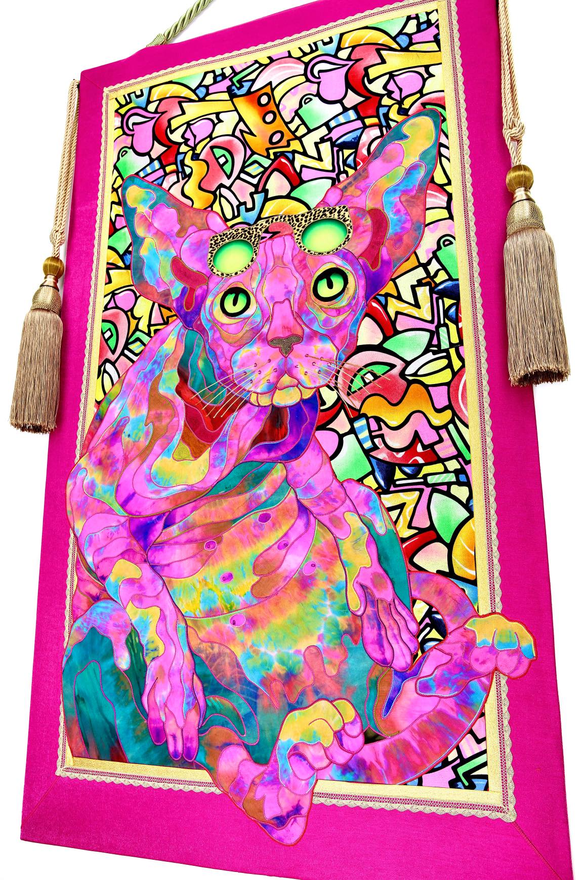 The artist is inspired by the works of Kinusaig. He developed and created a unique technique, the only one in the world in the field of textile art, combining original graphics and silk painting with factory paints of the highest class. This technology was developed using a special style of sewing. The work uses exclusive materials, silk, silk print and high-quality silk threads.