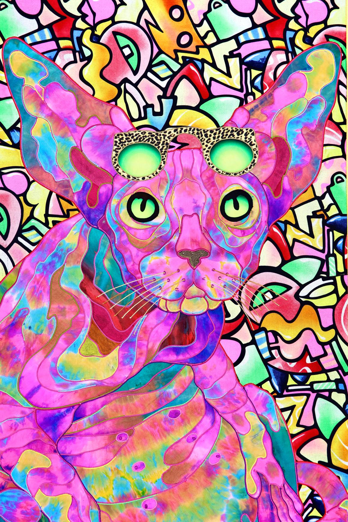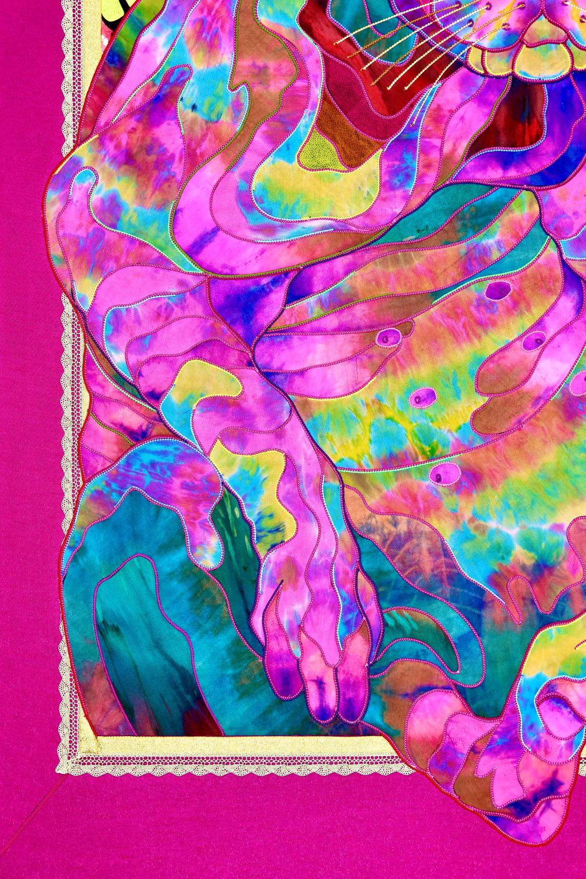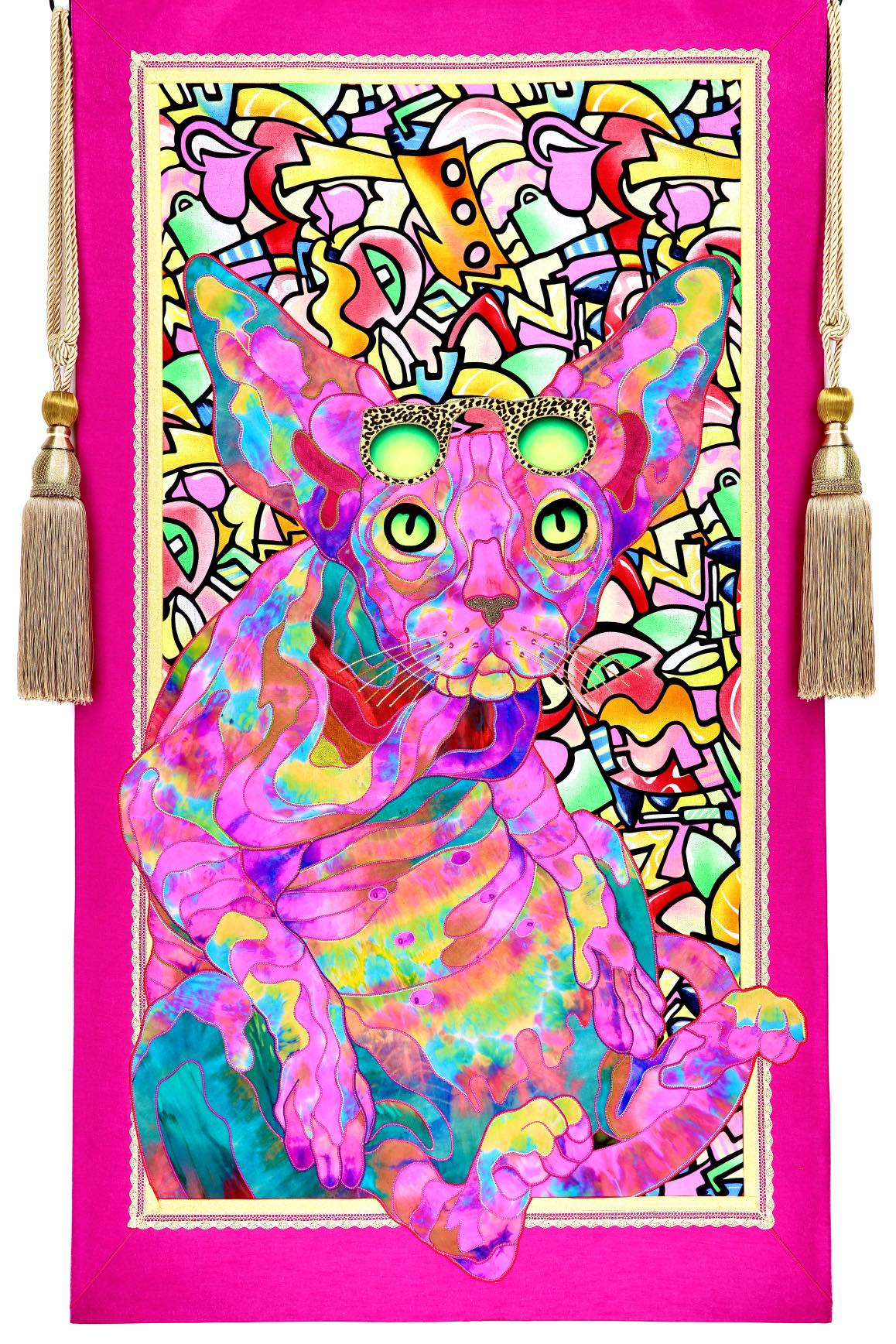 The artist is inspired by the works of Kinusaig. He developed and created a unique technique, the only one in the world in the field of textile art, combining original graphics and silk painting with factory paints of the highest class. This technology was developed using a special style of sewing. The work uses exclusive materials, silk, silk print and high-quality silk threads.
