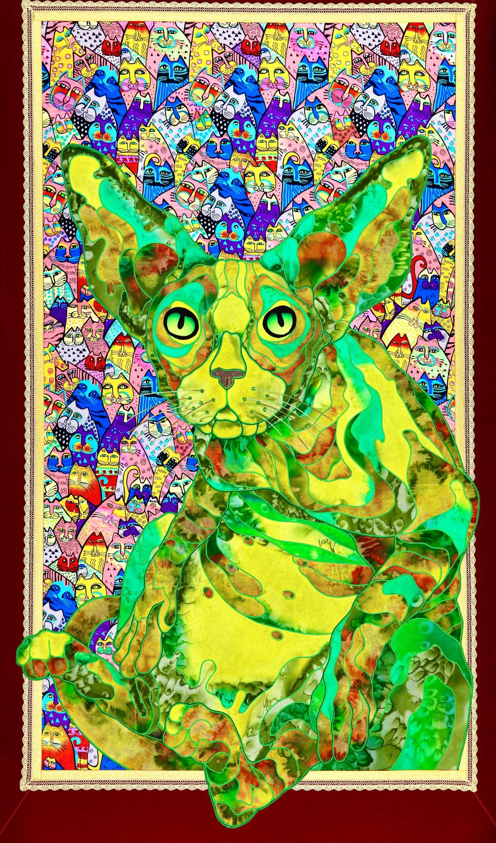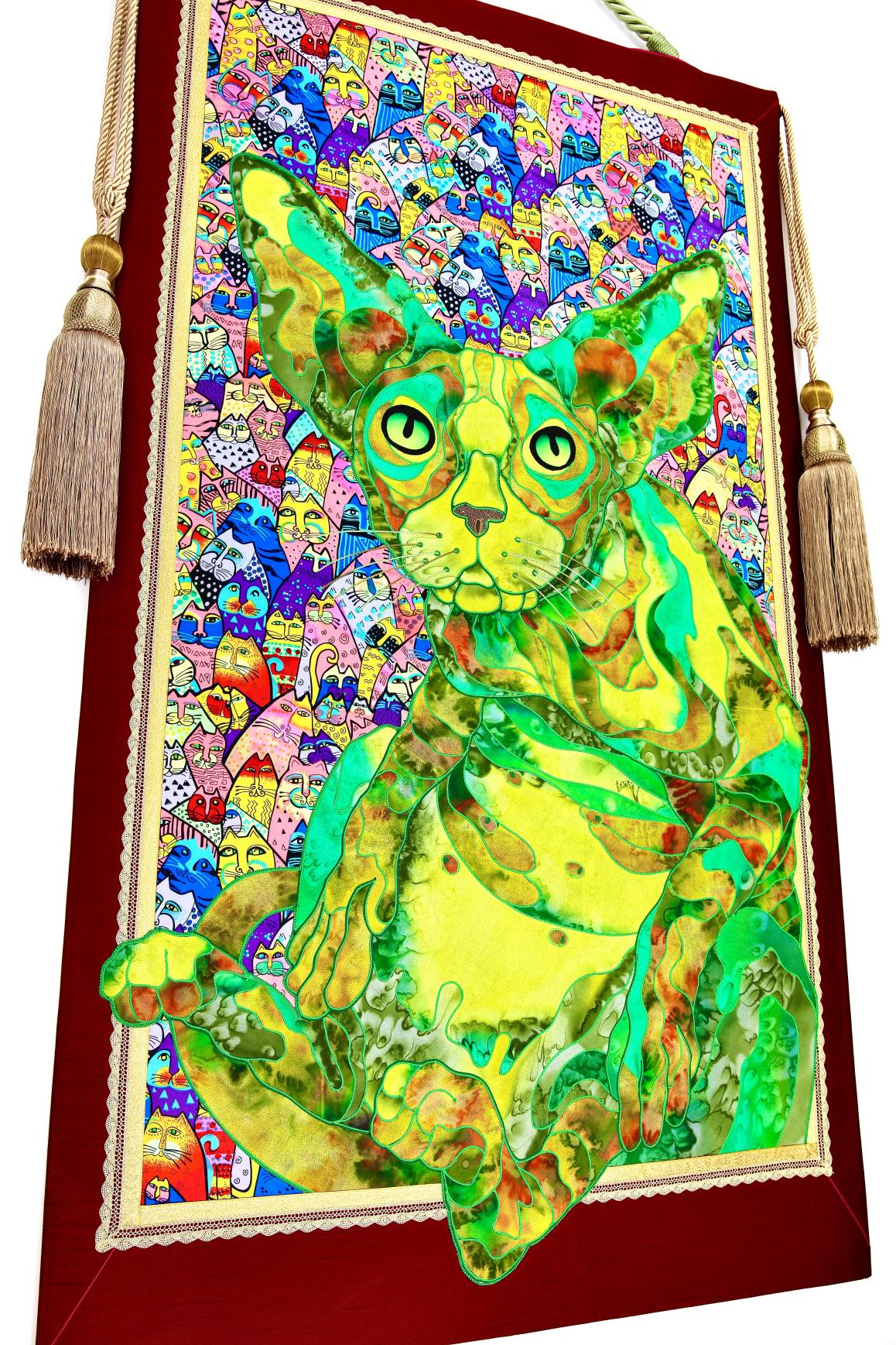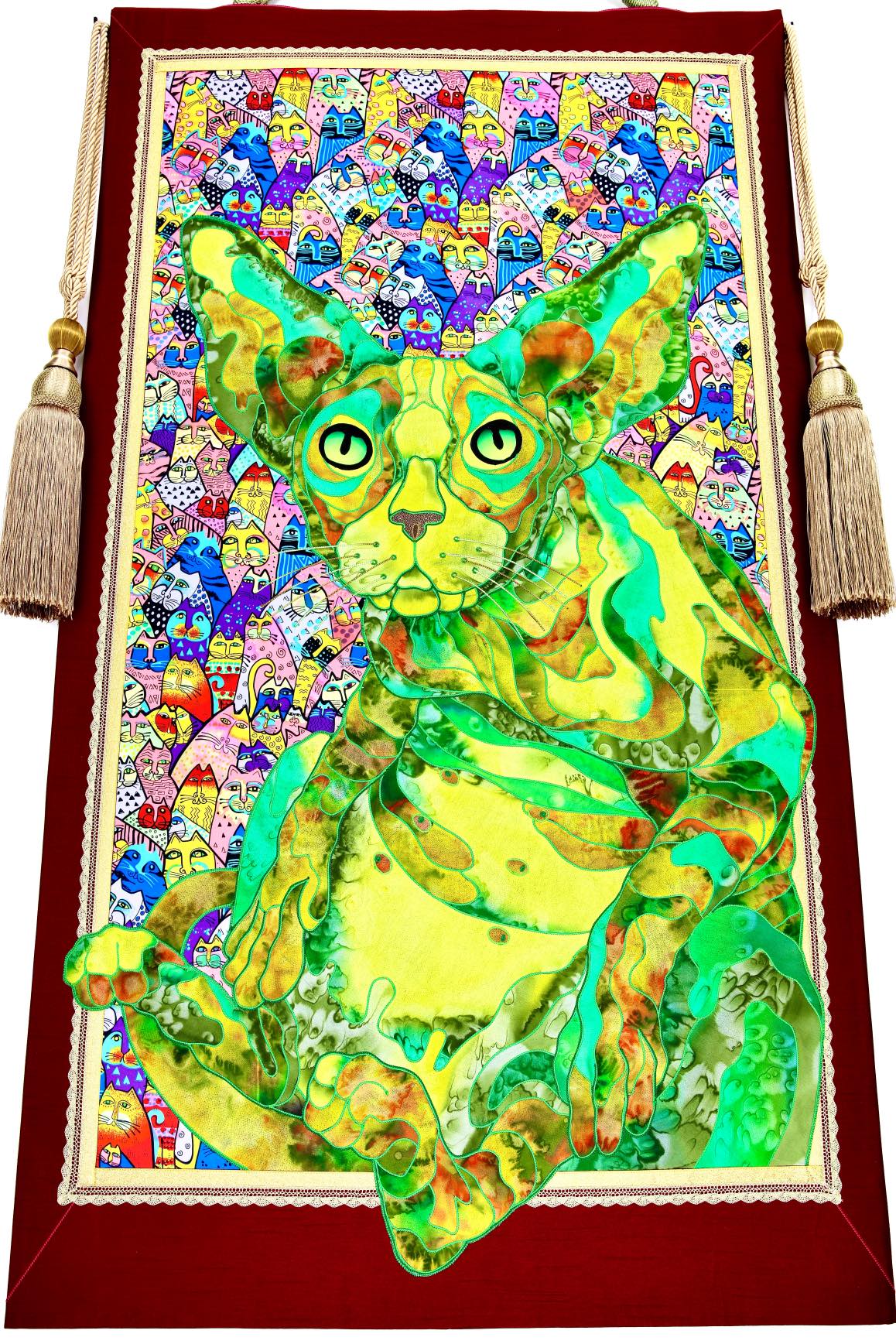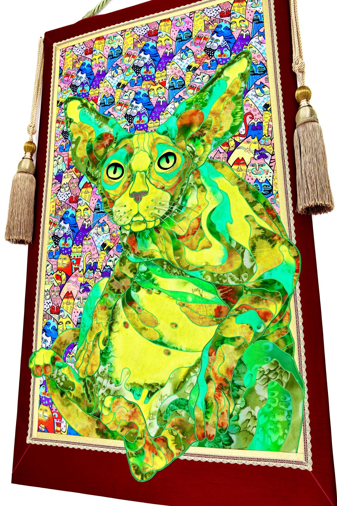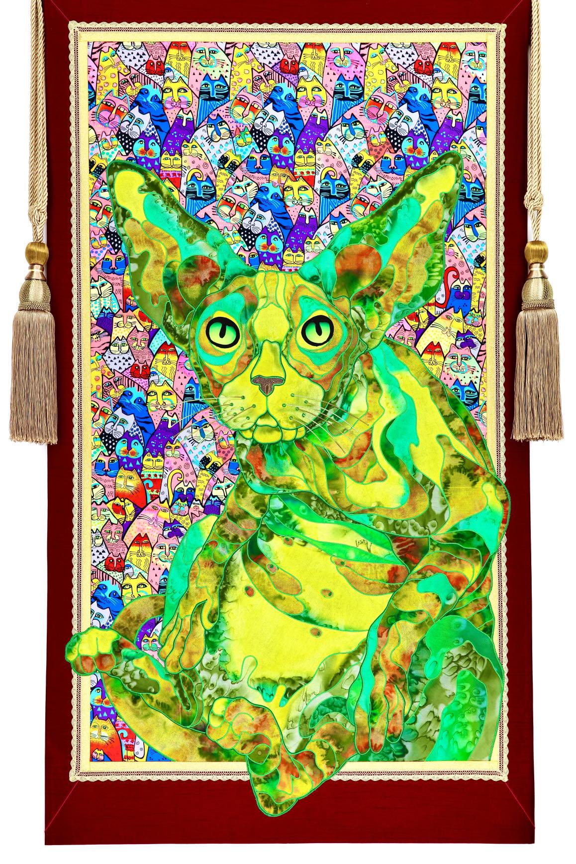 The artist is inspired by the works of Kinusaig. He developed and created a unique technique, the only one in the world in the field of textile art, combining original graphics and silk painting with factory paints of the highest class. This technology was developed using a special style of sewing. The work uses exclusive materials, silk, silk print and high-quality silk threads.