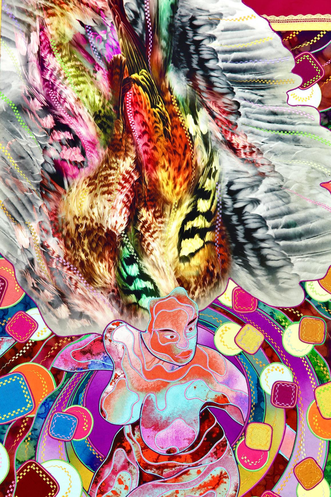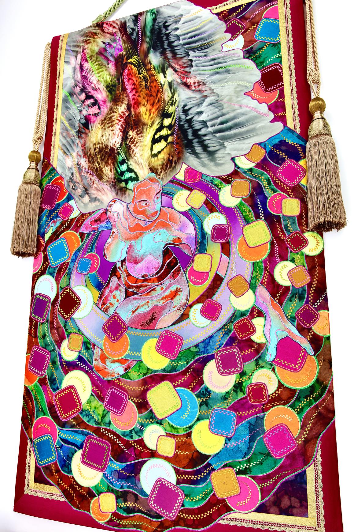 The artist is inspired by the works of Kinusaig. He developed and created a unique technique, the only one in the world in the field of textile art, combining original graphics and silk painting with factory paints of the highest class. This technology was developed using a special style of sewing. The work uses exclusive materials, silk, silk print and high-quality silk threads.