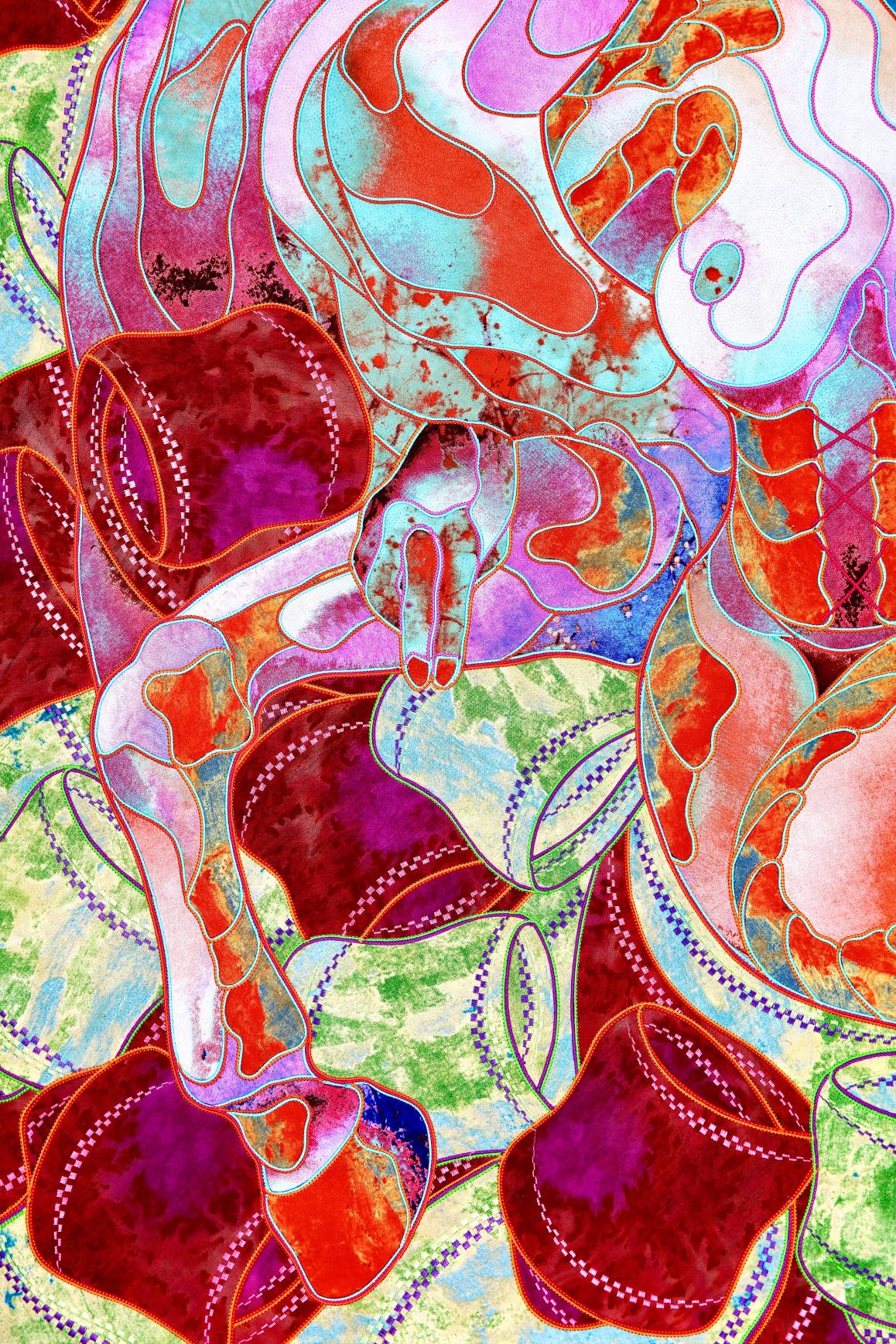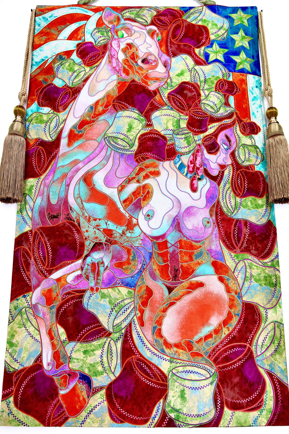 The artist is inspired by the works of Kinusaig. He developed and created a unique technique, the only one in the world in the field of textile art, combining original graphics and silk painting with factory paints of the highest class. This technology was developed using a special style of sewing. The work uses exclusive materials, silk, silk print and high-quality silk threads.