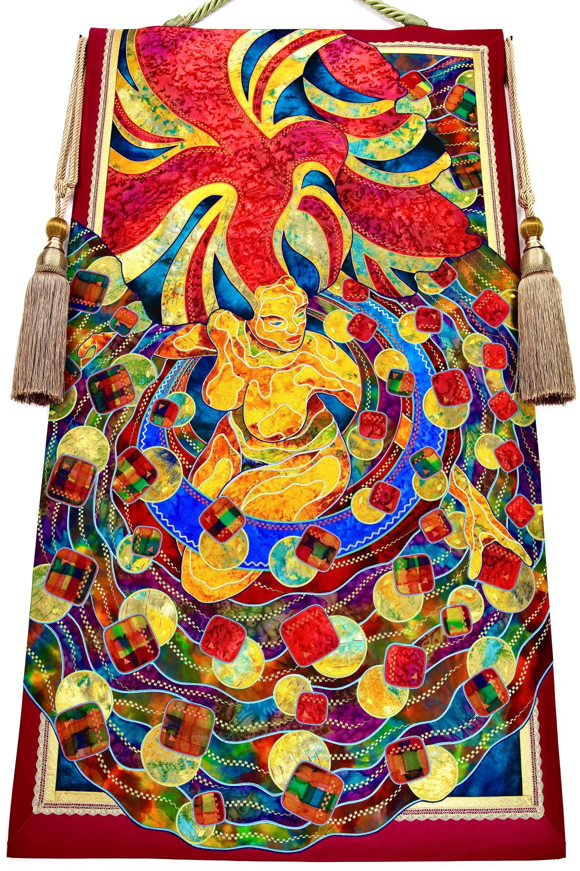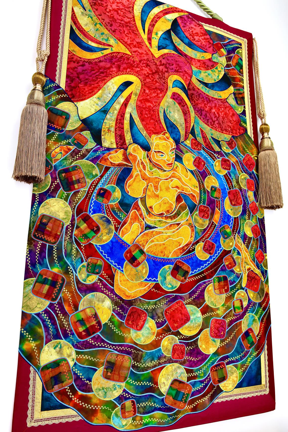 The artist is inspired by the works of Kinusaig. He developed and created a unique technique, the only one in the world in the field of textile art, combining original graphics and silk painting with factory paints of the highest class. This technology was developed using a special style of sewing. The work uses exclusive materials, silk, silk print and high-quality silk threads.