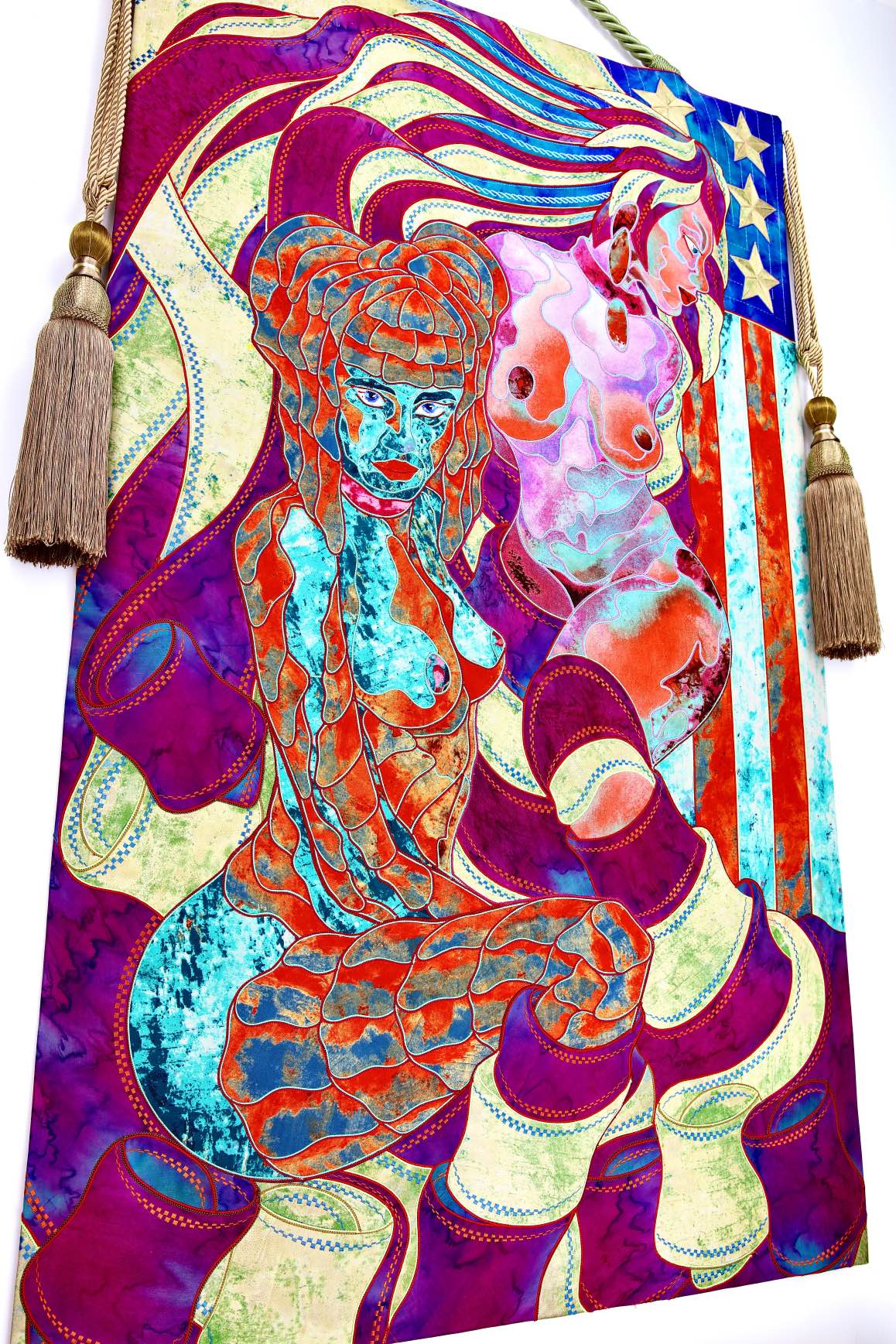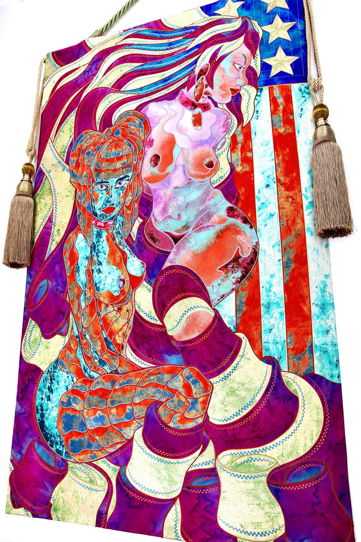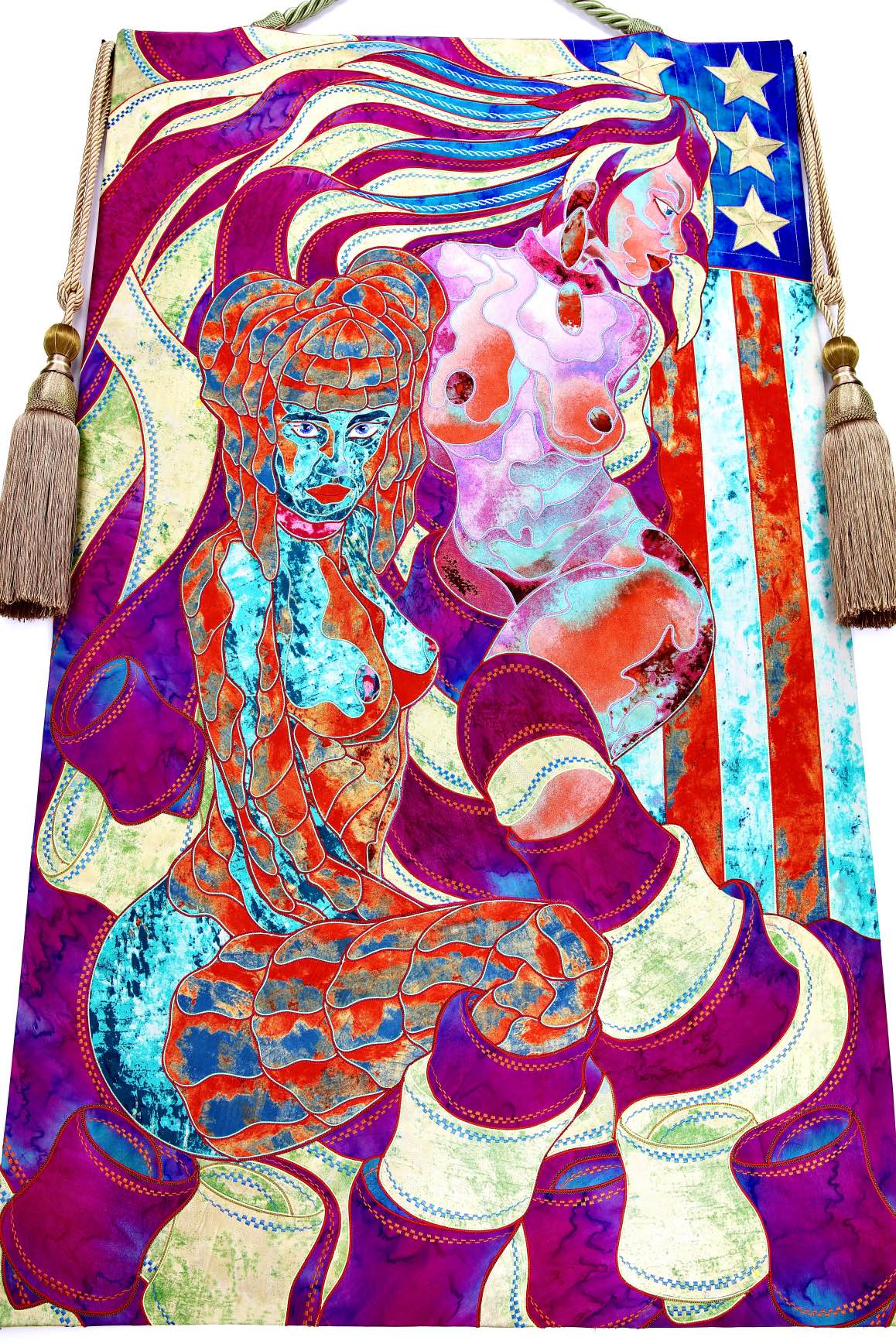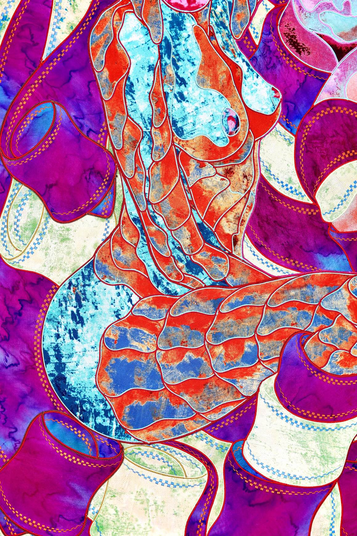 The artist is inspired by the works of Kinusaig. He developed and created a unique technique, the only one in the world in the field of textile art, combining original graphics and silk painting with factory paints of the highest class. This technology was developed using a special style of sewing. The work uses exclusive materials, silk, silk print and high-quality silk threads.