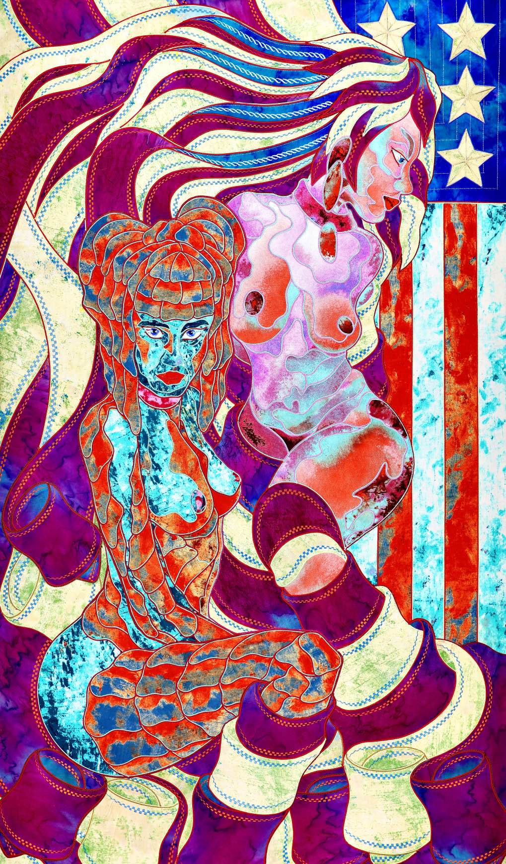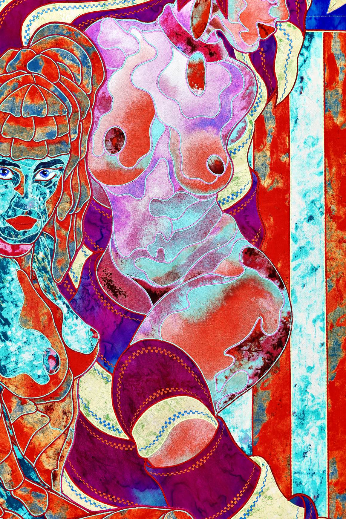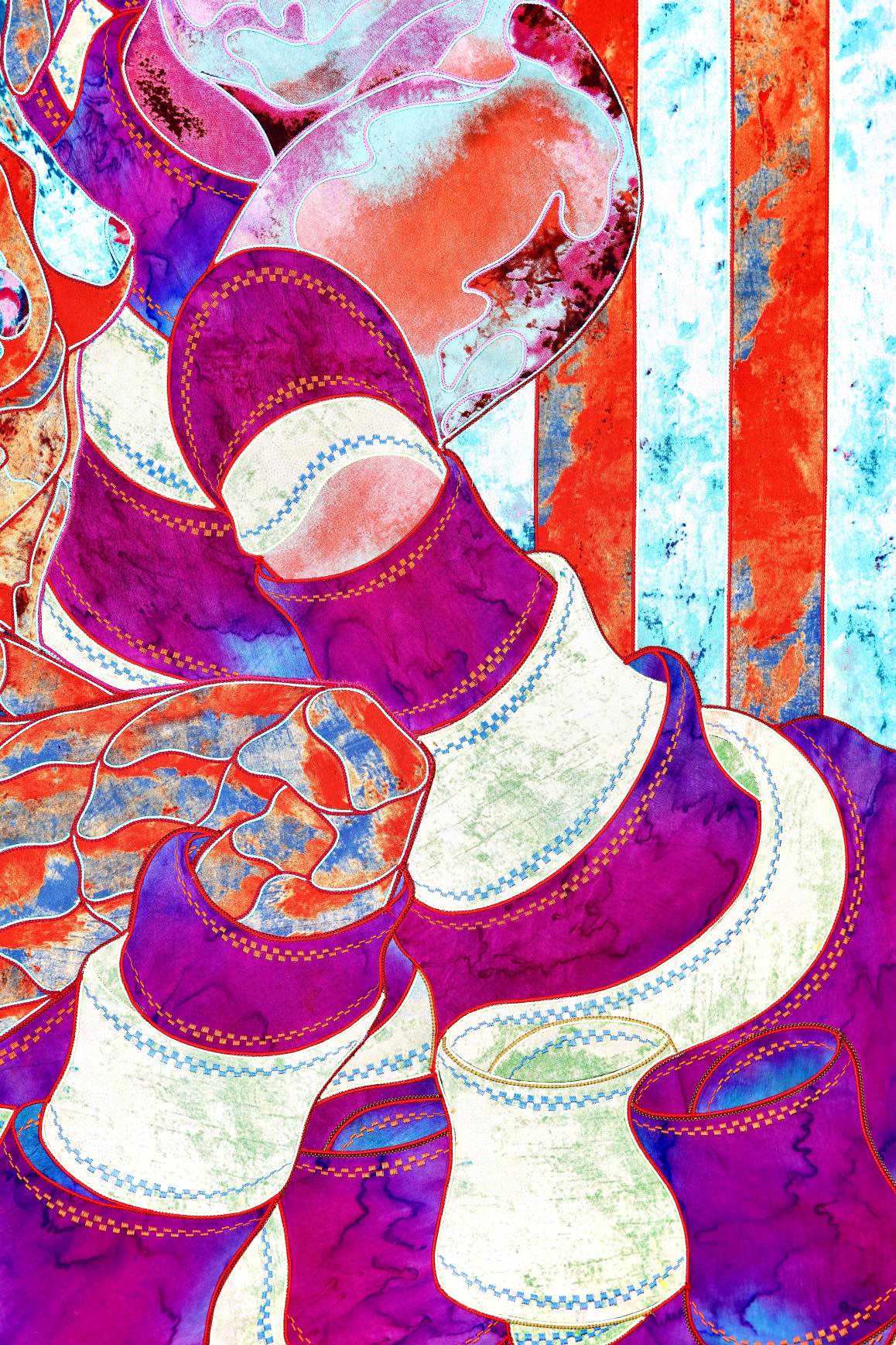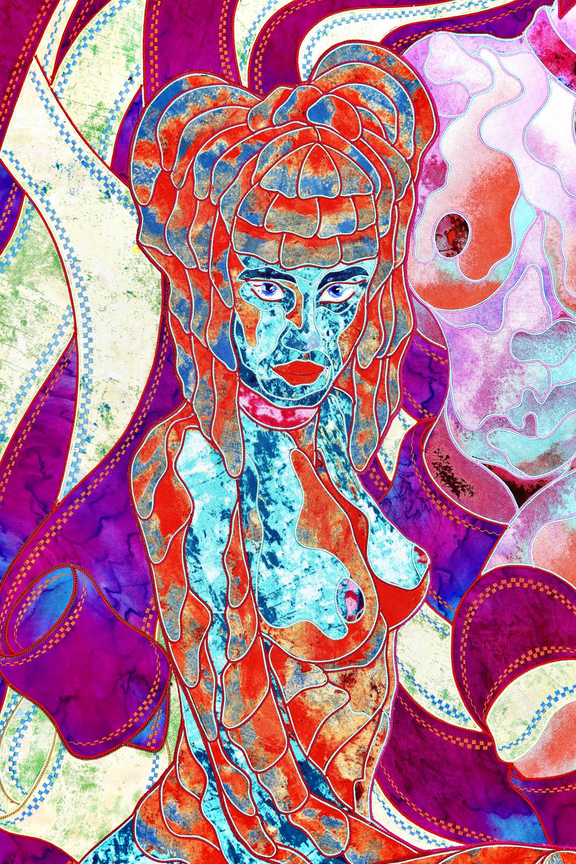 The artist is inspired by the works of Kinusaig. He developed and created a unique technique, the only one in the world in the field of textile art, combining original graphics and silk painting with factory paints of the highest class. This technology was developed using a special style of sewing. The work uses exclusive materials, silk, silk print and high-quality silk threads.
