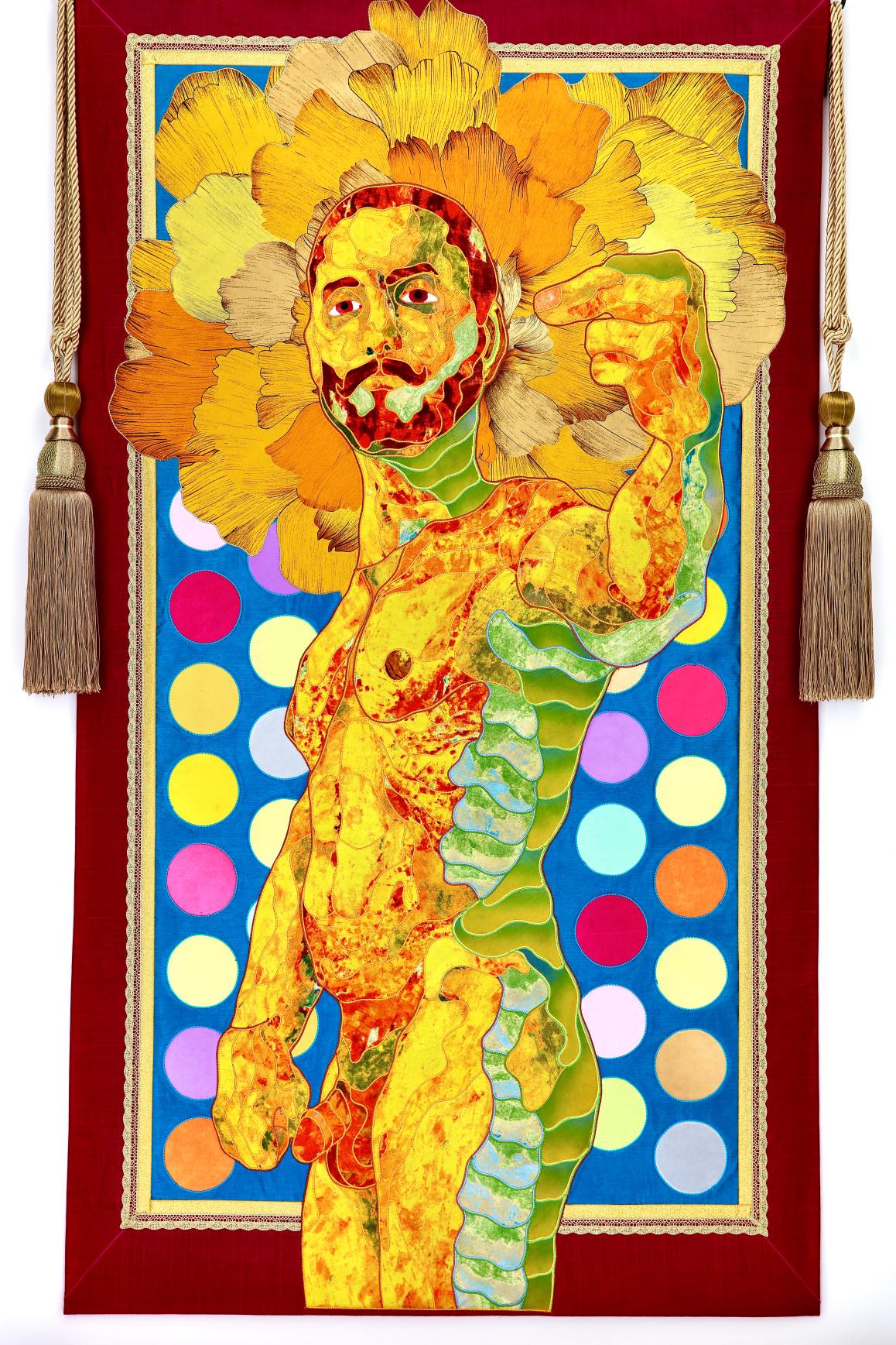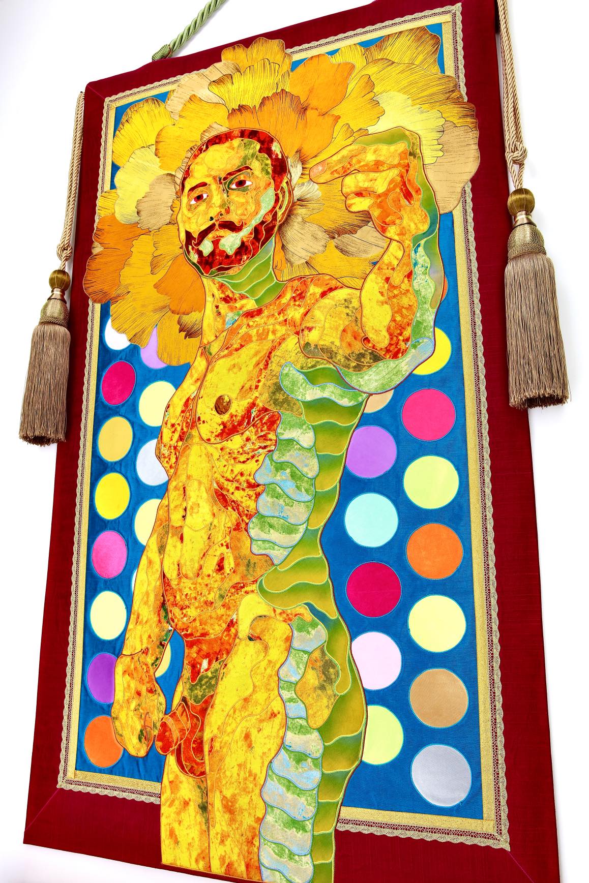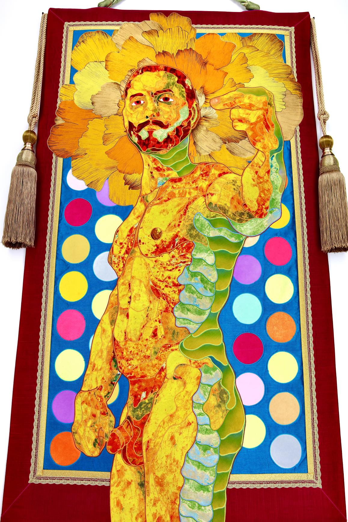 The artist is inspired by the works of Kinusaig. He developed and created a unique technique, the only one in the world in the field of textile art, combining original graphics and silk painting with factory paints of the highest class. This technology was developed using a special style of sewing. The work uses exclusive materials, silk, silk print and high-quality silk threads.