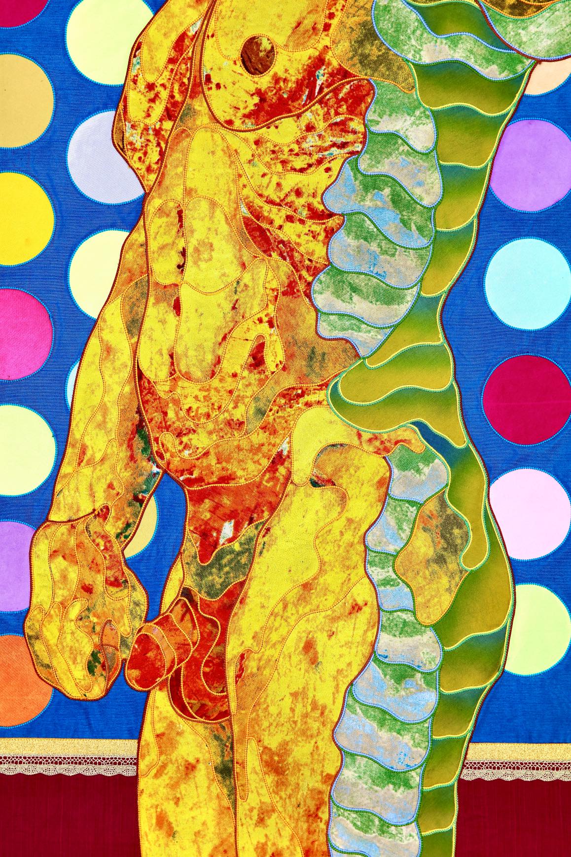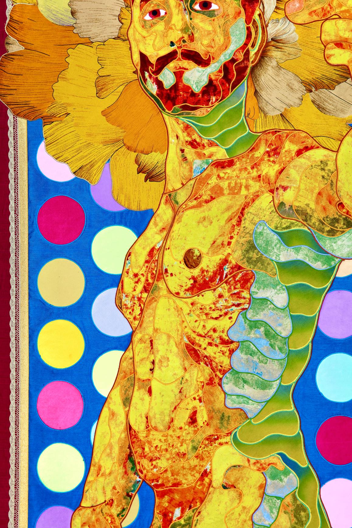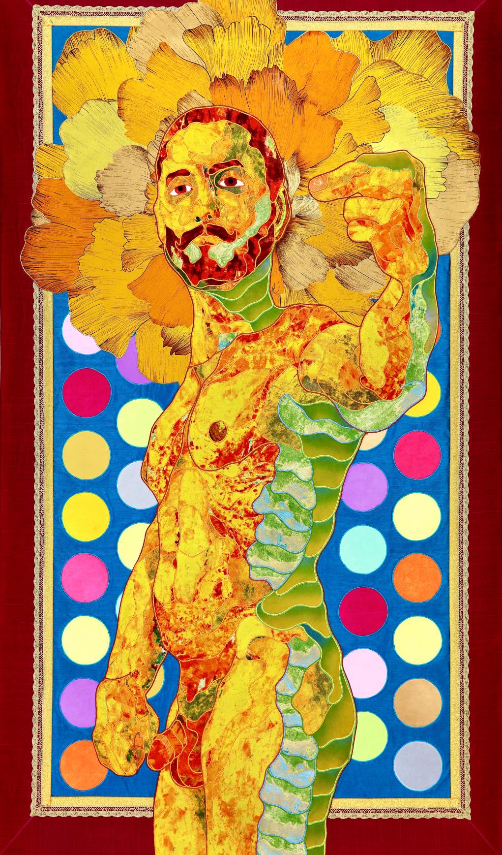 The artist is inspired by the works of Kinusaig. He developed and created a unique technique, the only one in the world in the field of textile art, combining original graphics and silk painting with factory paints of the highest class. This technology was developed using a special style of sewing. The work uses exclusive materials, silk, silk print and high-quality silk threads.