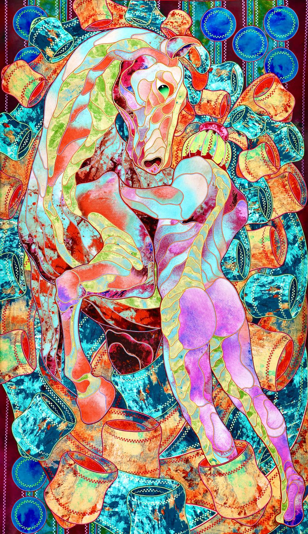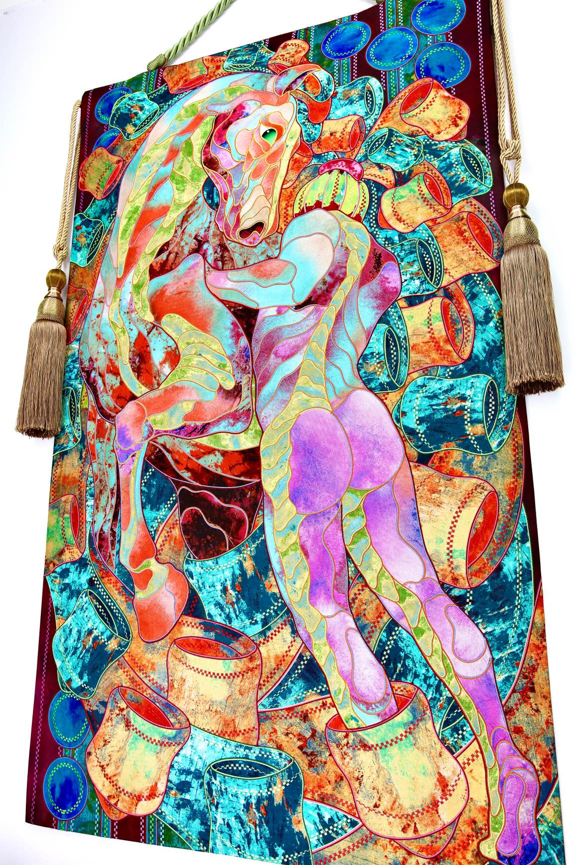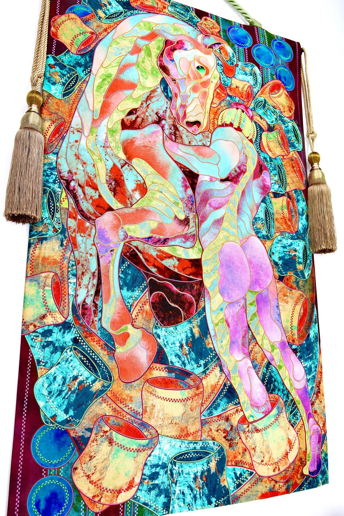 The artist is inspired by the works of Kinusaig. He developed and created a unique technique, the only one in the world in the field of textile art, combining original graphics and silk painting with factory paints of the highest class. This technology was developed using a special style of sewing. The work uses exclusive materials, silk, silk print and high-quality silk threads.