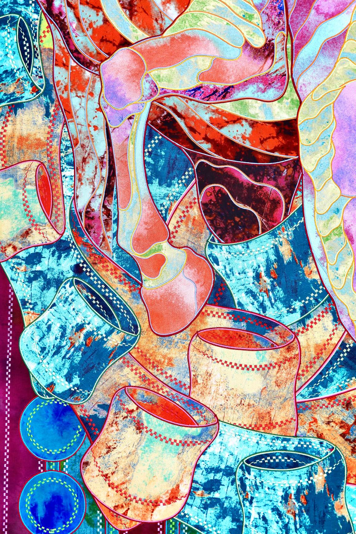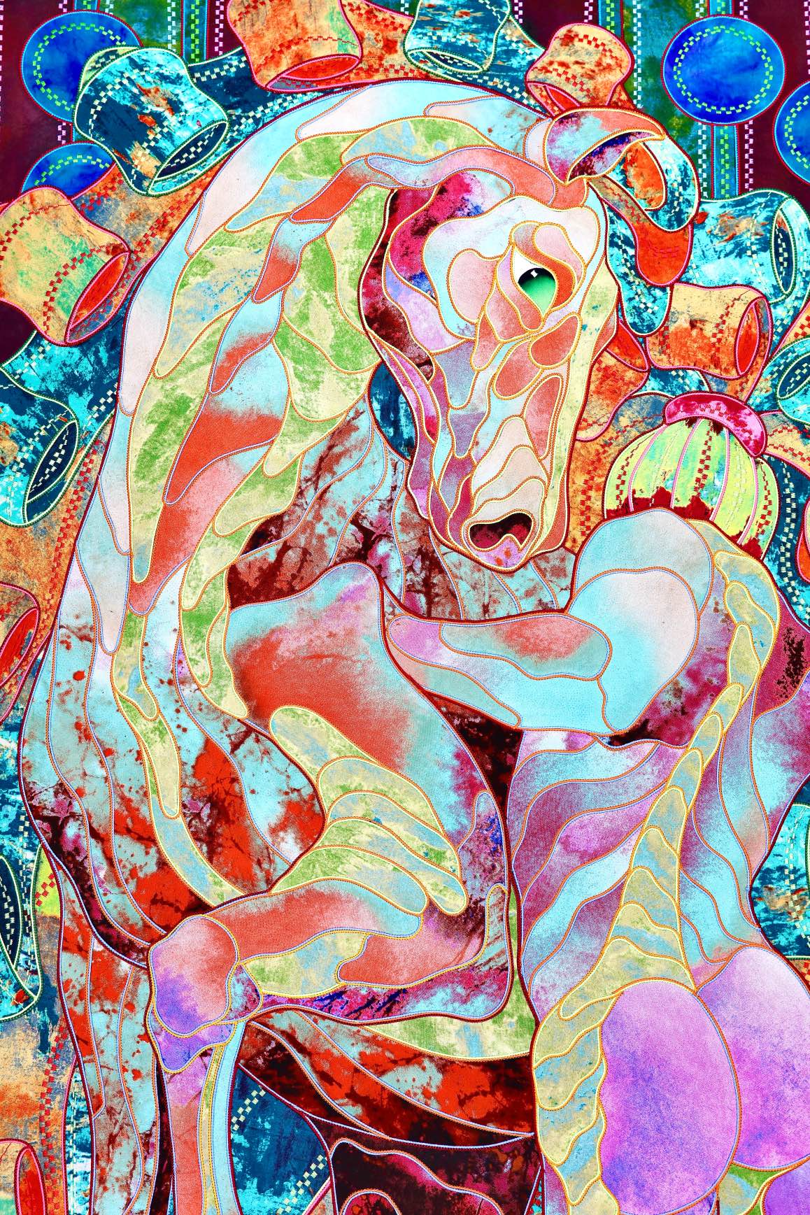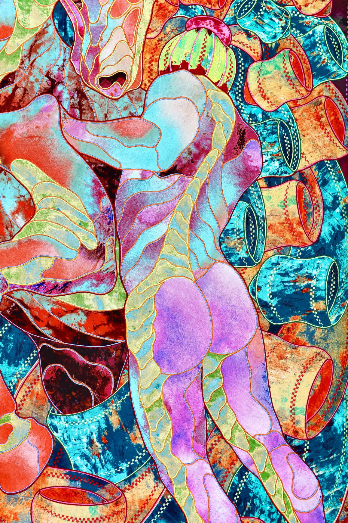 The artist is inspired by the works of Kinusaig. He developed and created a unique technique, the only one in the world in the field of textile art, combining original graphics and silk painting with factory paints of the highest class. This technology was developed using a special style of sewing. The work uses exclusive materials, silk, silk print and high-quality silk threads.