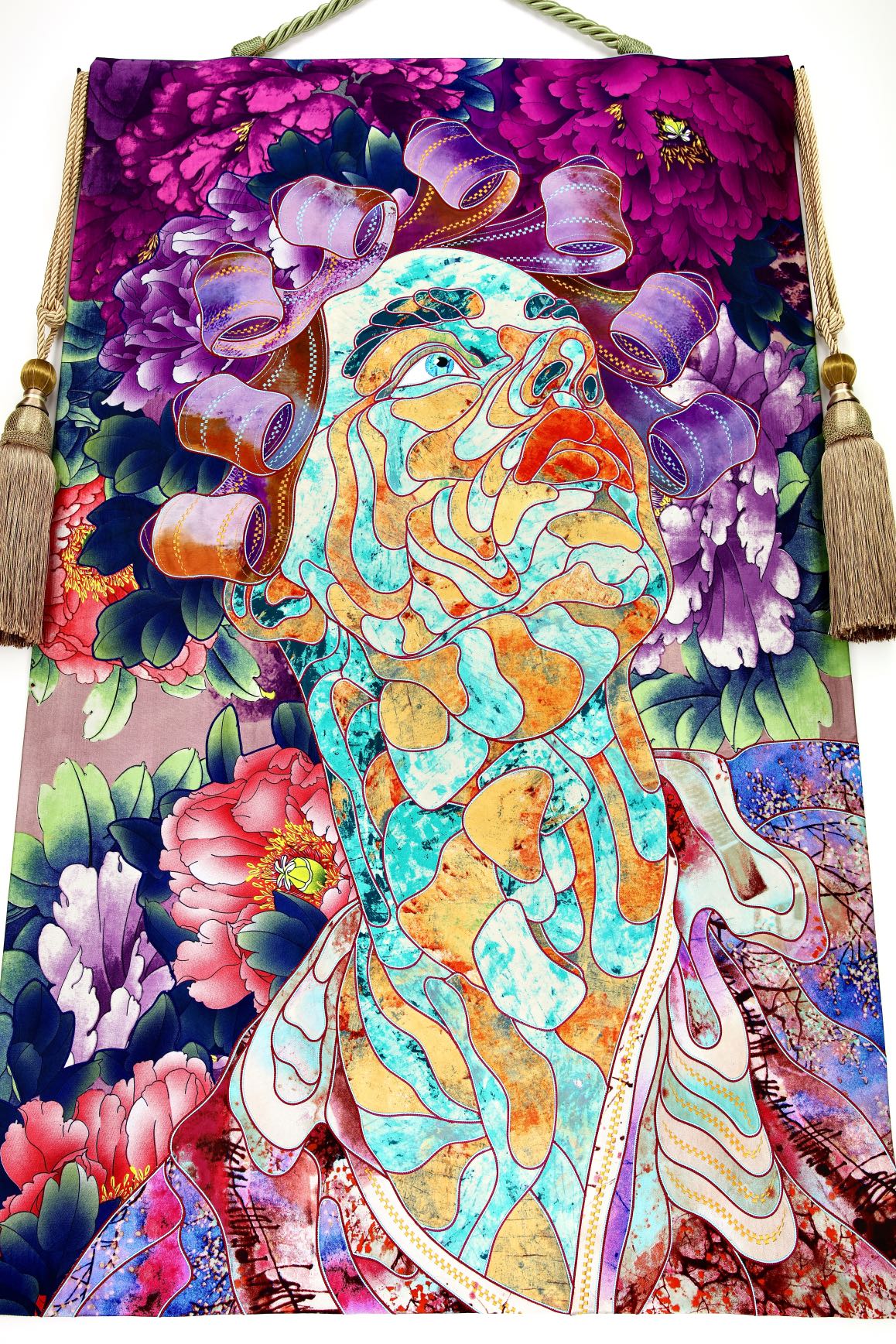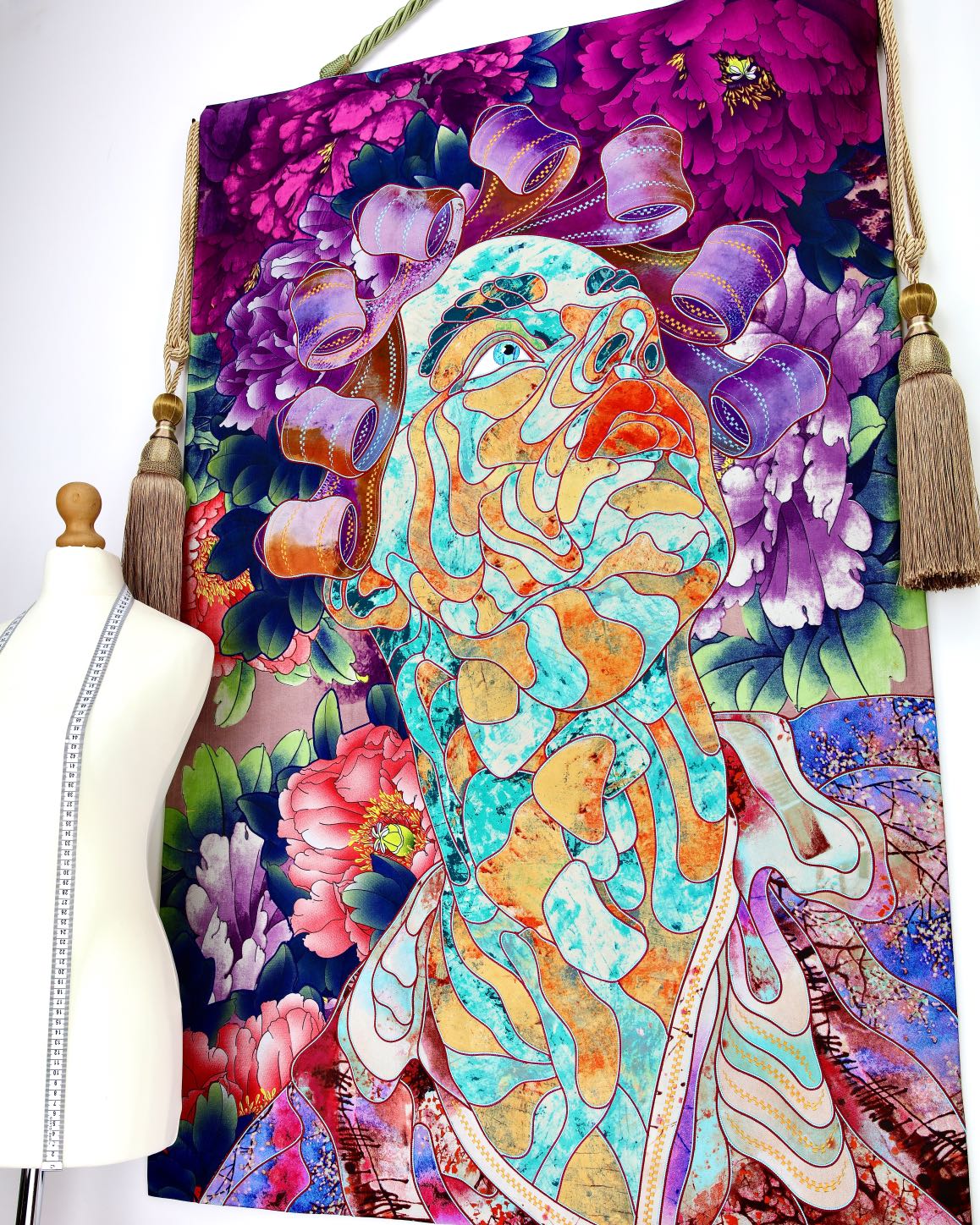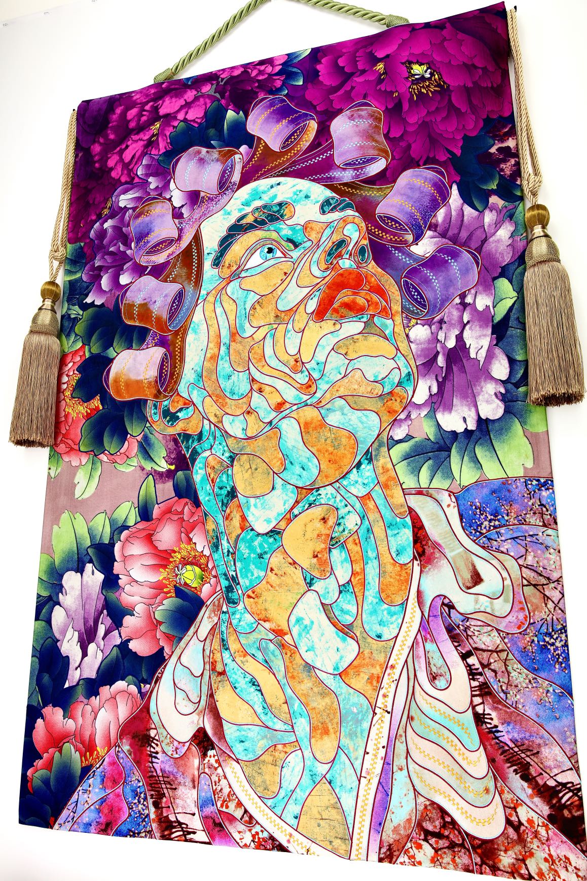 The artist is inspired by the works of Kinusaig. He developed and created a unique technique, the only one in the world in the field of textile art, combining original graphics and silk painting with factory paints of the highest class. This technology was developed using a special style of sewing. The work uses exclusive materials, silk, silk print and high-quality silk threads.