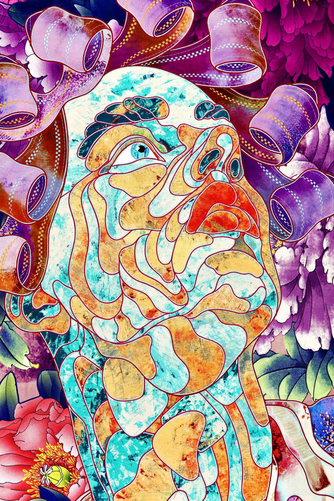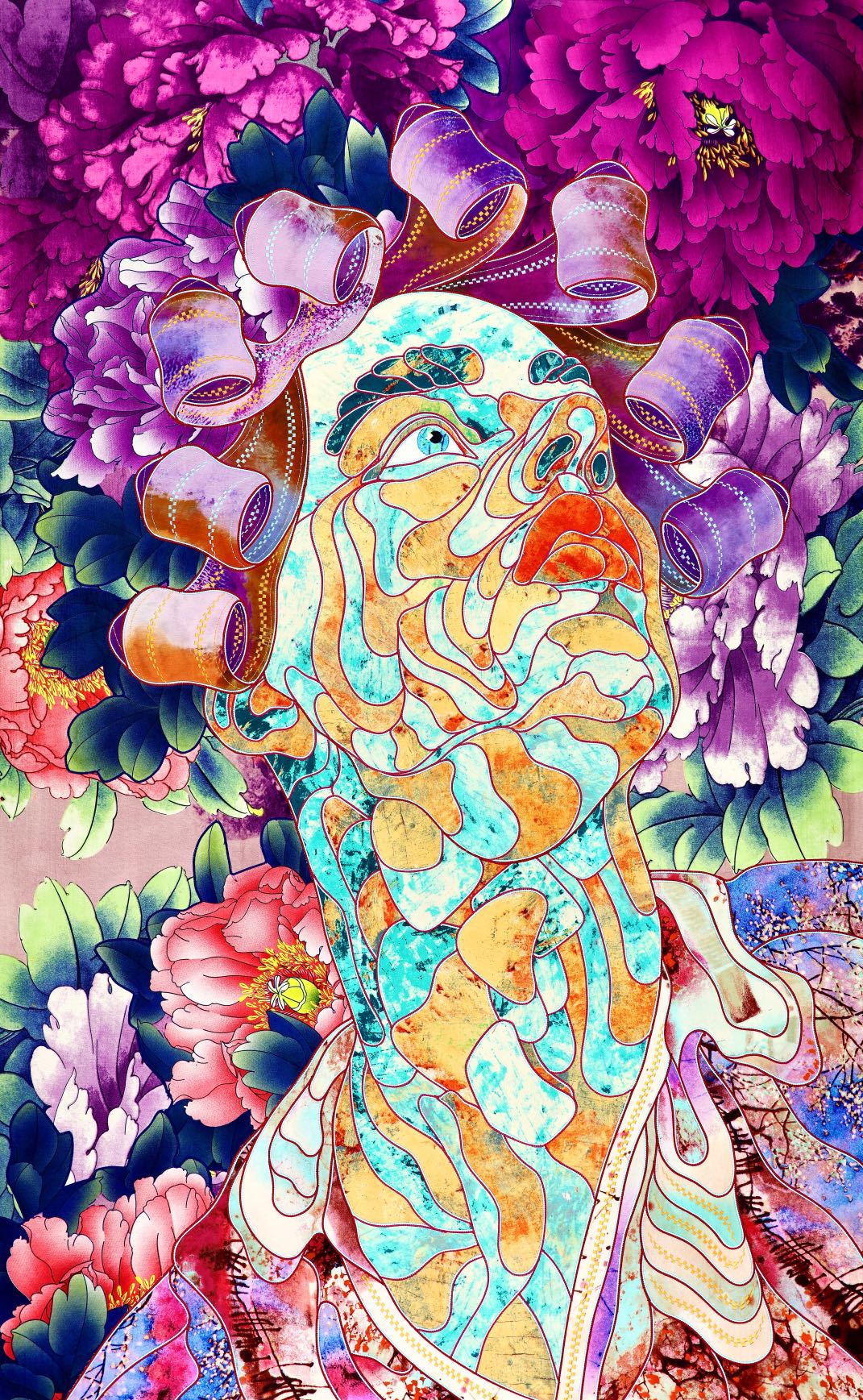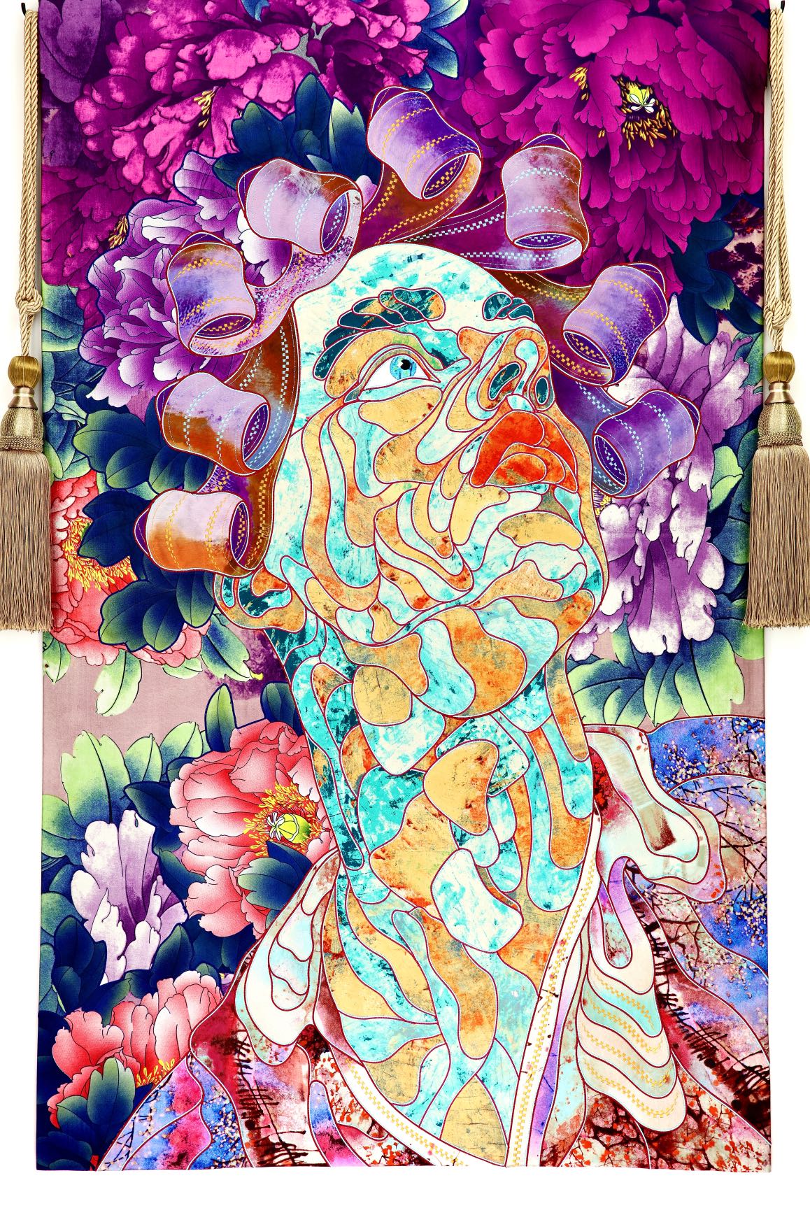 The artist is inspired by the works of Kinusaig. He developed and created a unique technique, the only one in the world in the field of textile art, combining original graphics and silk painting with factory paints of the highest class. This technology was developed using a special style of sewing. The work uses exclusive materials, silk, silk print and high-quality silk threads.
