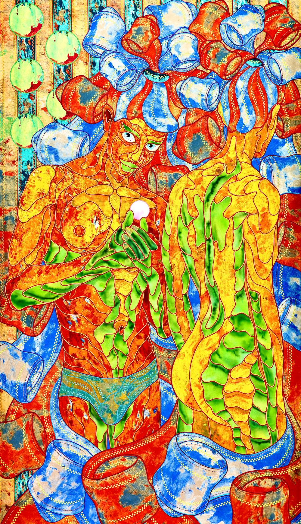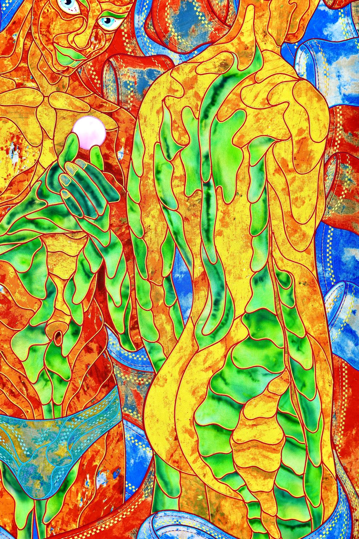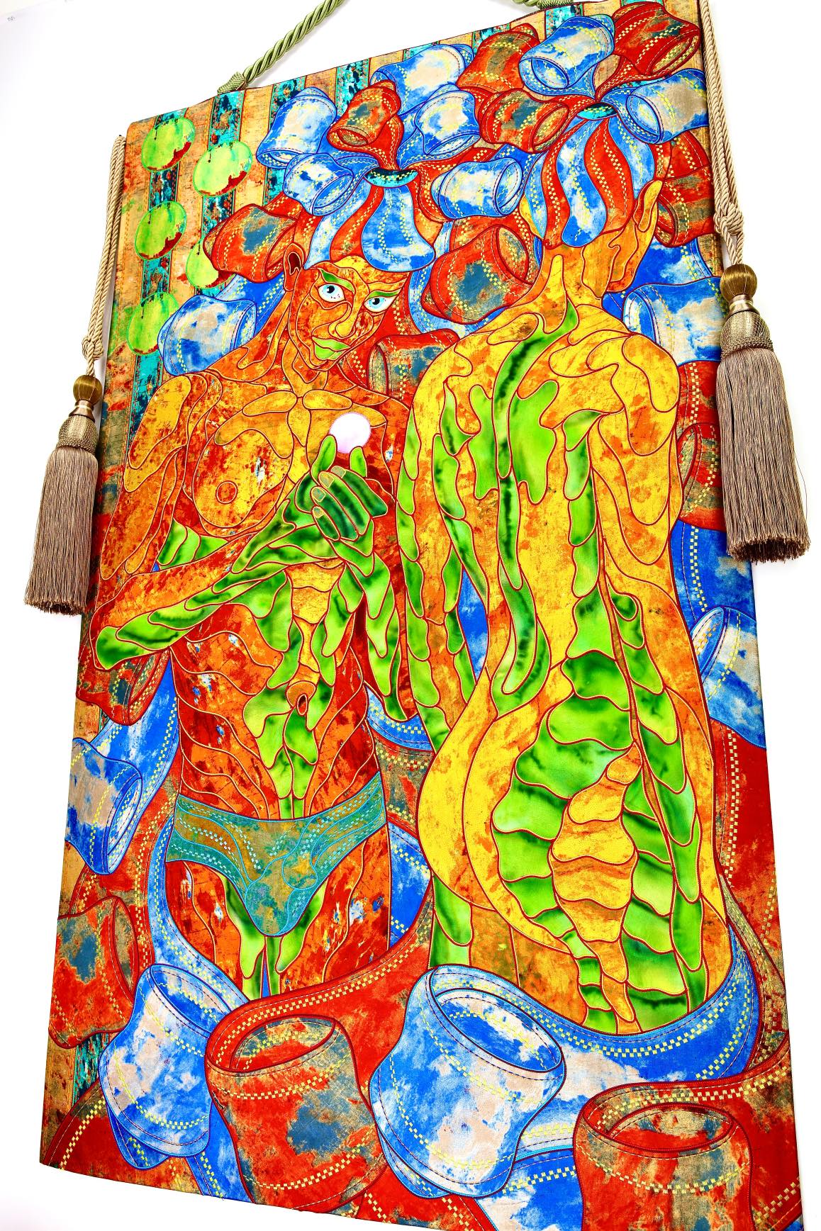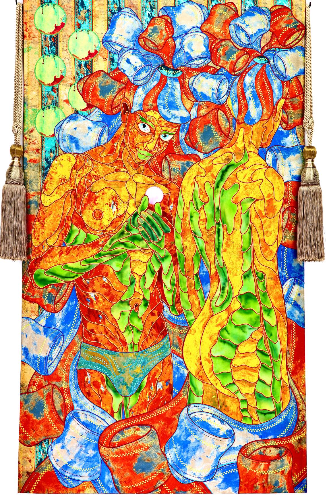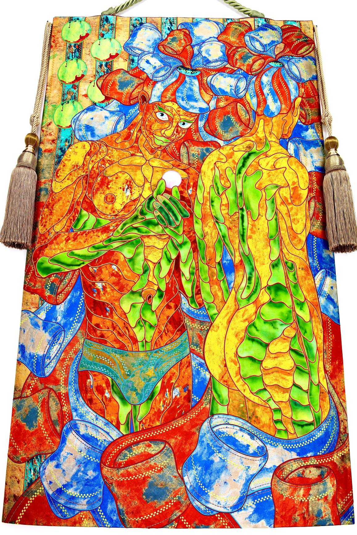 The artist is inspired by the works of Kinusaig. He developed and created a unique technique, the only one in the world in the field of textile art, combining original graphics and silk painting with factory paints of the highest class. This technology was developed using a special style of sewing. The work uses exclusive materials, silk, silk print and high-quality silk threads.