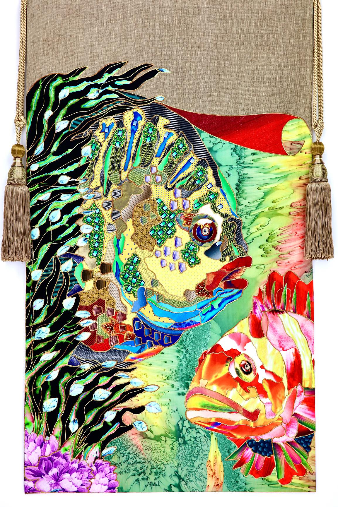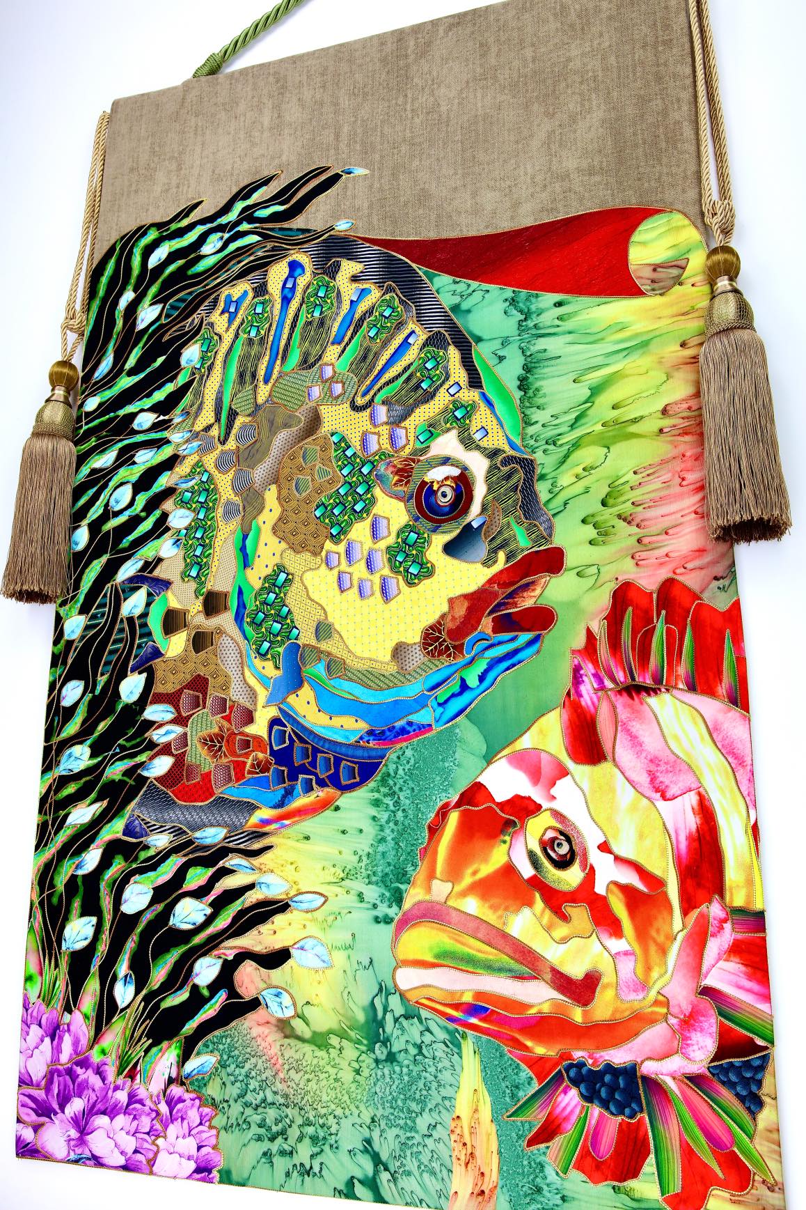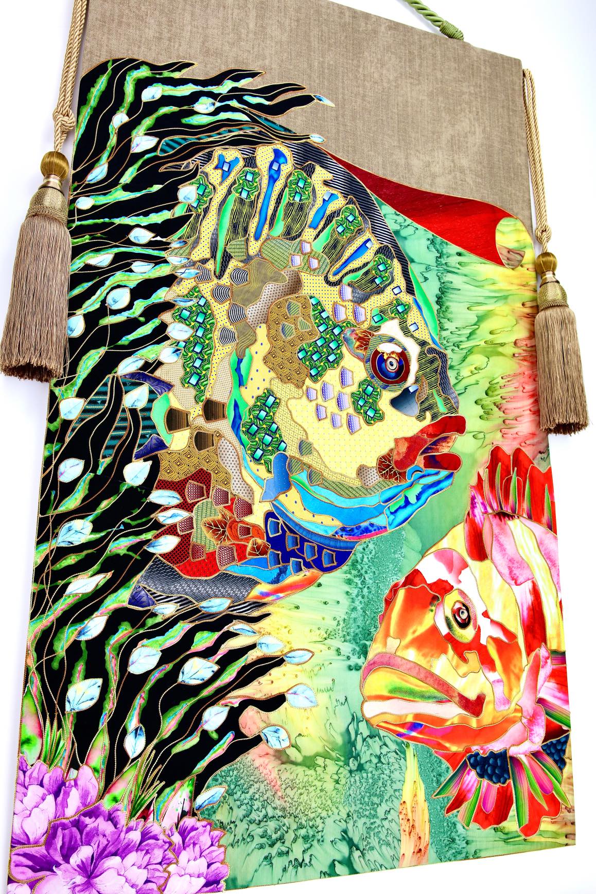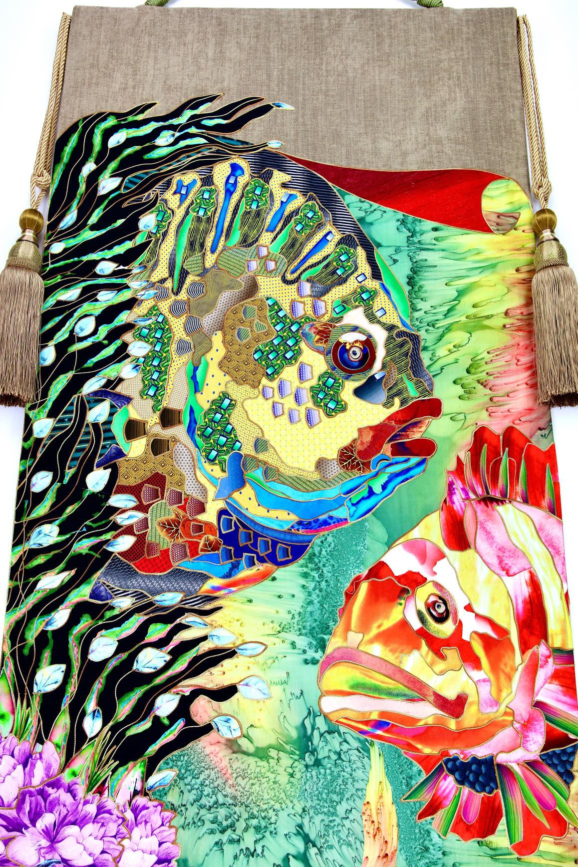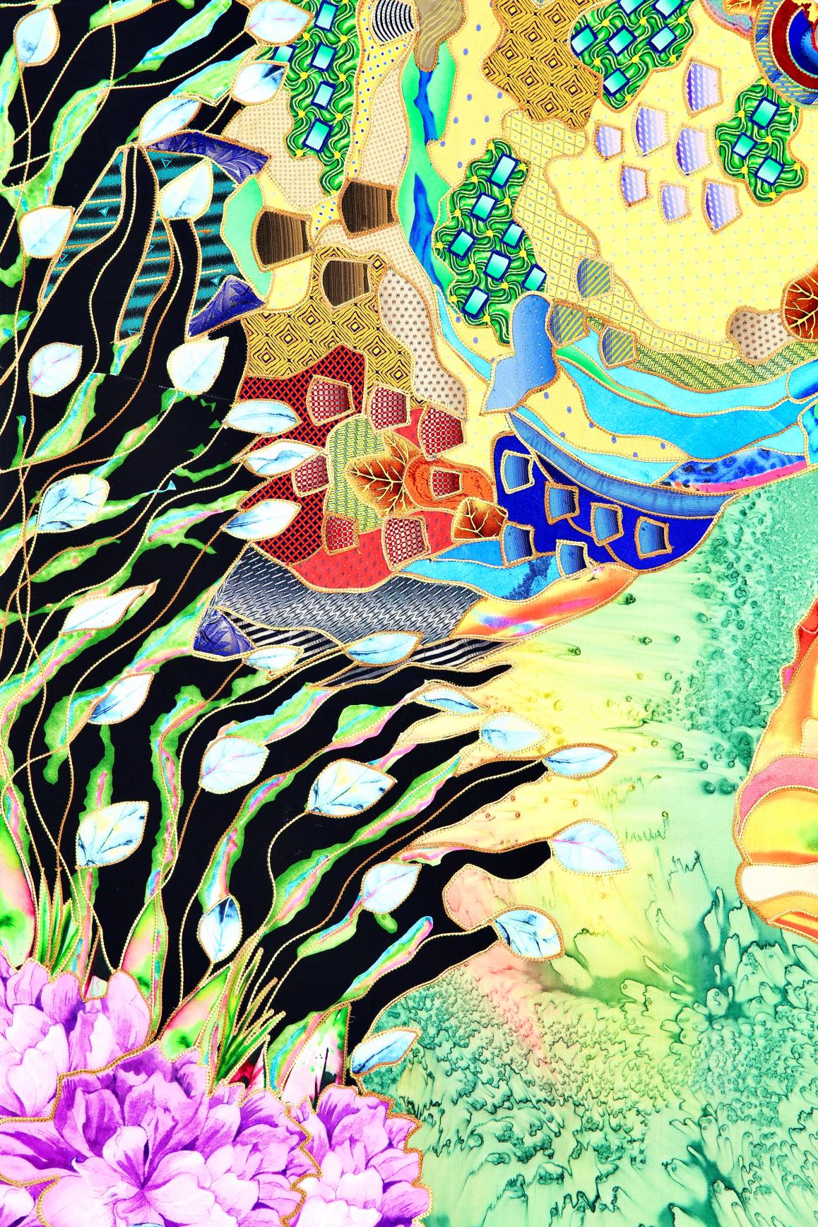 The artist is inspired by the works of Kinusaig. He developed and created a unique technique, the only one in the world in the field of textile art, combining original graphics and silk painting with factory paints of the highest class. This technology was developed using a special style of sewing. The work uses exclusive materials, silk, silk print and high-quality silk threads.