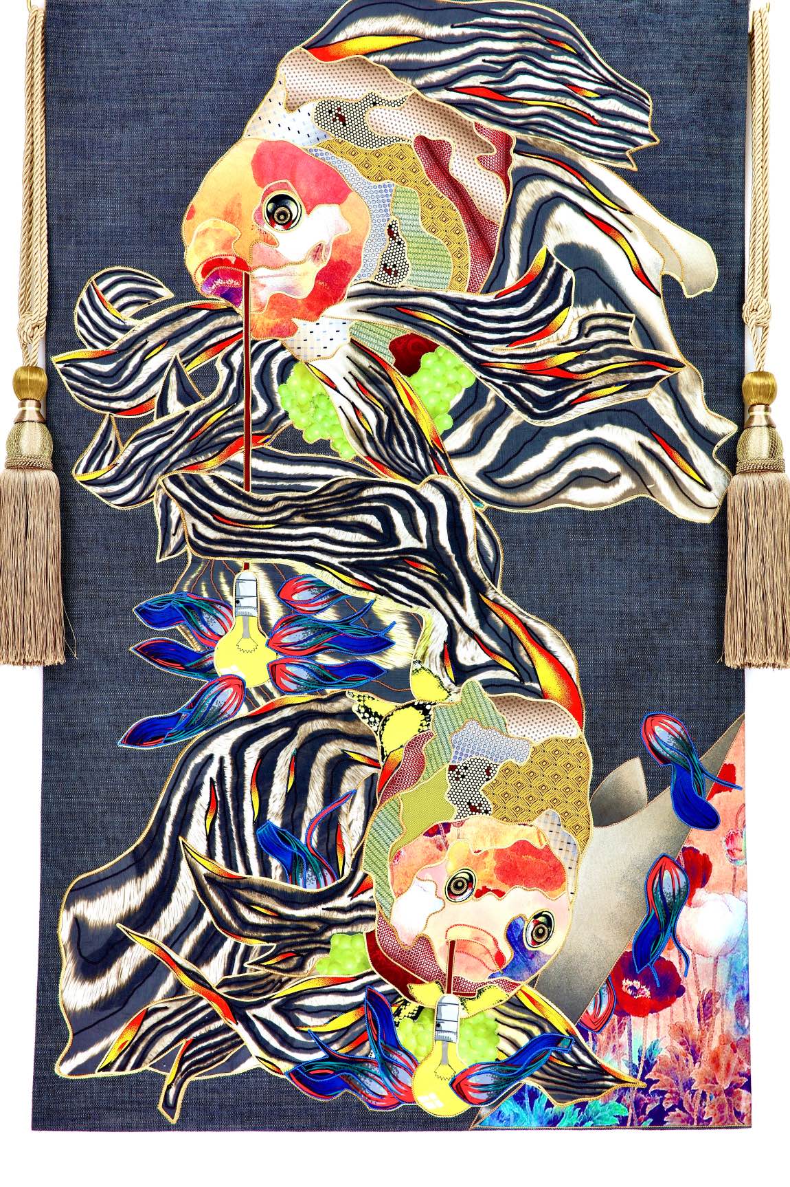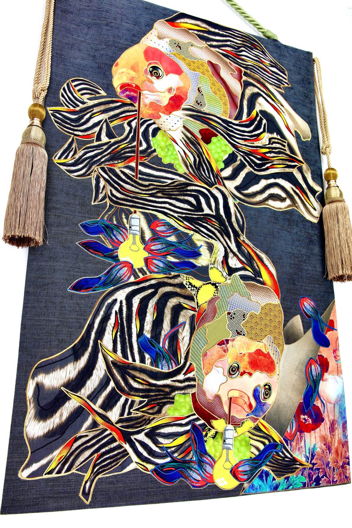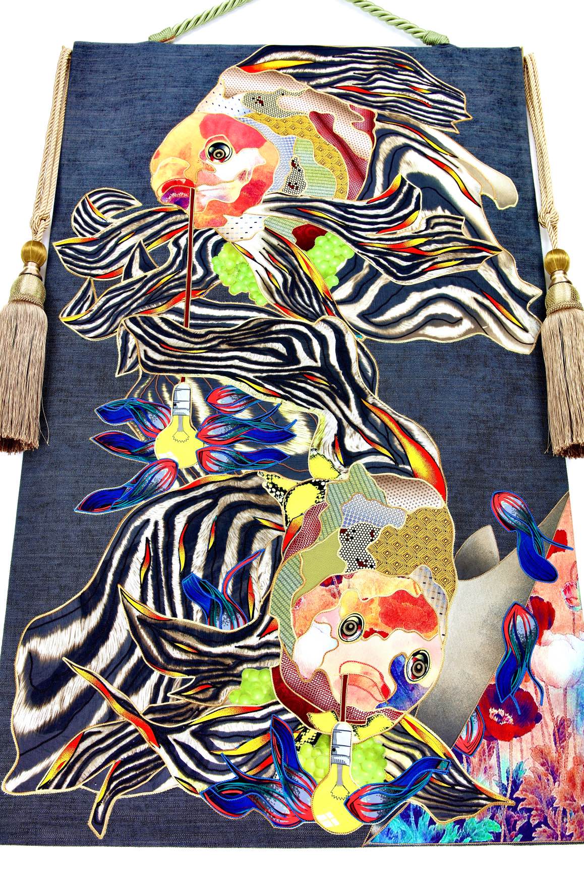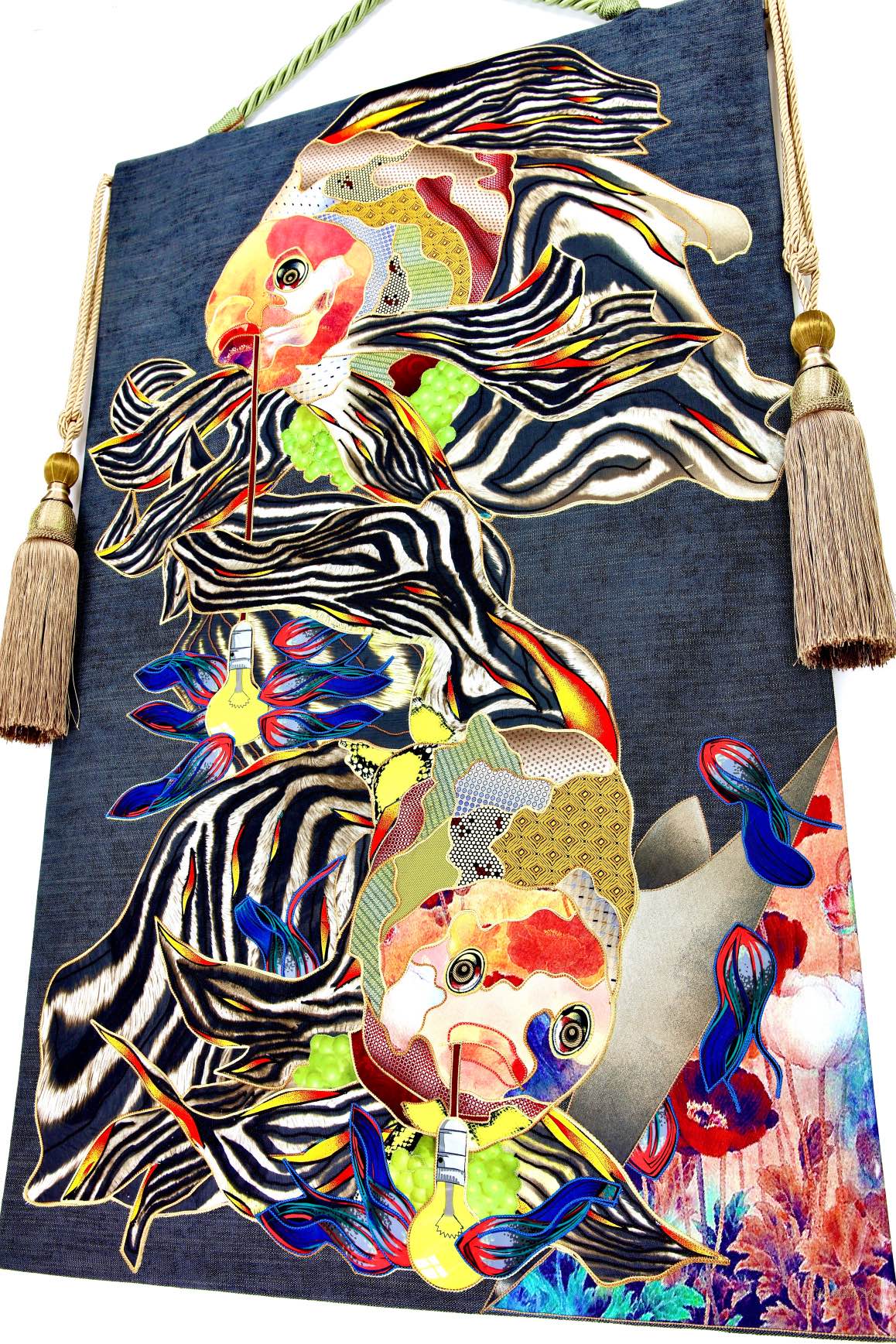 The artist is inspired by the works of Kinusaig. He developed and created a unique technique, the only one in the world in the field of textile art, combining original graphics and silk painting with factory paints of the highest class. This technology was developed using a special style of sewing. The work uses exclusive materials, silk, silk print and high-quality silk threads.