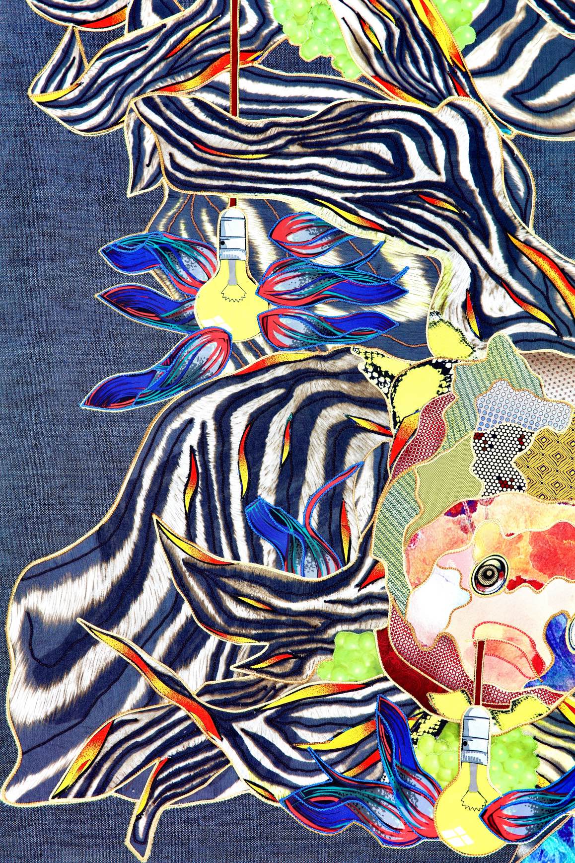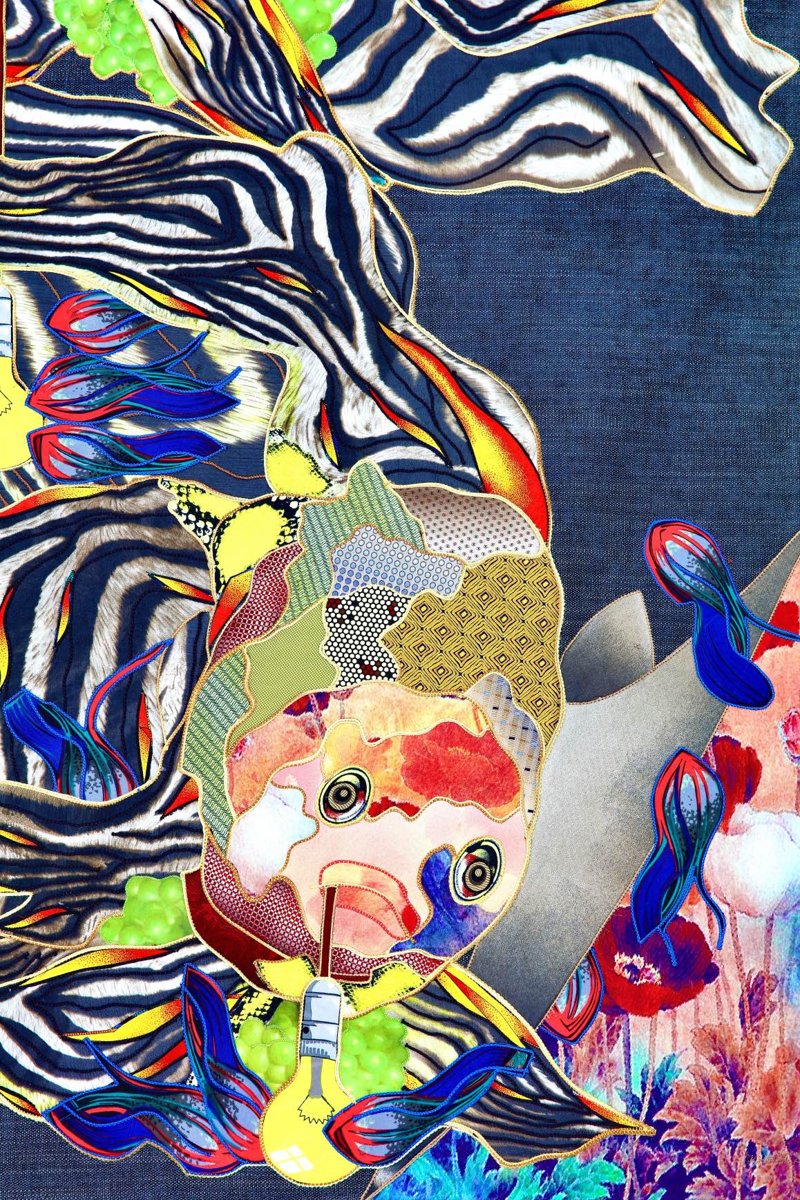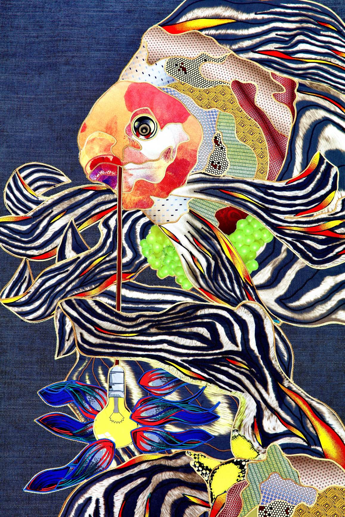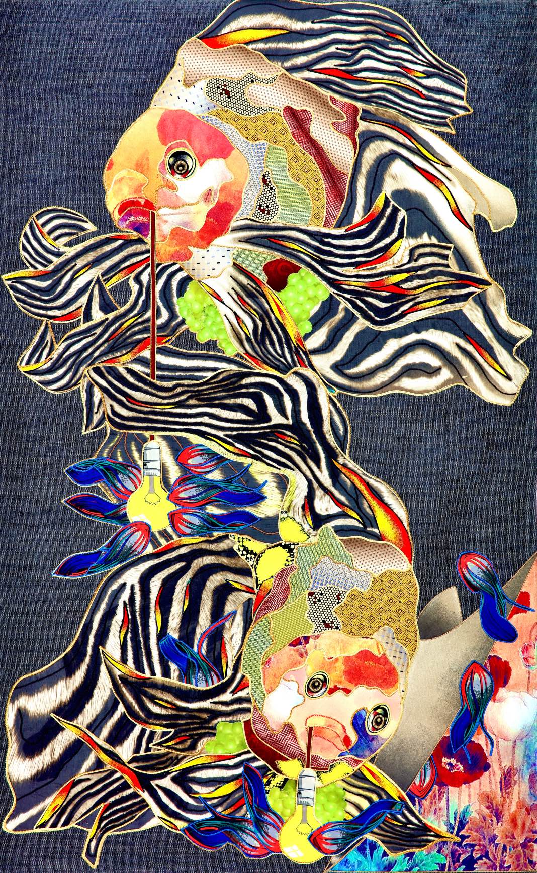 The artist is inspired by the works of Kinusaig. He developed and created a unique technique, the only one in the world in the field of textile art, combining original graphics and silk painting with factory paints of the highest class. This technology was developed using a special style of sewing. The work uses exclusive materials, silk, silk print and high-quality silk threads.