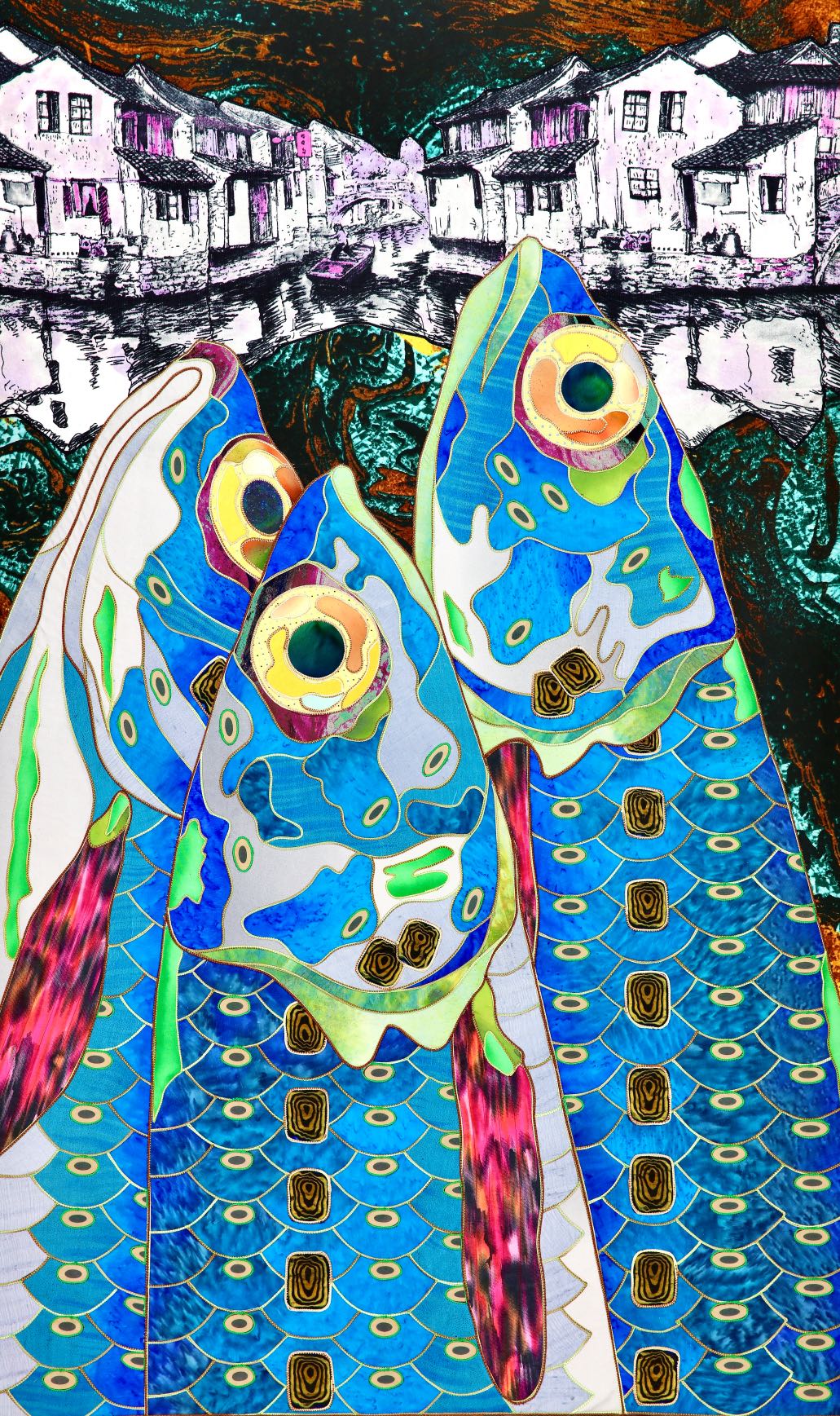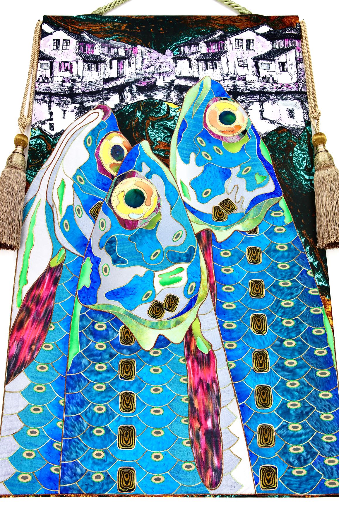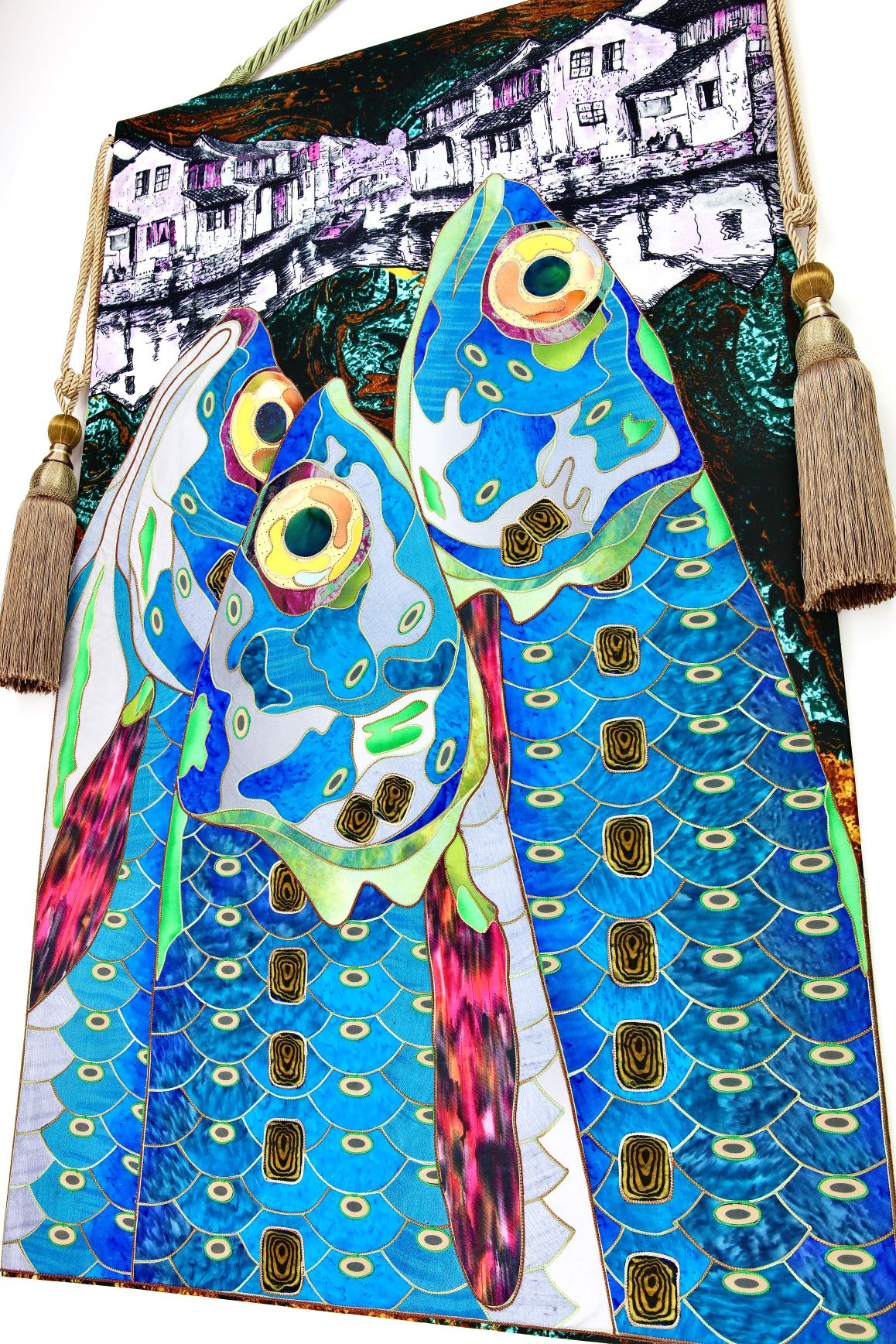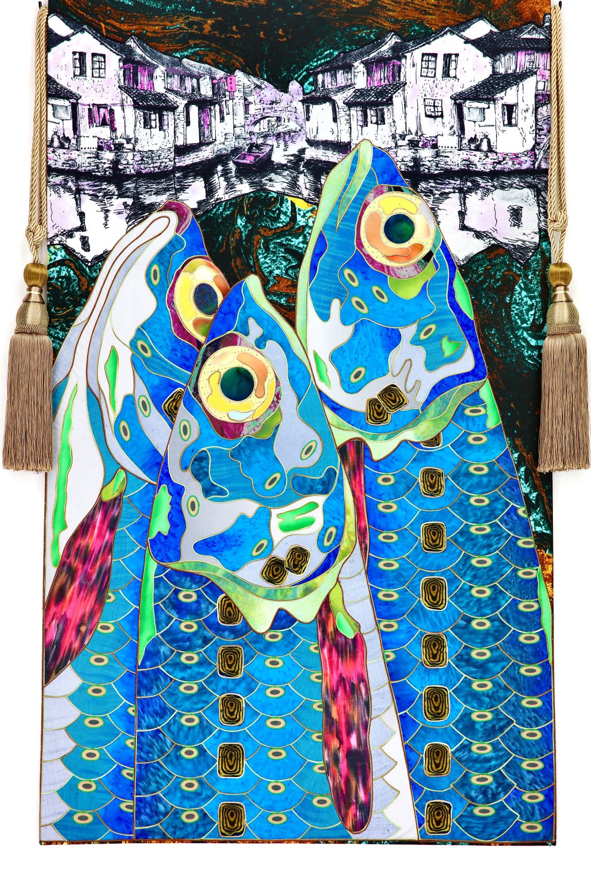 The artist is inspired by the works of Kinusaig. He developed and created a unique technique, the only one in the world in the field of textile art, combining original graphics and silk painting with factory paints of the highest class. This technology was developed using a special style of sewing. The work uses exclusive materials, silk, silk print and high-quality silk threads.