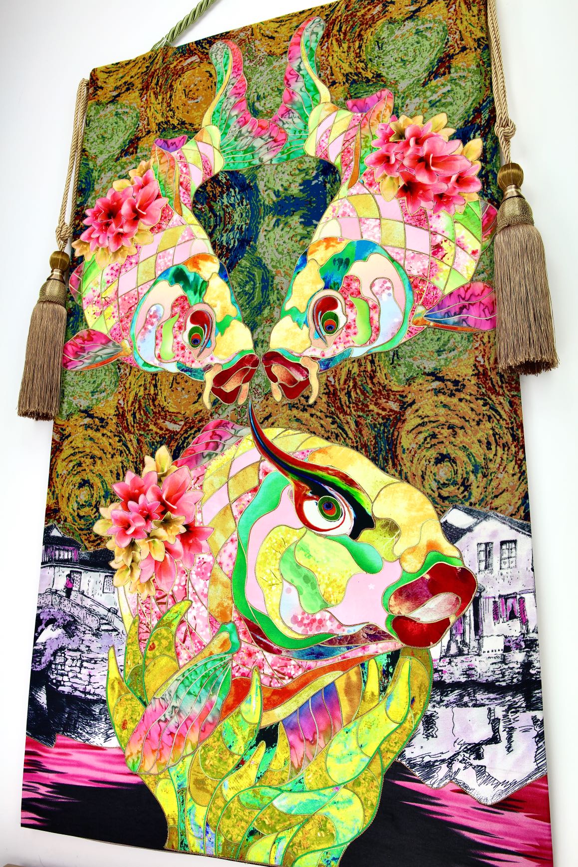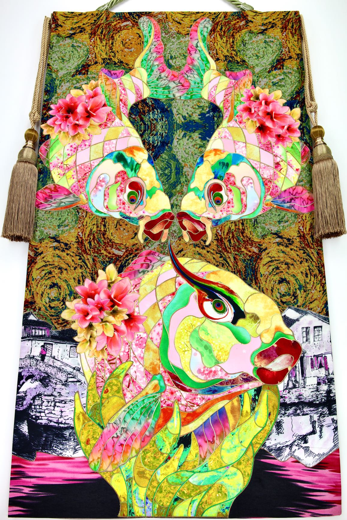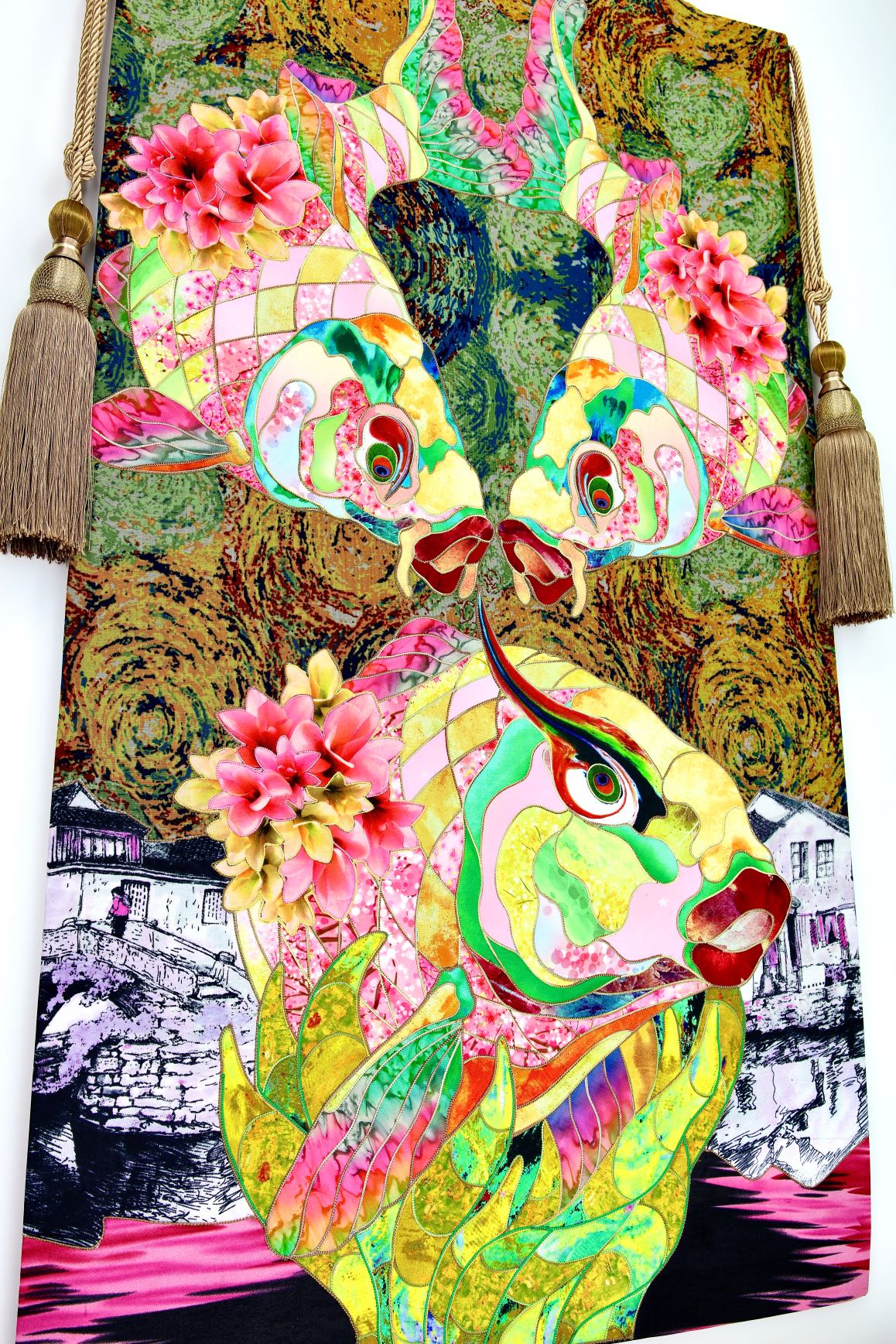 The artist is inspired by the works of Kinusaig. He developed and created a unique technique, the only one in the world in the field of textile art, combining original graphics and silk painting with factory paints of the highest class. This technology was developed using a special style of sewing. The work uses exclusive materials, silk, silk print and high-quality silk threads.