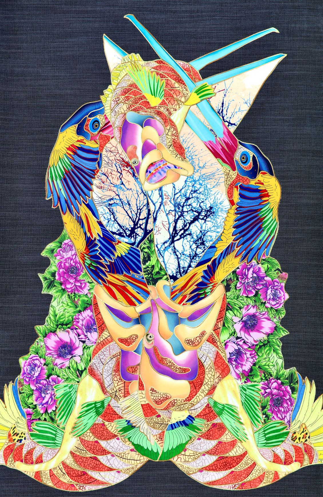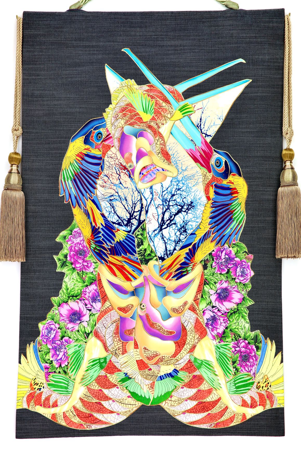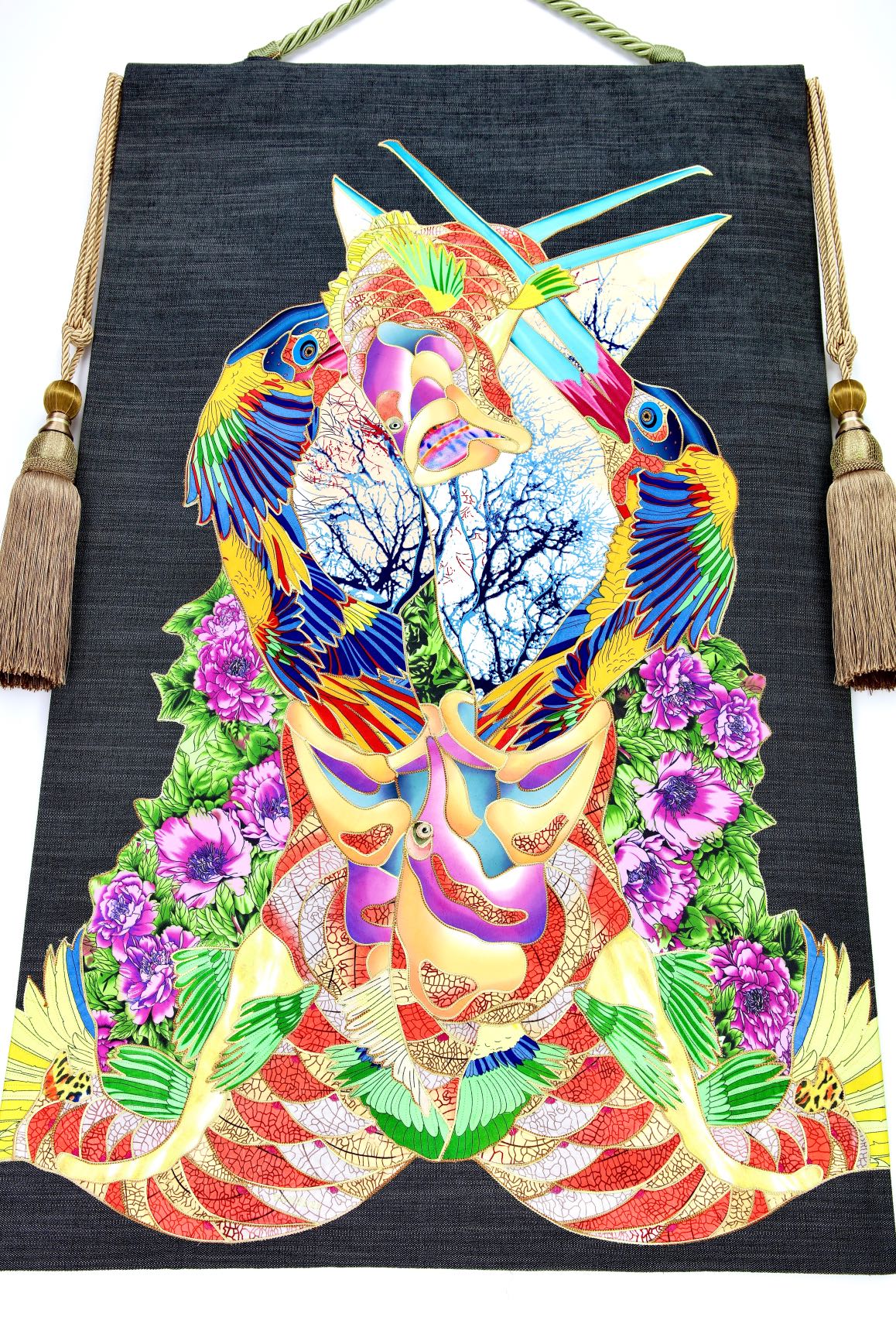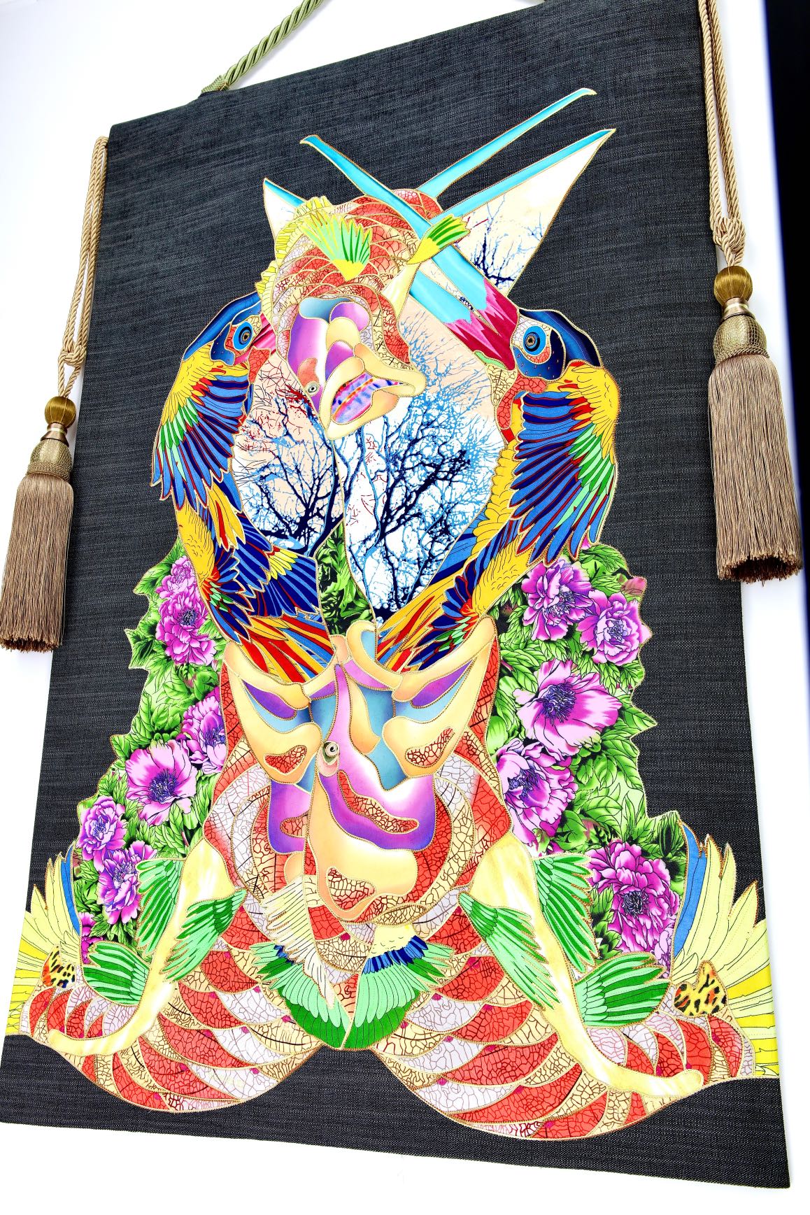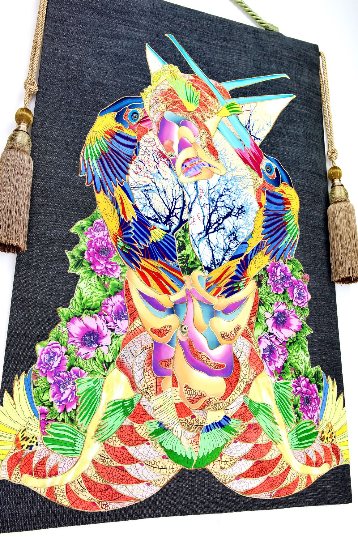 The artist is inspired by the works of Kinusaig. He developed and created a unique technique, the only one in the world in the field of textile art, combining original graphics and silk painting with factory paints of the highest class. This technology was developed using a special style of sewing. The work uses exclusive materials, silk, silk print and high-quality silk threads.