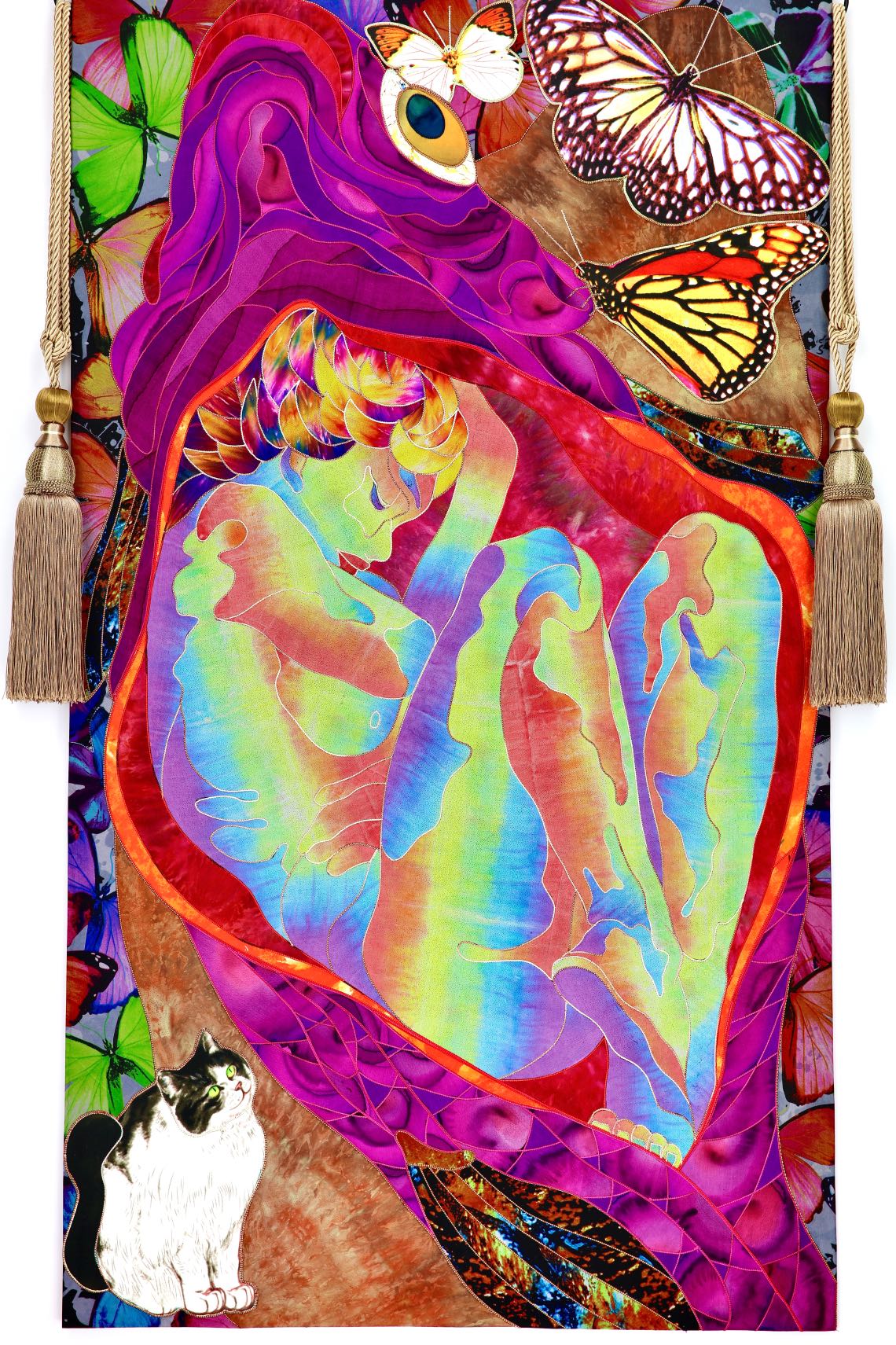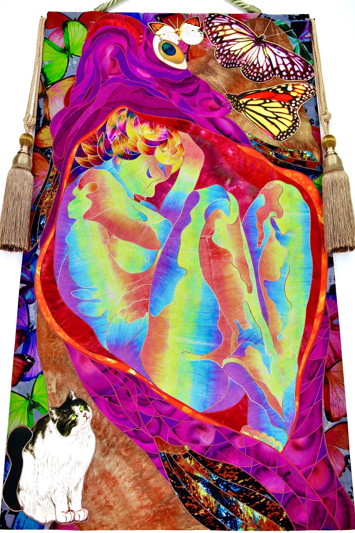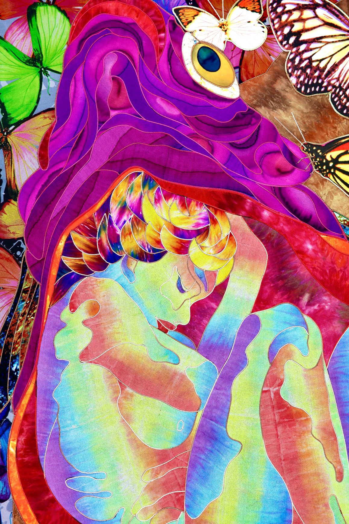The artist is inspired by the works of Kinusaig. He developed and created a unique technique, the only one in the world in the field of textile art, combining original graphics and silk painting with factory paints of the highest class. This technology was developed using a special style of sewing. The work uses exclusive materials, silk, silk print and high-quality silk threads.