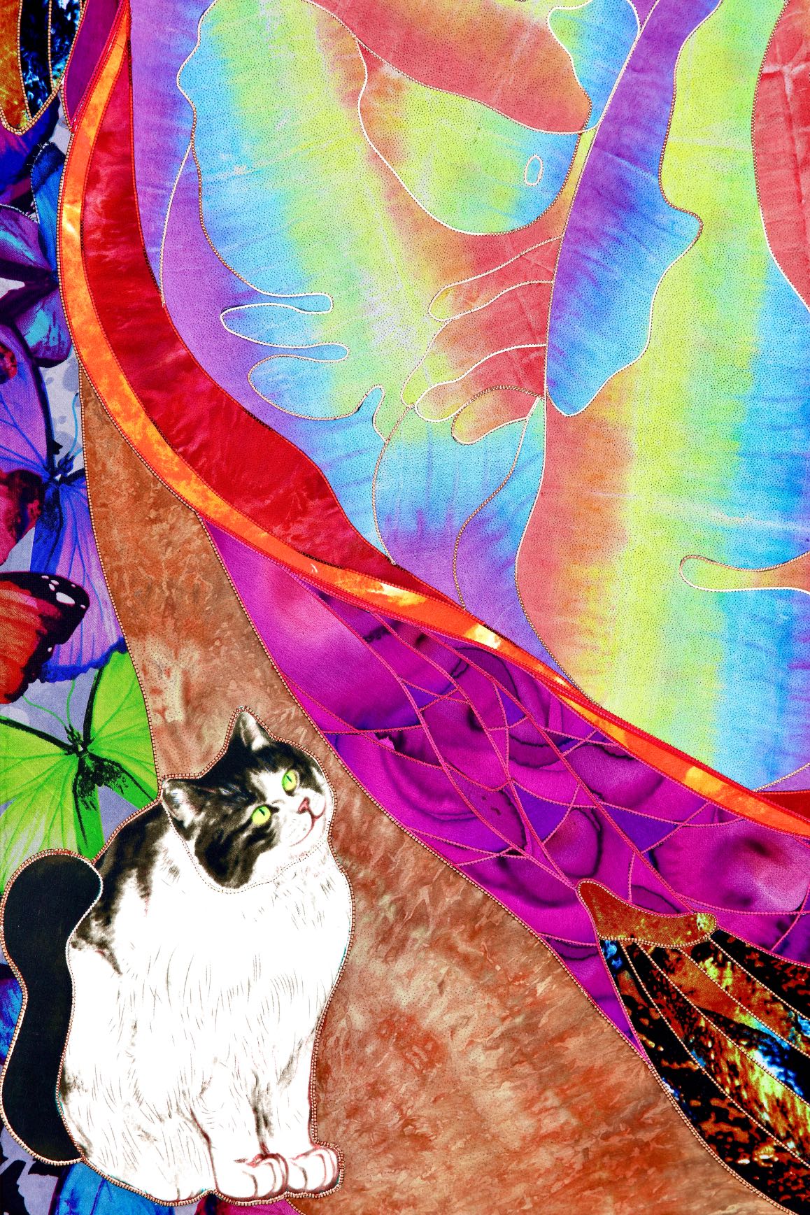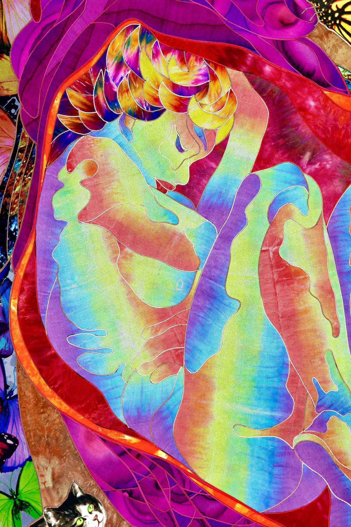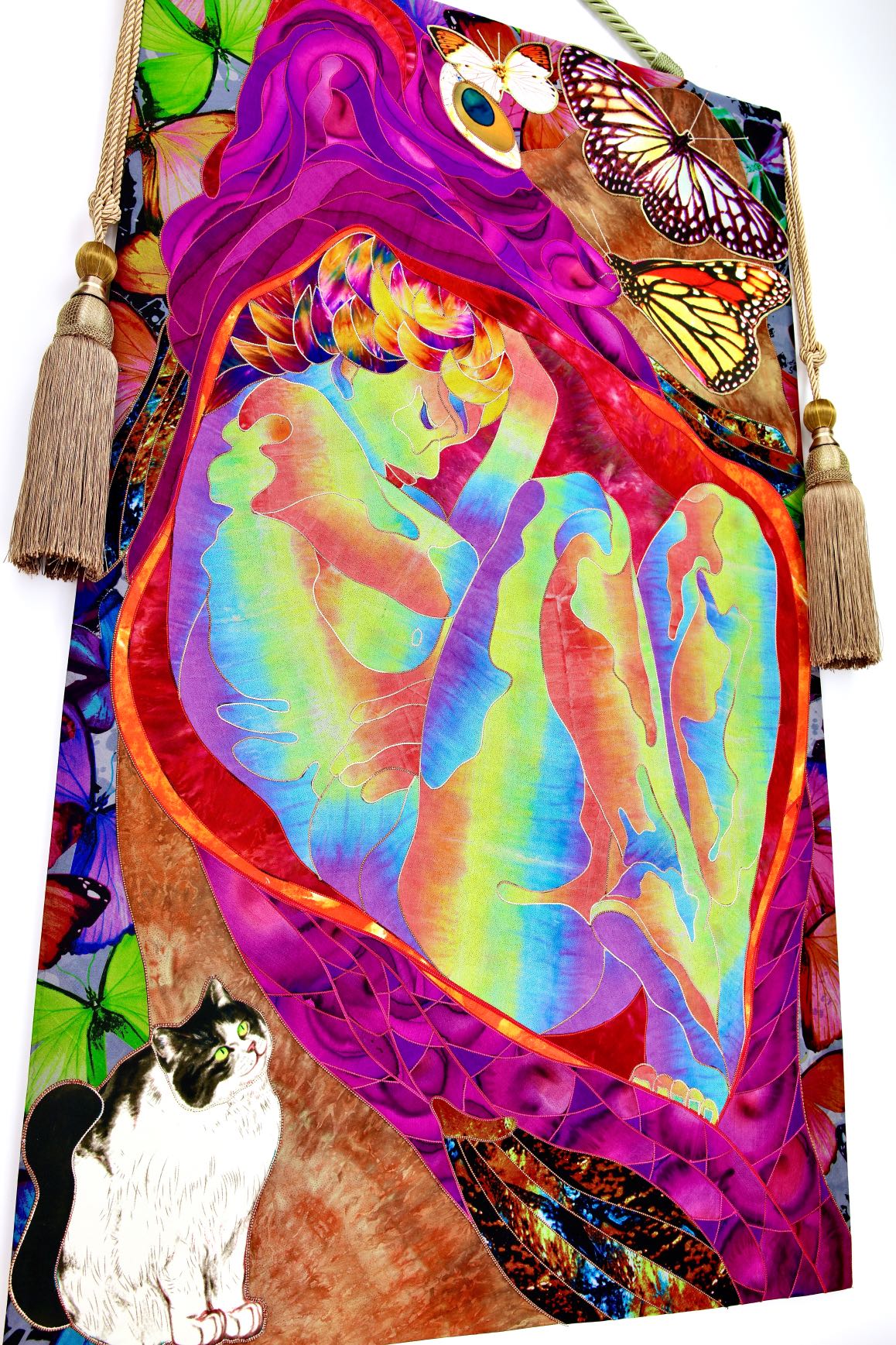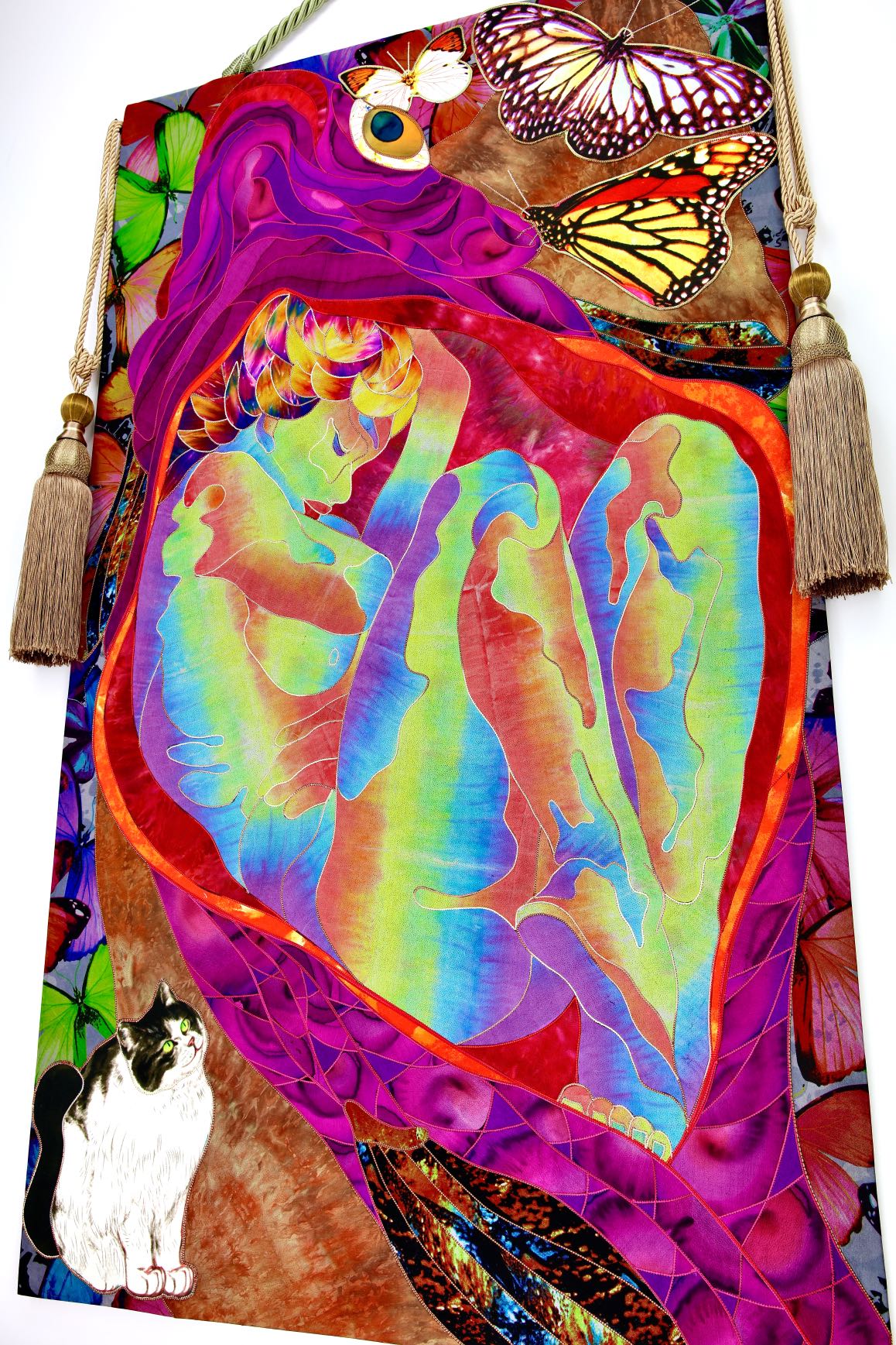 The artist is inspired by the works of Kinusaig. He developed and created a unique technique, the only one in the world in the field of textile art, combining original graphics and silk painting with factory paints of the highest class. This technology was developed using a special style of sewing. The work uses exclusive materials, silk, silk print and high-quality silk threads.