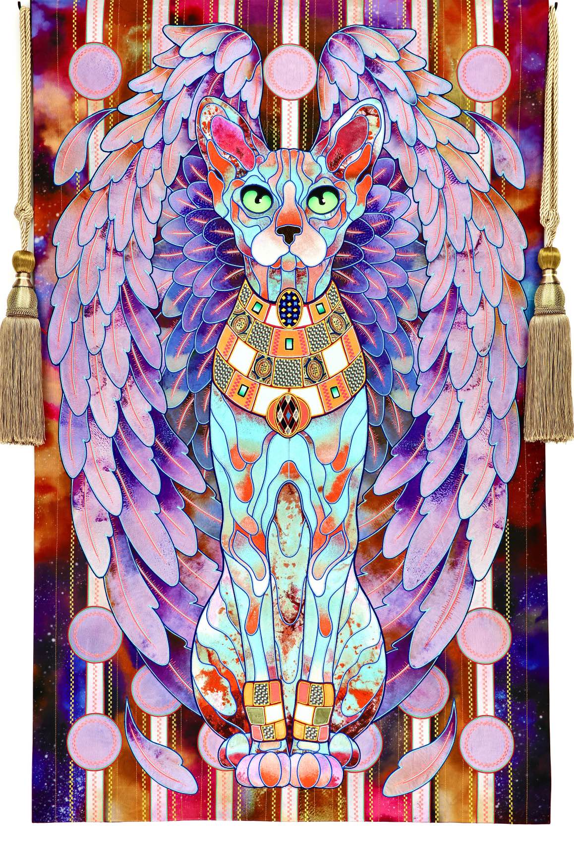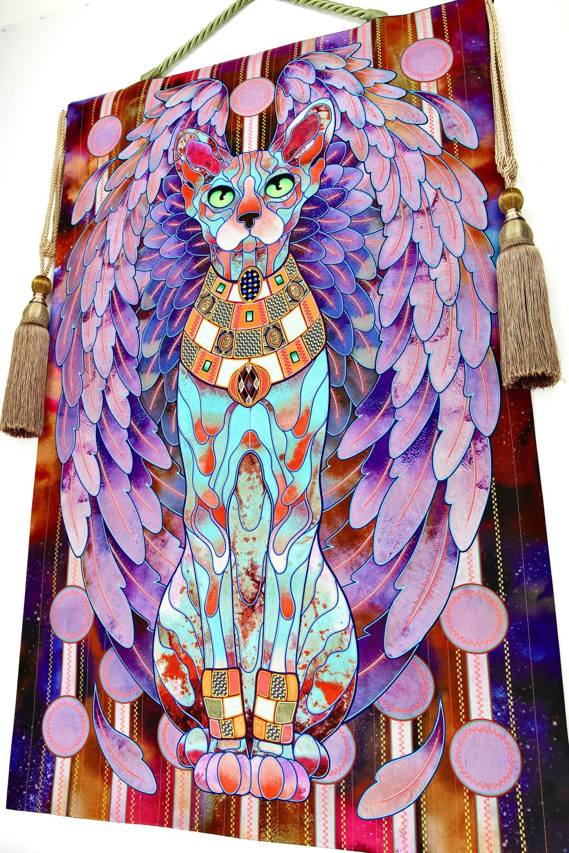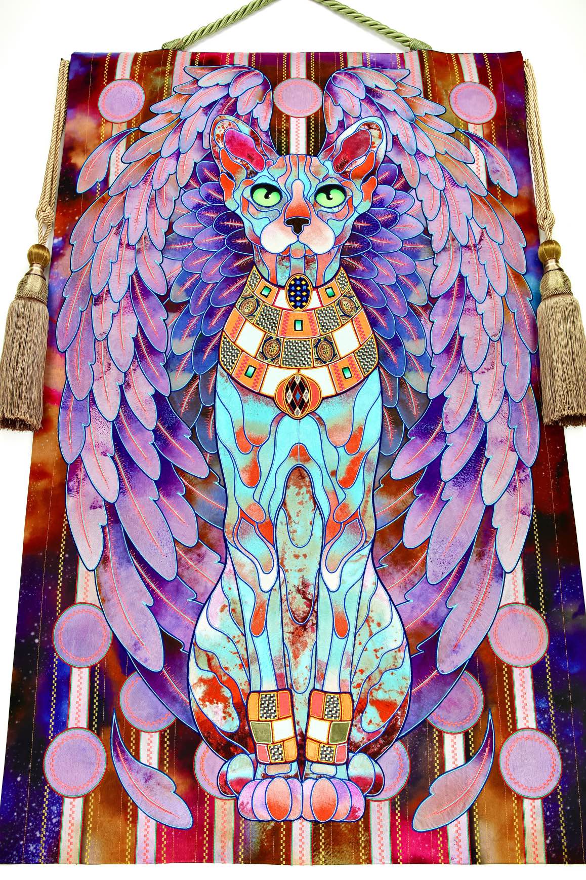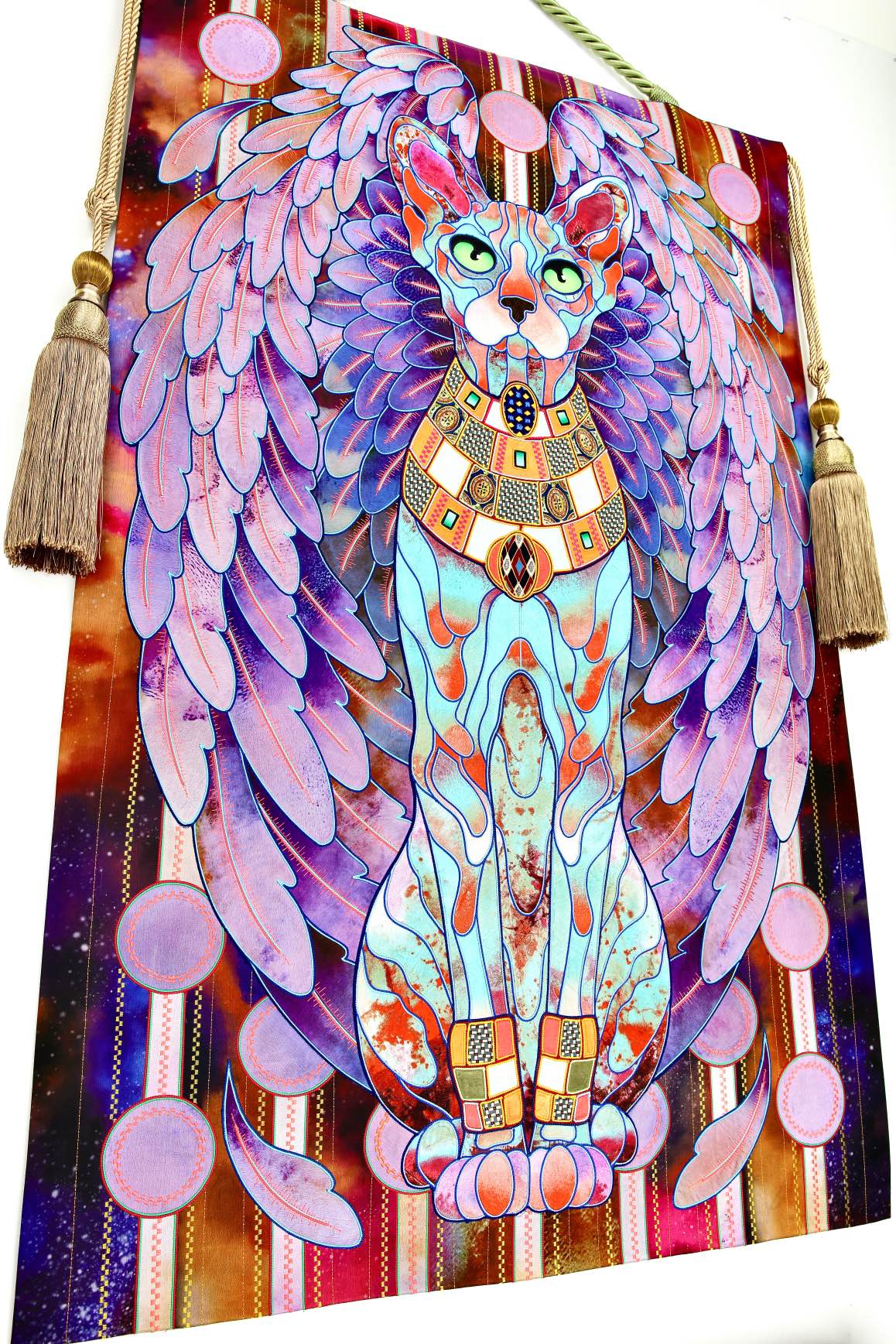 The artist is inspired by the works of Kinusaig. He developed and created a unique technique, the only one in the world in the field of textile art, combining original graphics and silk painting with factory paints of the highest class. This technology was developed using a special style of sewing. The work uses exclusive materials, silk, silk print and high-quality silk threads.
