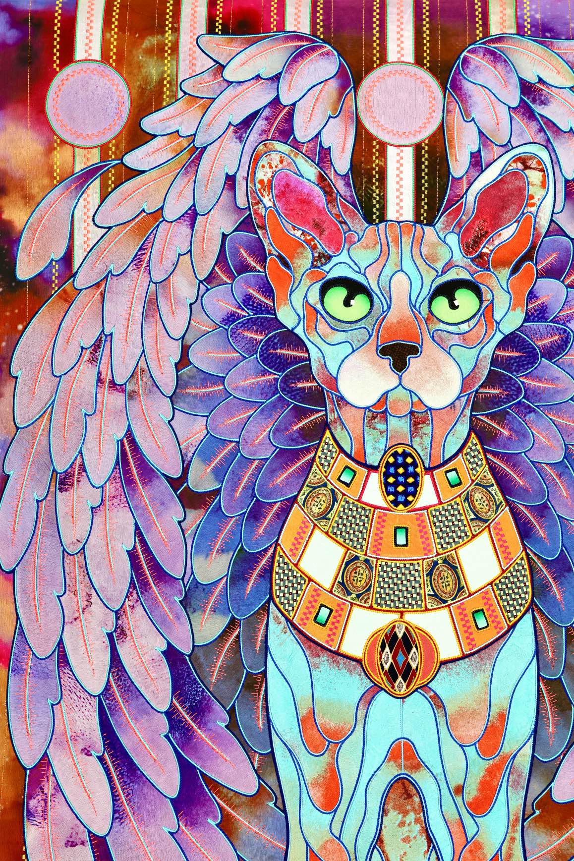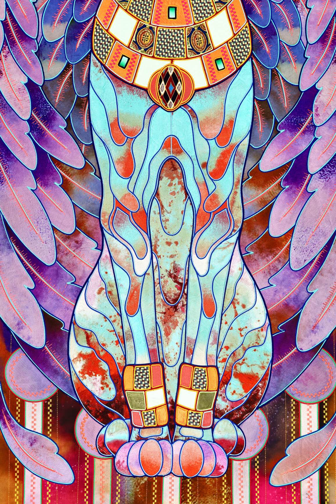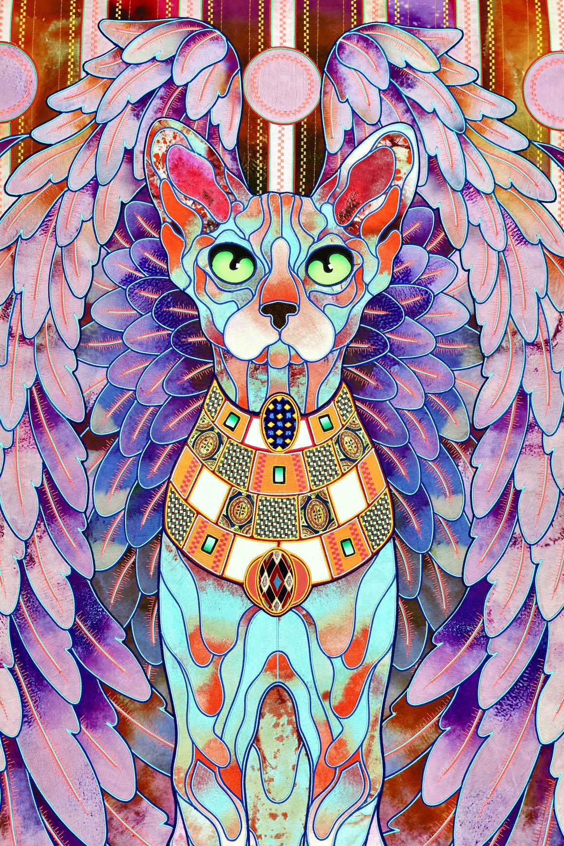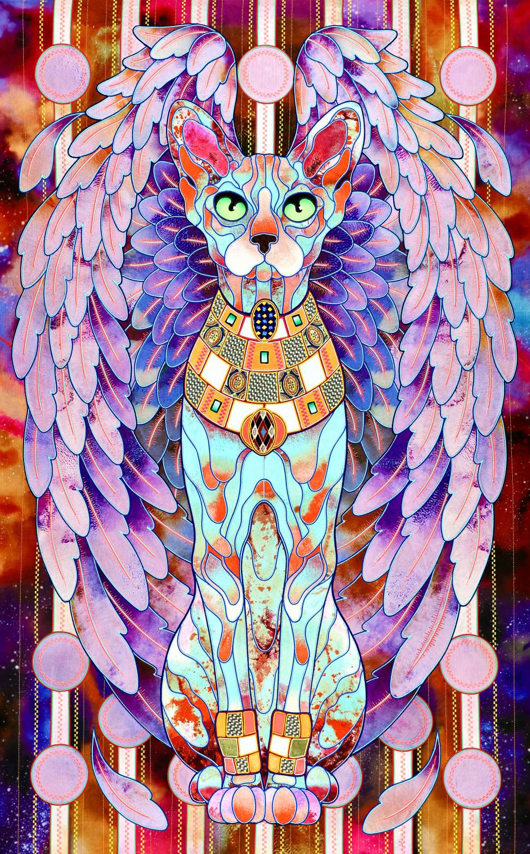 The artist is inspired by the works of Kinusaig. He developed and created a unique technique, the only one in the world in the field of textile art, combining original graphics and silk painting with factory paints of the highest class. This technology was developed using a special style of sewing. The work uses exclusive materials, silk, silk print and high-quality silk threads.