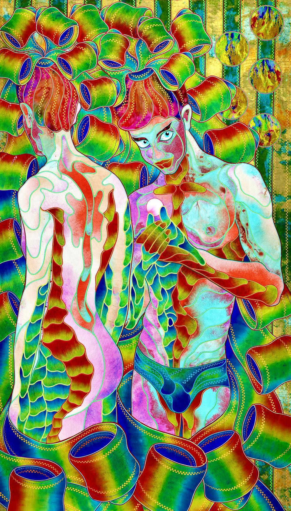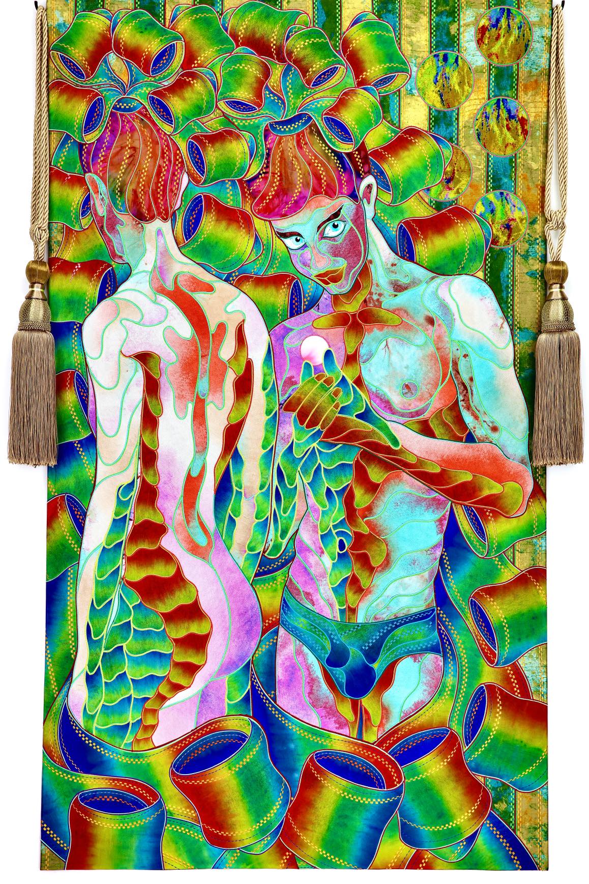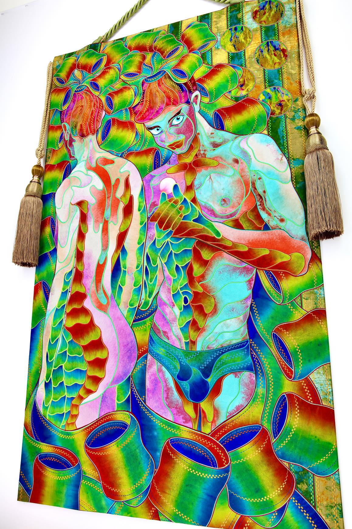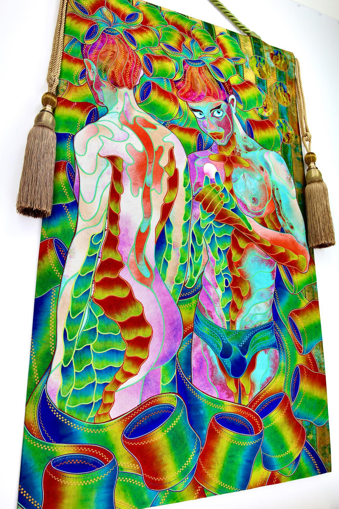The artist is inspired by the works of Kinusaig. He developed and created a unique technique, the only one in the world in the field of textile art, combining original graphics and silk painting with factory paints of the highest class. This technology was developed using a special style of sewing. The work uses exclusive materials, silk, silk print and high-quality silk threads.