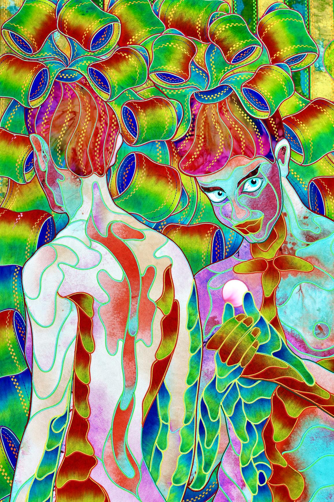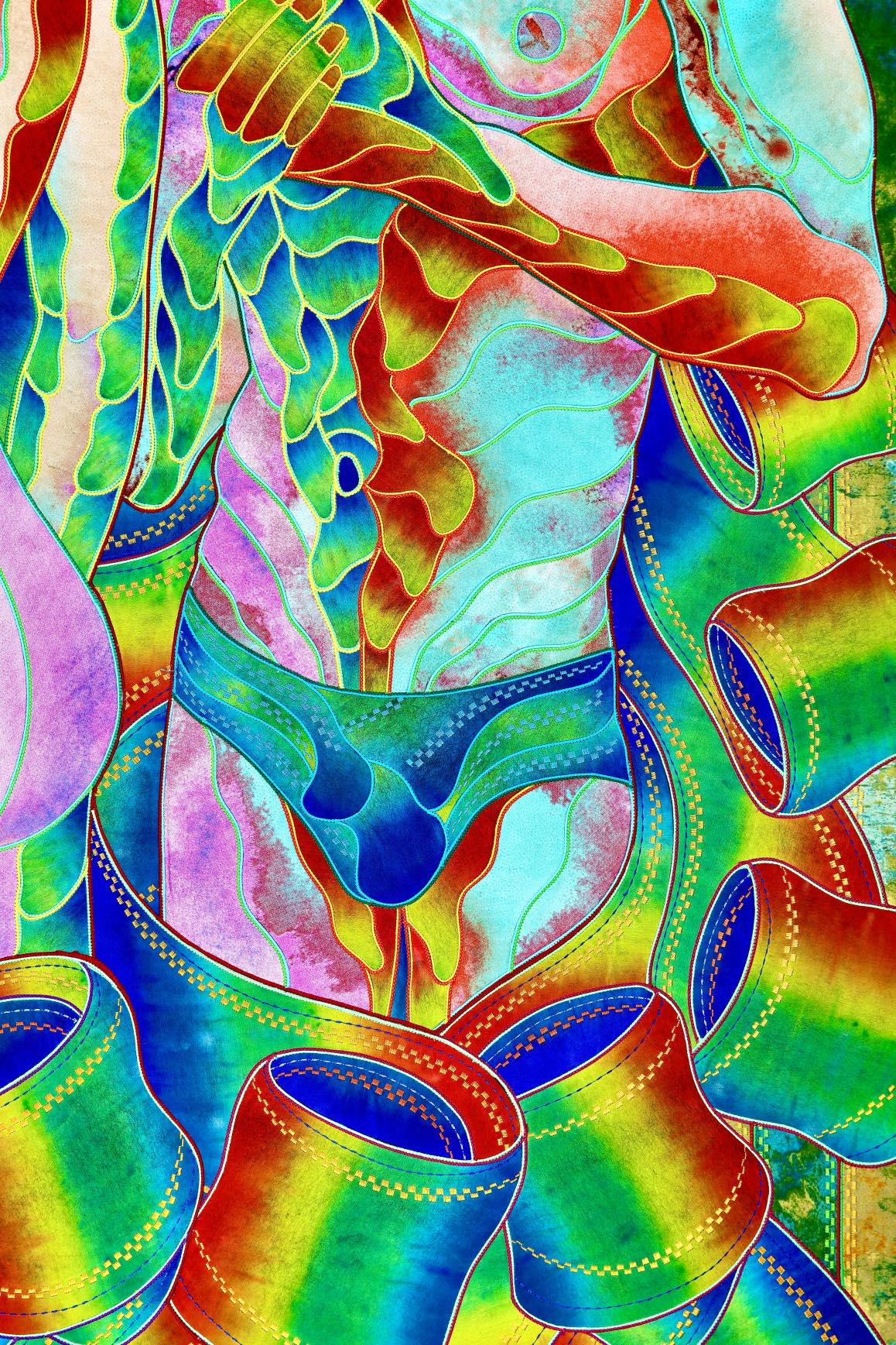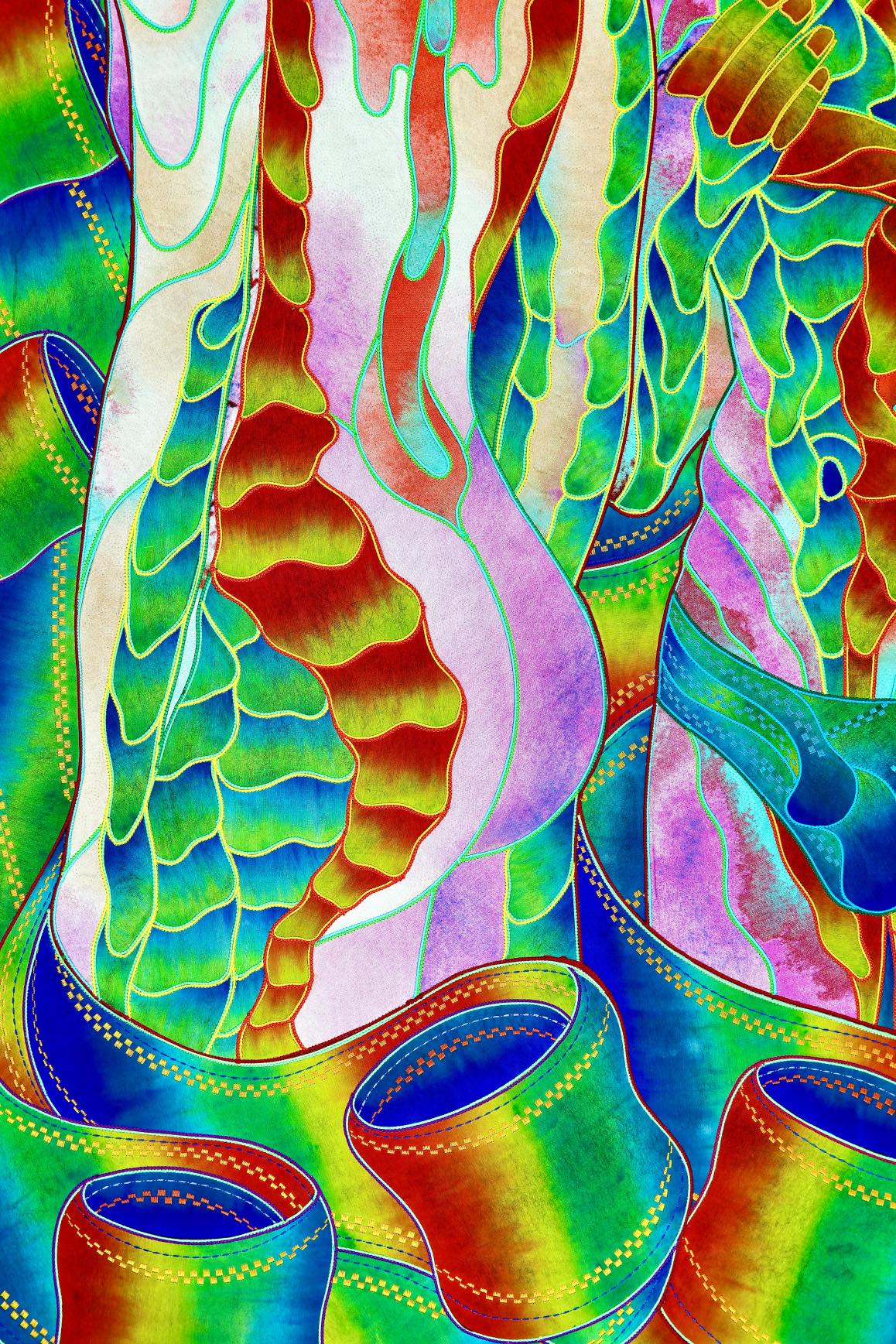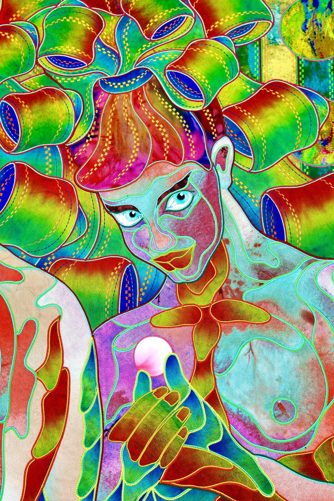 The artist is inspired by the works of Kinusaig. He developed and created a unique technique, the only one in the world in the field of textile art, combining original graphics and silk painting with factory paints of the highest class. This technology was developed using a special style of sewing. The work uses exclusive materials, silk, silk print and high-quality silk threads.