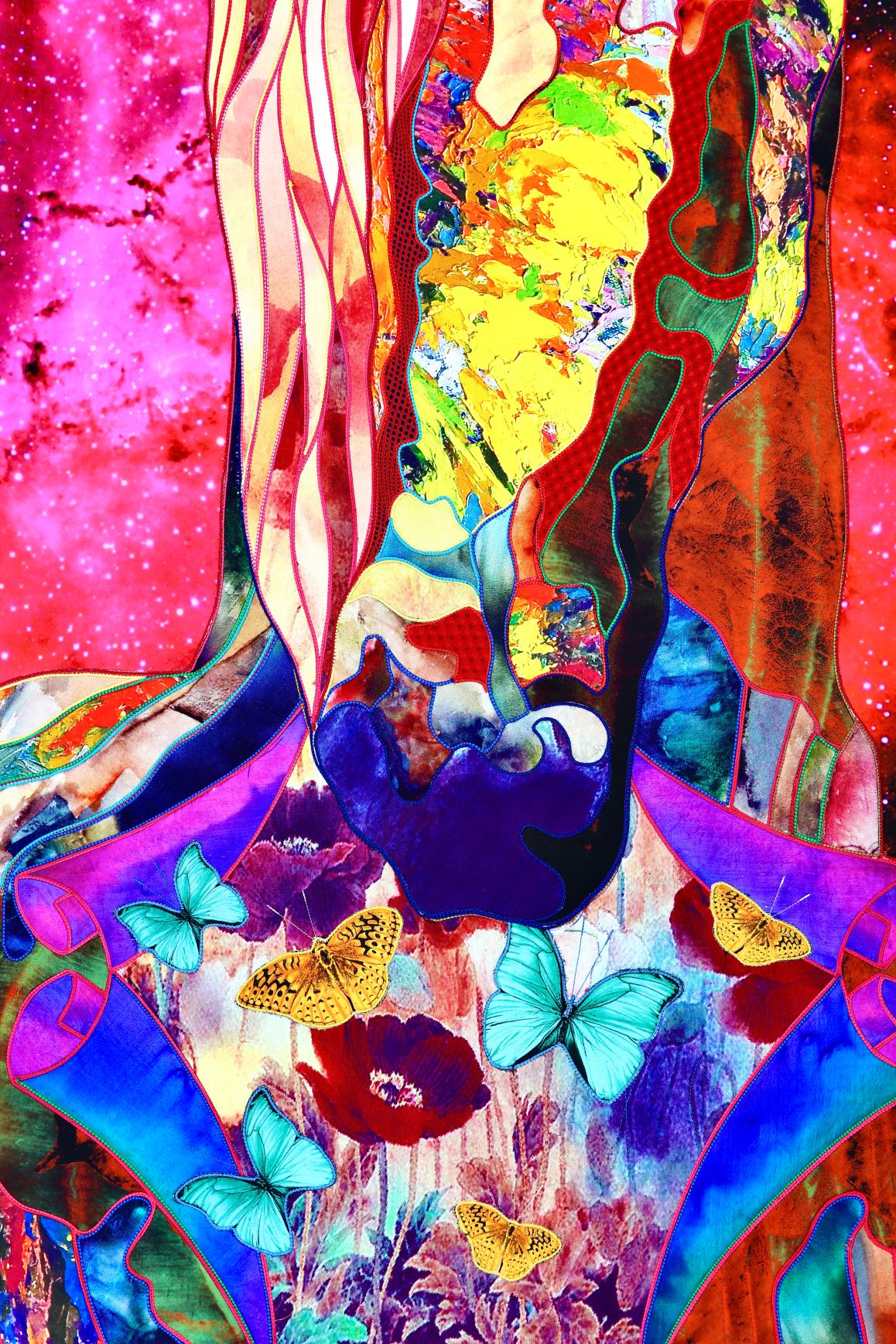 The artist is inspired by the works of Kinusaig. He developed and created a unique technique, the only one in the world in the field of textile art, combining original graphics and silk painting with factory paints of the highest class. This technology was developed using a special style of sewing. The work uses exclusive materials, silk, silk print and high-quality silk threads.