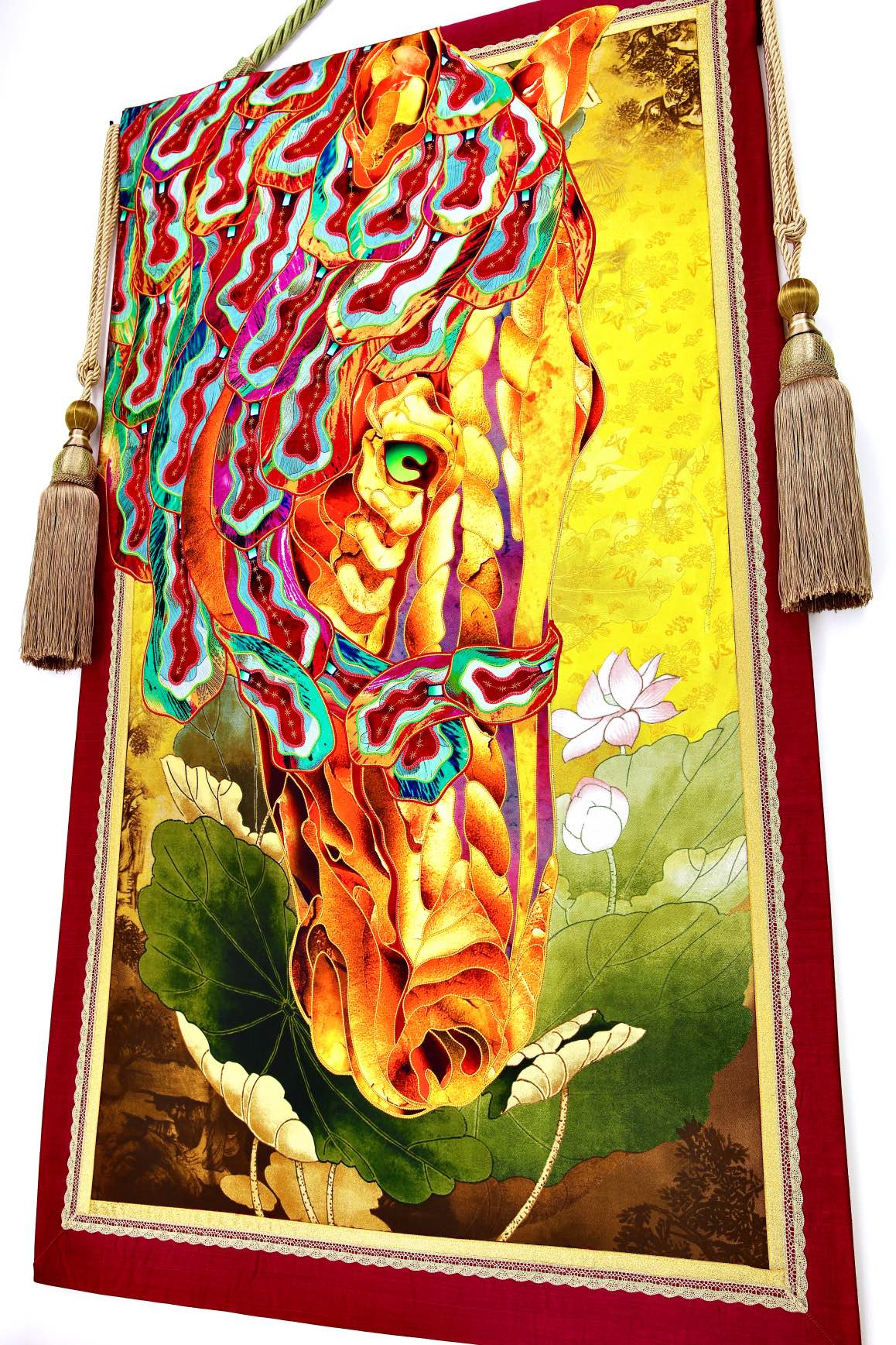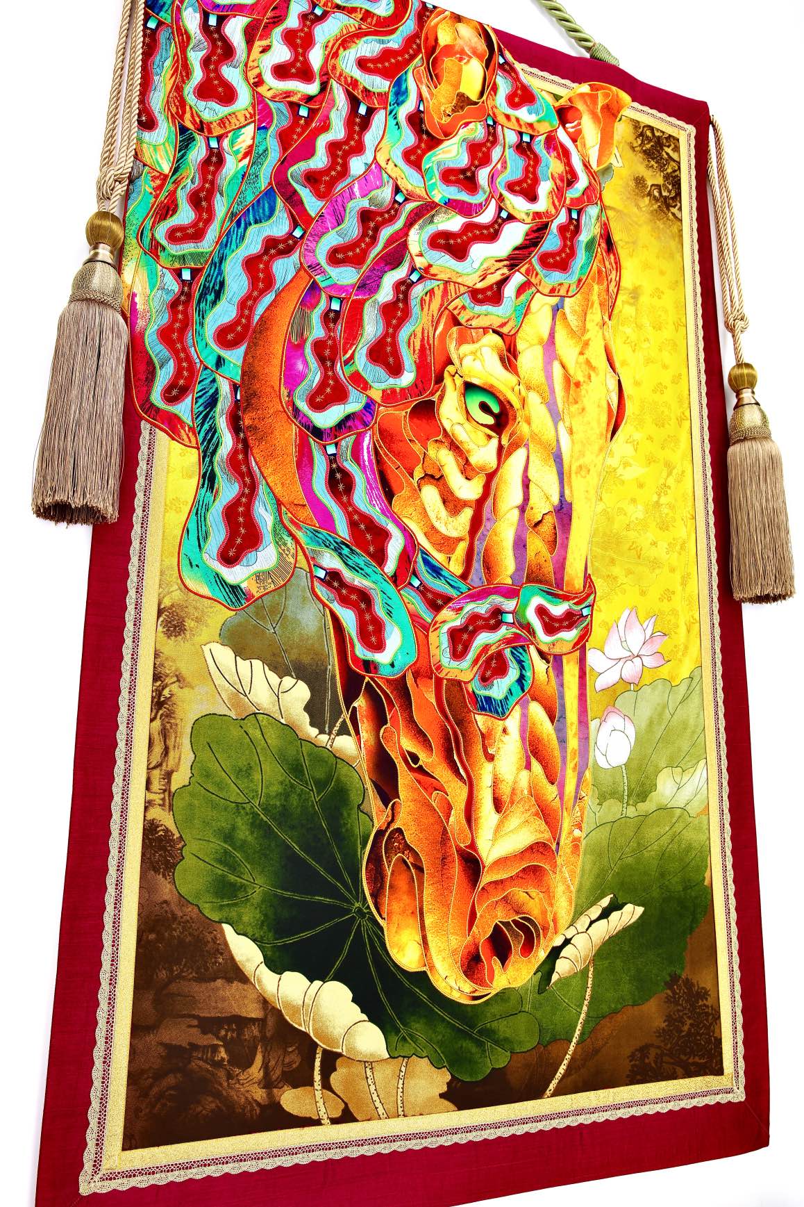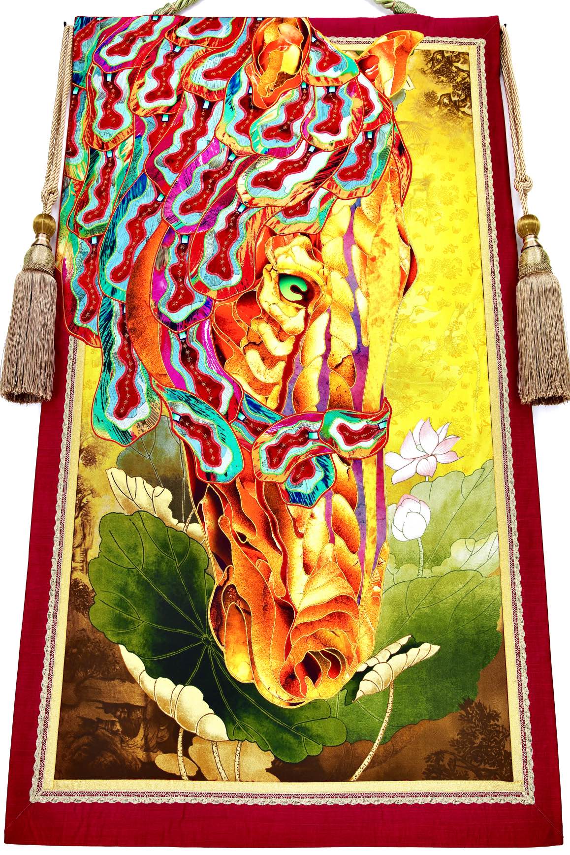 The artist is inspired by the works of Kinusaig. He developed and created a unique technique, the only one in the world in the field of textile art, combining original graphics and silk painting with factory paints of the highest class. This technology was developed using a special style of sewing. The work uses exclusive materials, silk, silk print and high-quality silk threads.