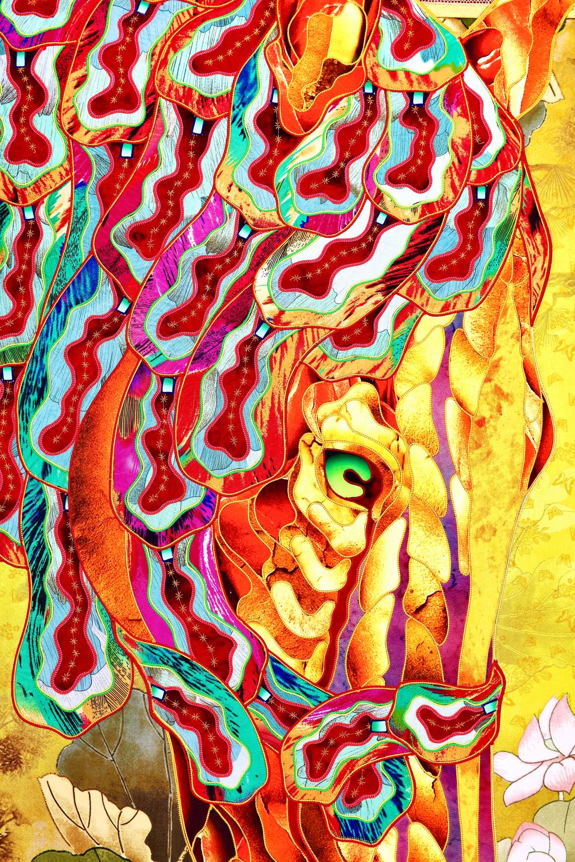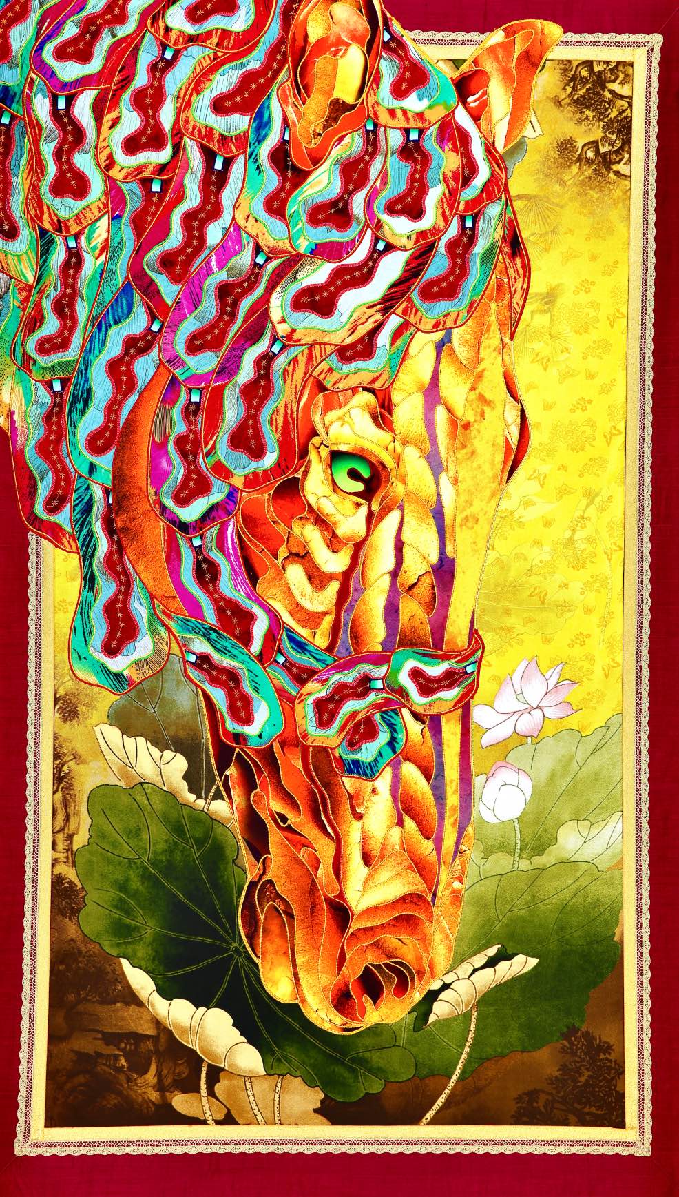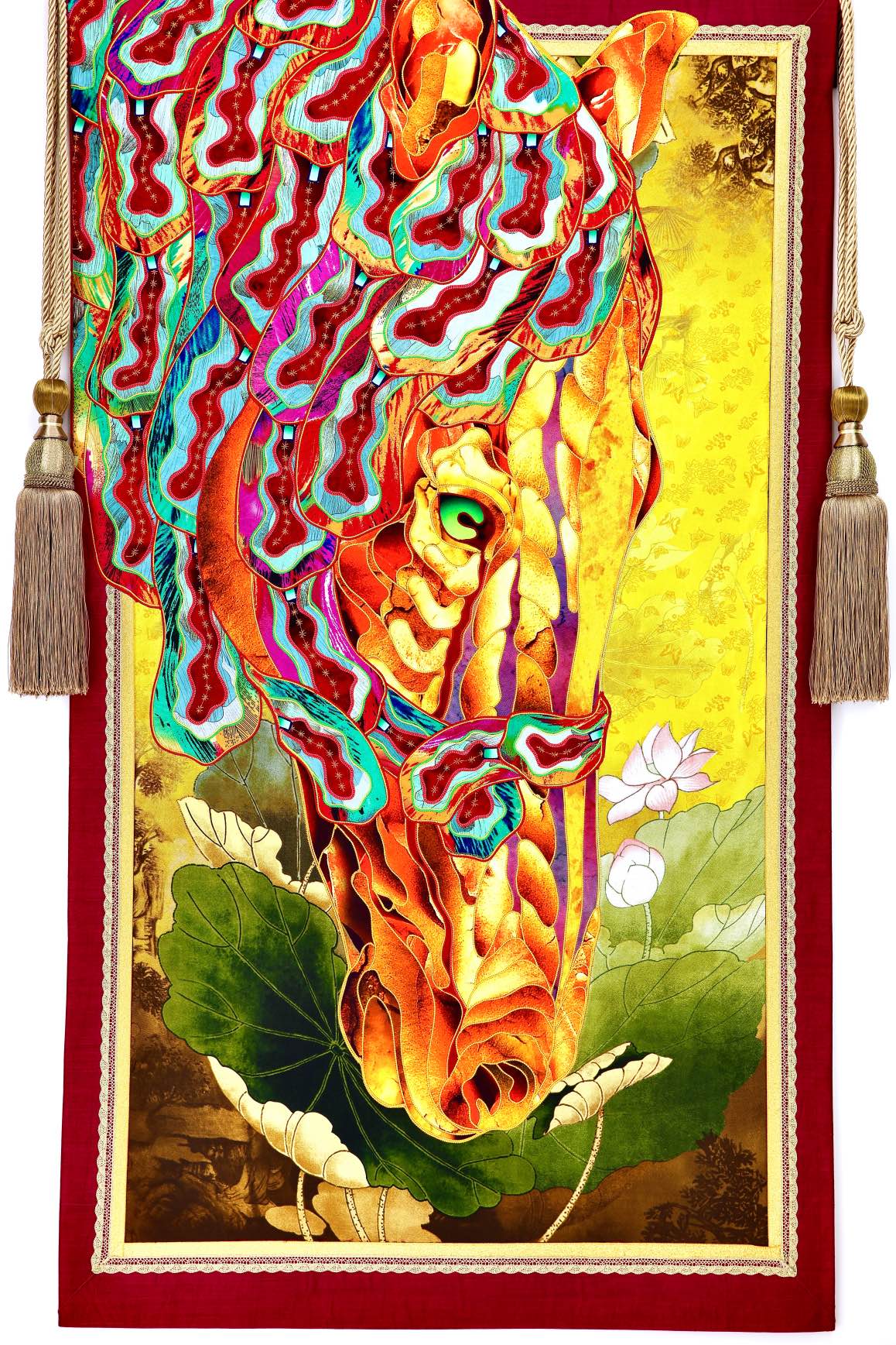 The artist is inspired by the works of Kinusaig. He developed and created a unique technique, the only one in the world in the field of textile art, combining original graphics and silk painting with factory paints of the highest class. This technology was developed using a special style of sewing. The work uses exclusive materials, silk, silk print and high-quality silk threads.