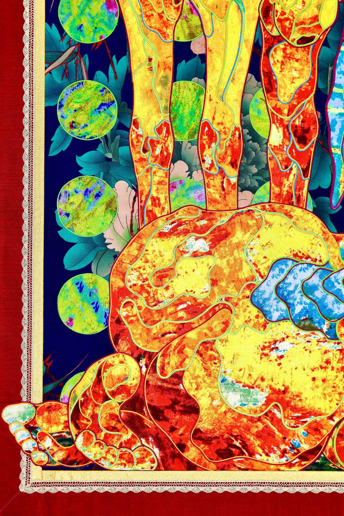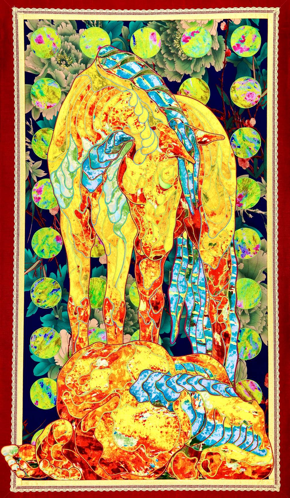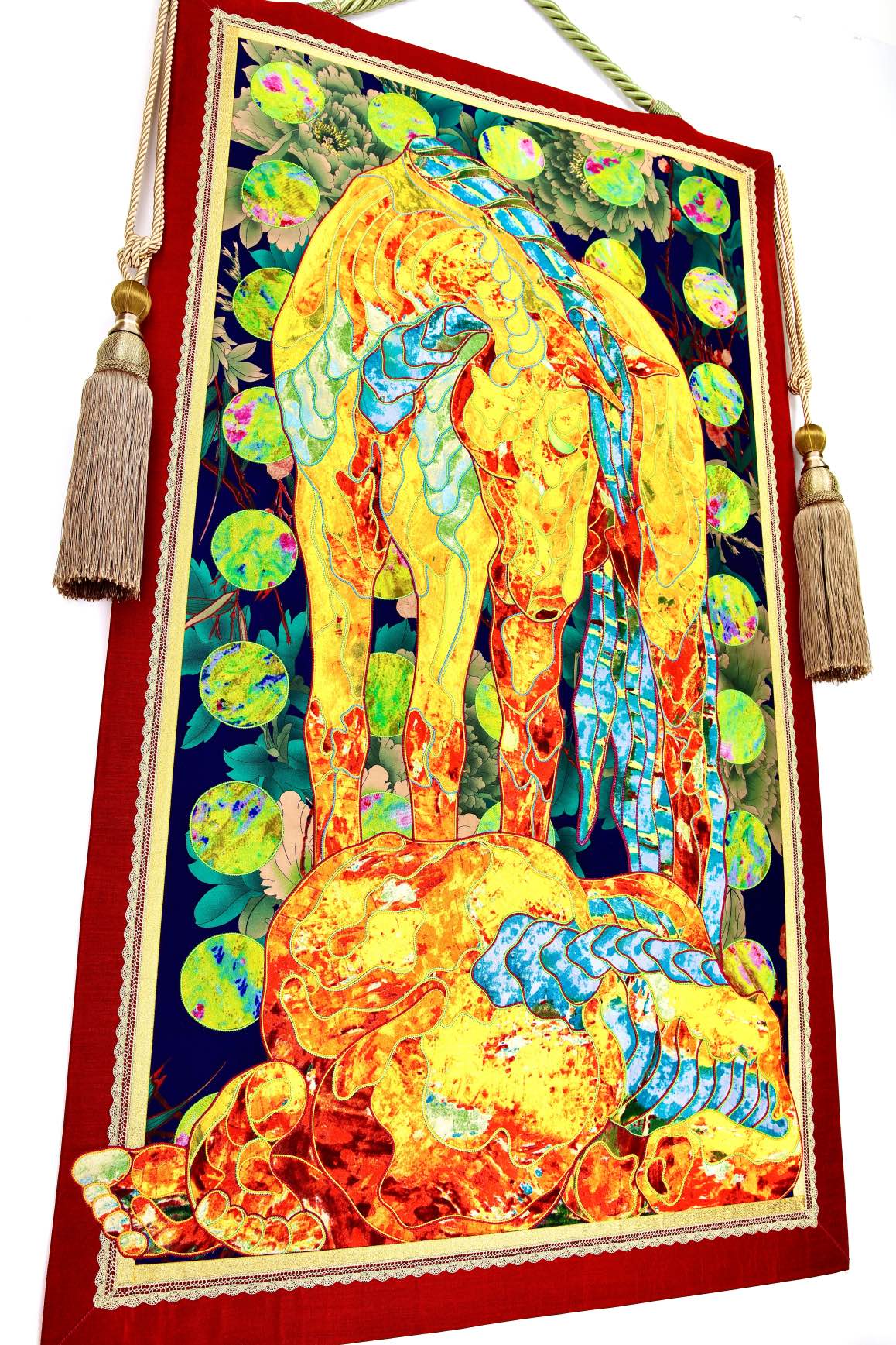 The artist is inspired by the works of Kinusaig. He developed and created a unique technique, the only one in the world in the field of textile art, combining original graphics and silk painting with factory paints of the highest class. This technology was developed using a special style of sewing. The work uses exclusive materials, silk, silk print and high-quality silk threads.