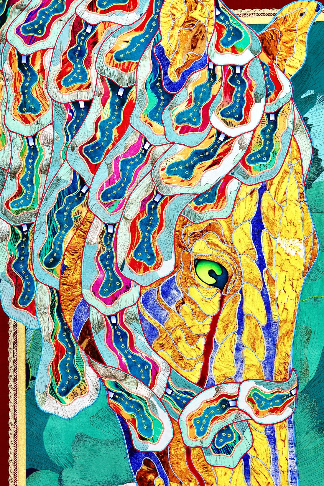 The artist is inspired by the works of Kinusaig. He developed and created a unique technique, the only one in the world in the field of textile art, combining original graphics and silk painting with factory paints of the highest class. This technology was developed using a special style of sewing. The work uses exclusive materials, silk, silk print and high-quality silk threads.