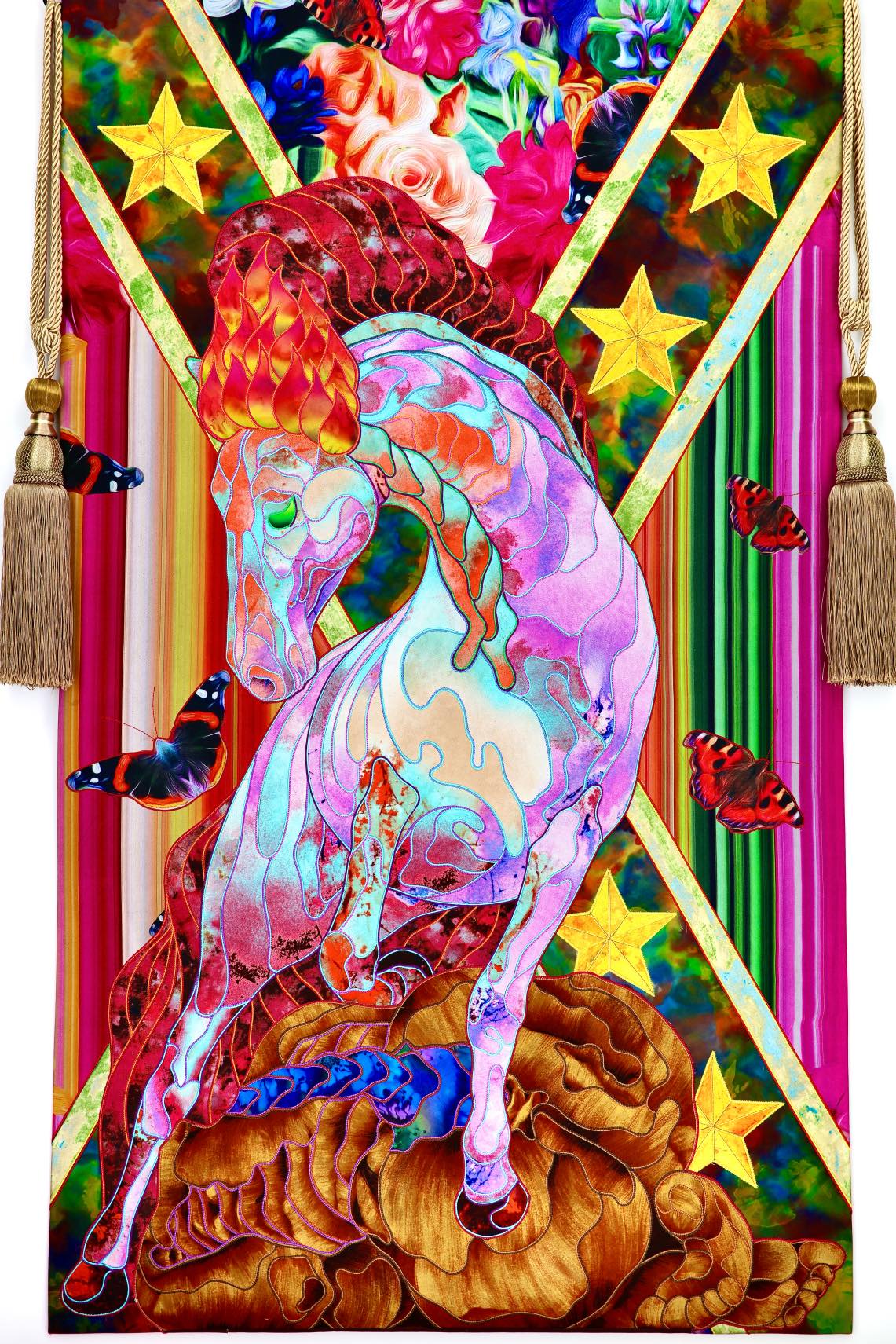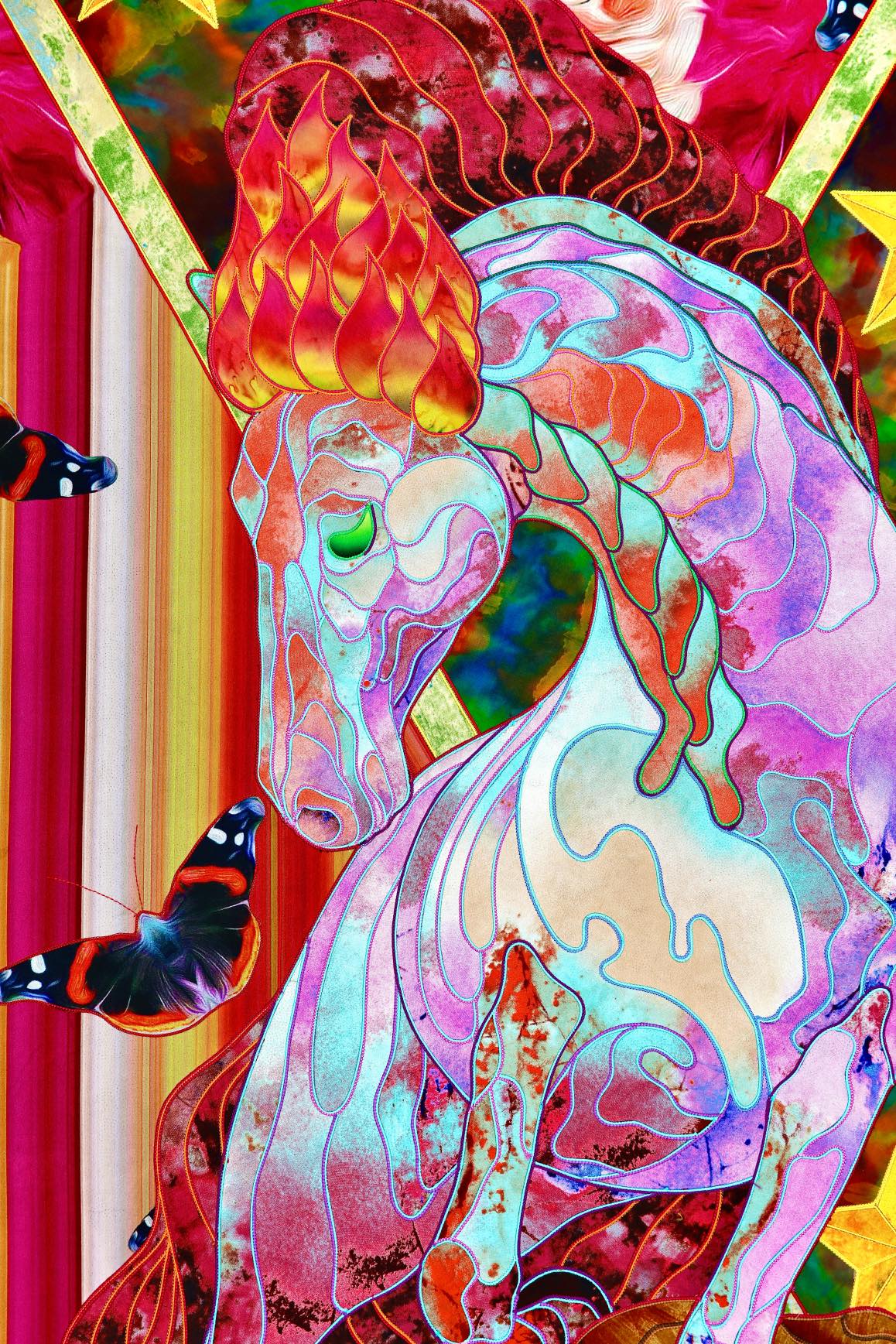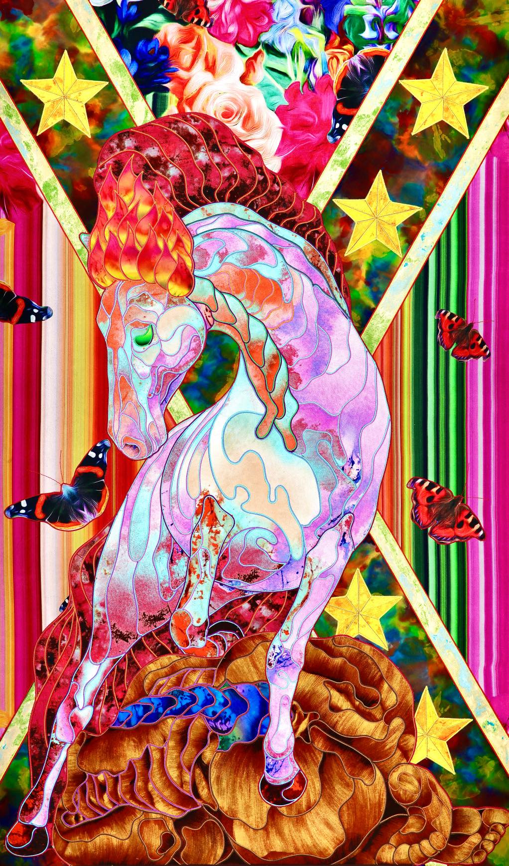 The artist is inspired by the works of Kinusaig. He developed and created a unique technique, the only one in the world in the field of textile art, combining original graphics and silk painting with factory paints of the highest class. This technology was developed using a special style of sewing. The work uses exclusive materials, silk, silk print and high-quality silk threads.