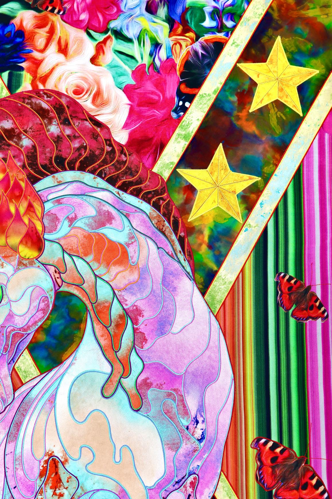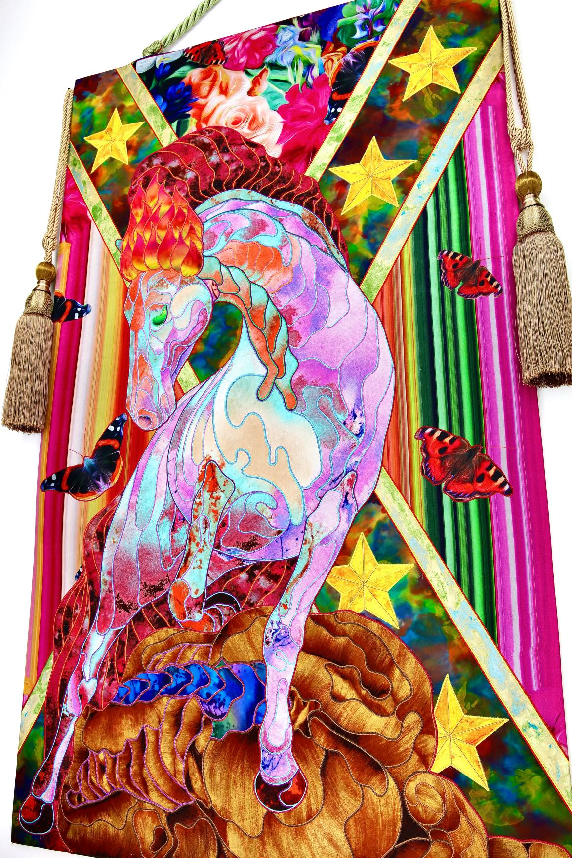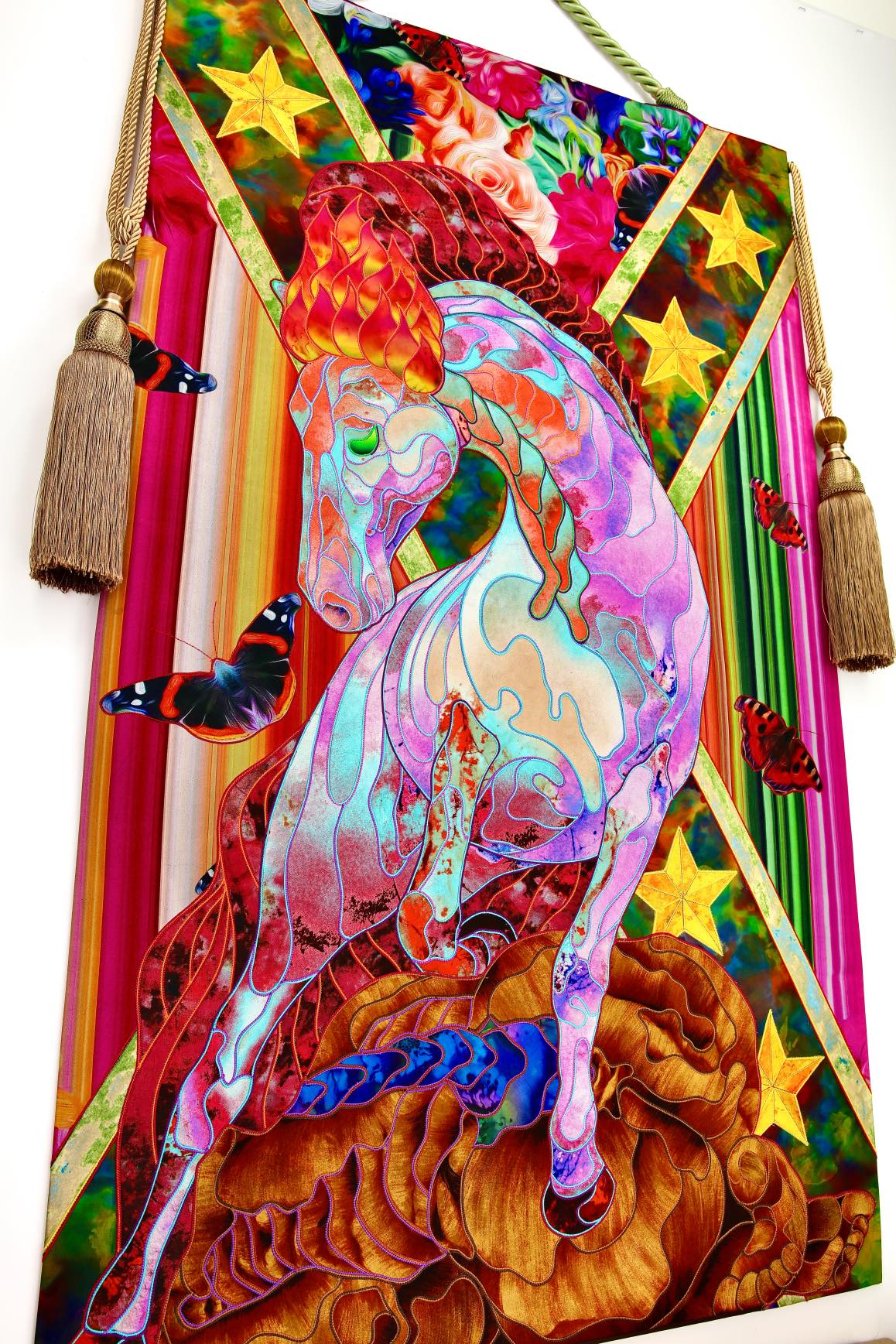 The artist is inspired by the works of Kinusaig. He developed and created a unique technique, the only one in the world in the field of textile art, combining original graphics and silk painting with factory paints of the highest class. This technology was developed using a special style of sewing. The work uses exclusive materials, silk, silk print and high-quality silk threads.