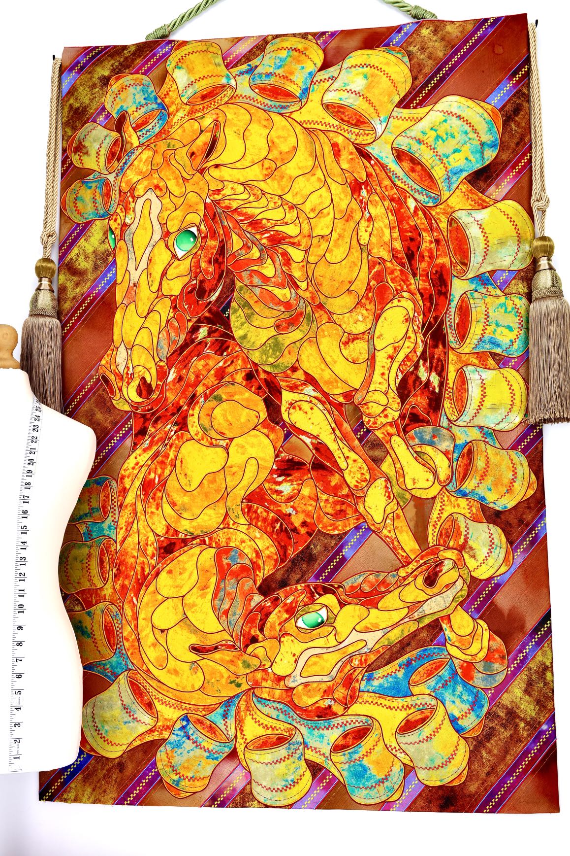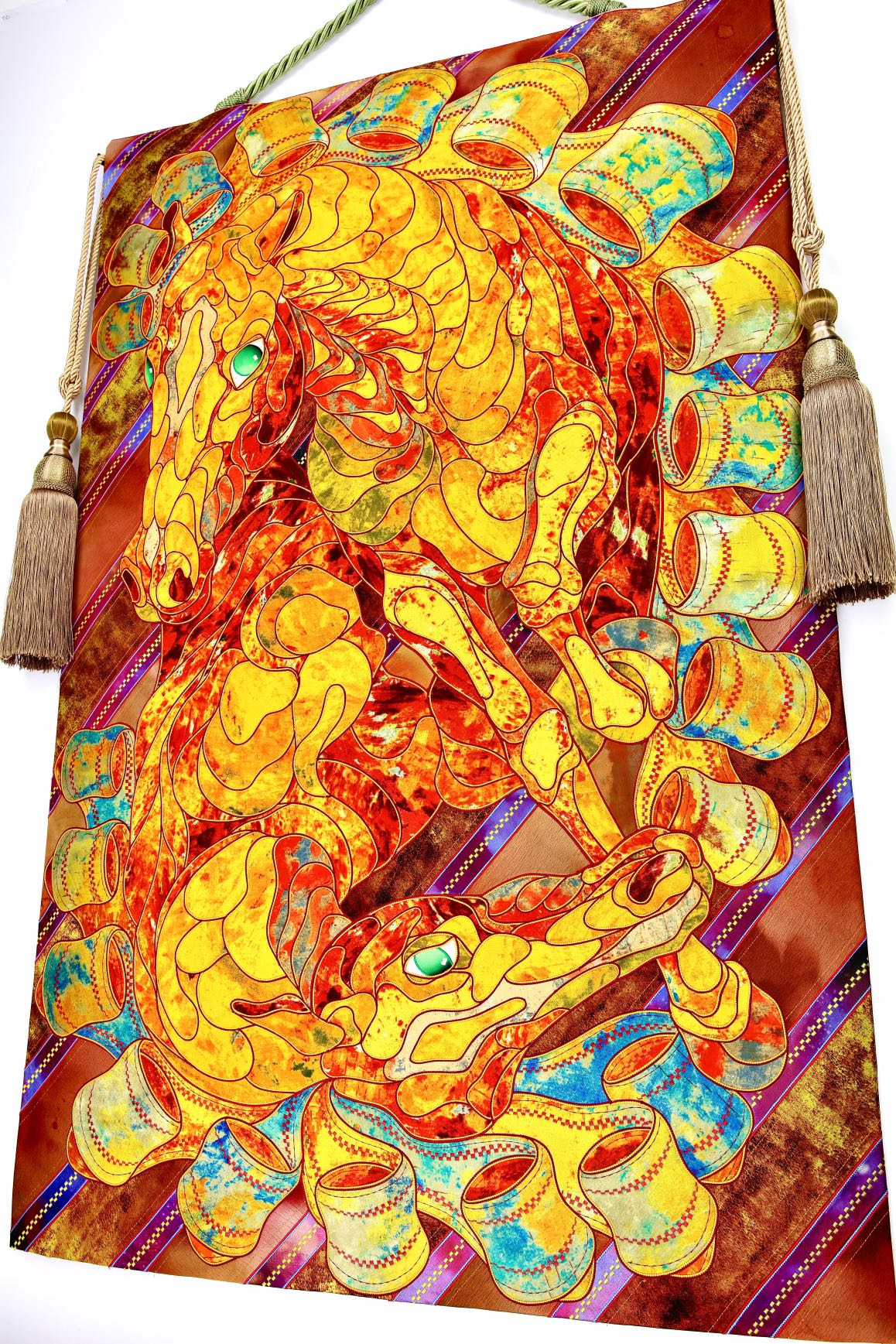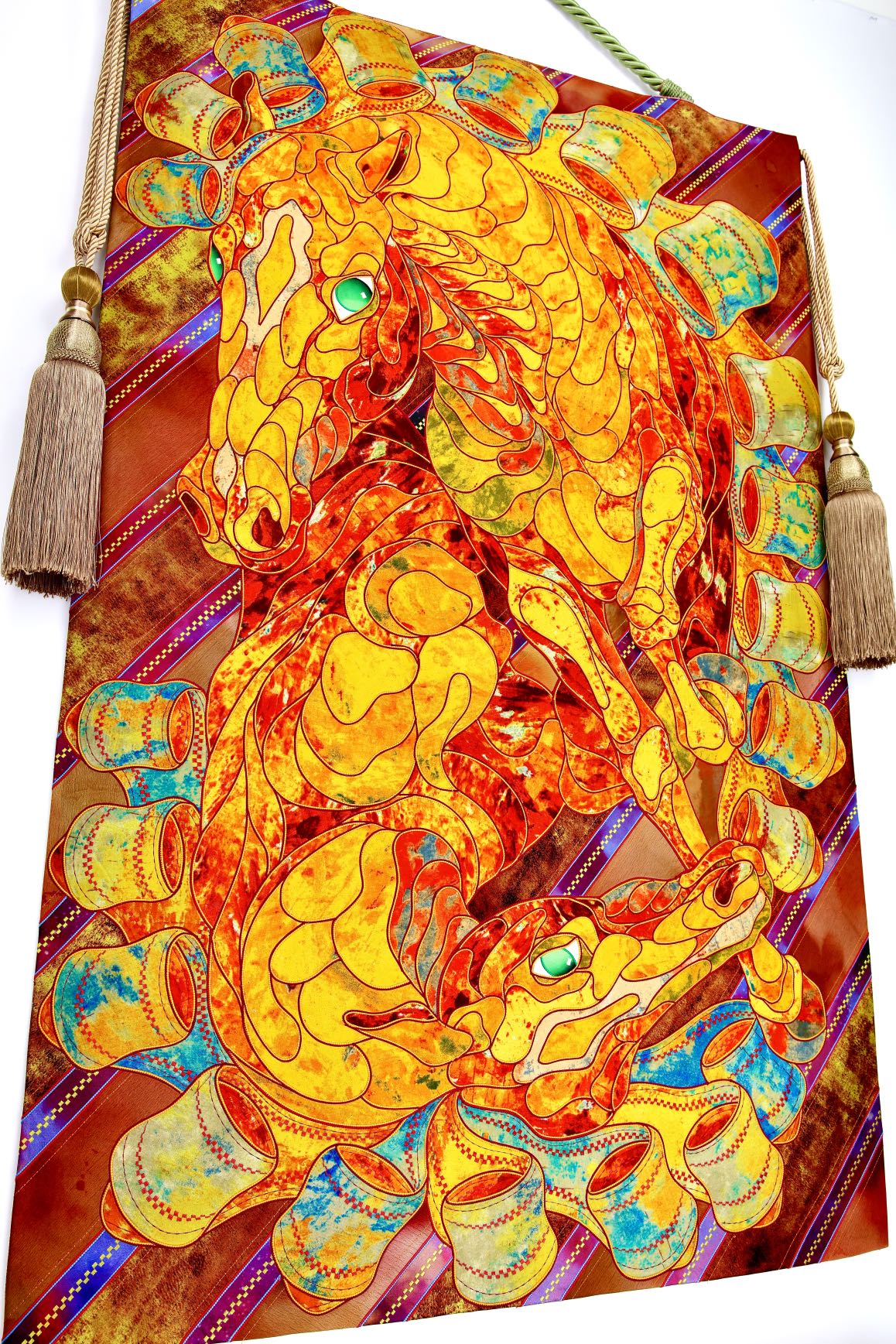 The artist is inspired by the works of Kinusaig. He developed and created a unique technique, the only one in the world in the field of textile art, combining original graphics and silk painting with factory paints of the highest class. This technology was developed using a special style of sewing. The work uses exclusive materials, silk, silk print and high-quality silk threads.
