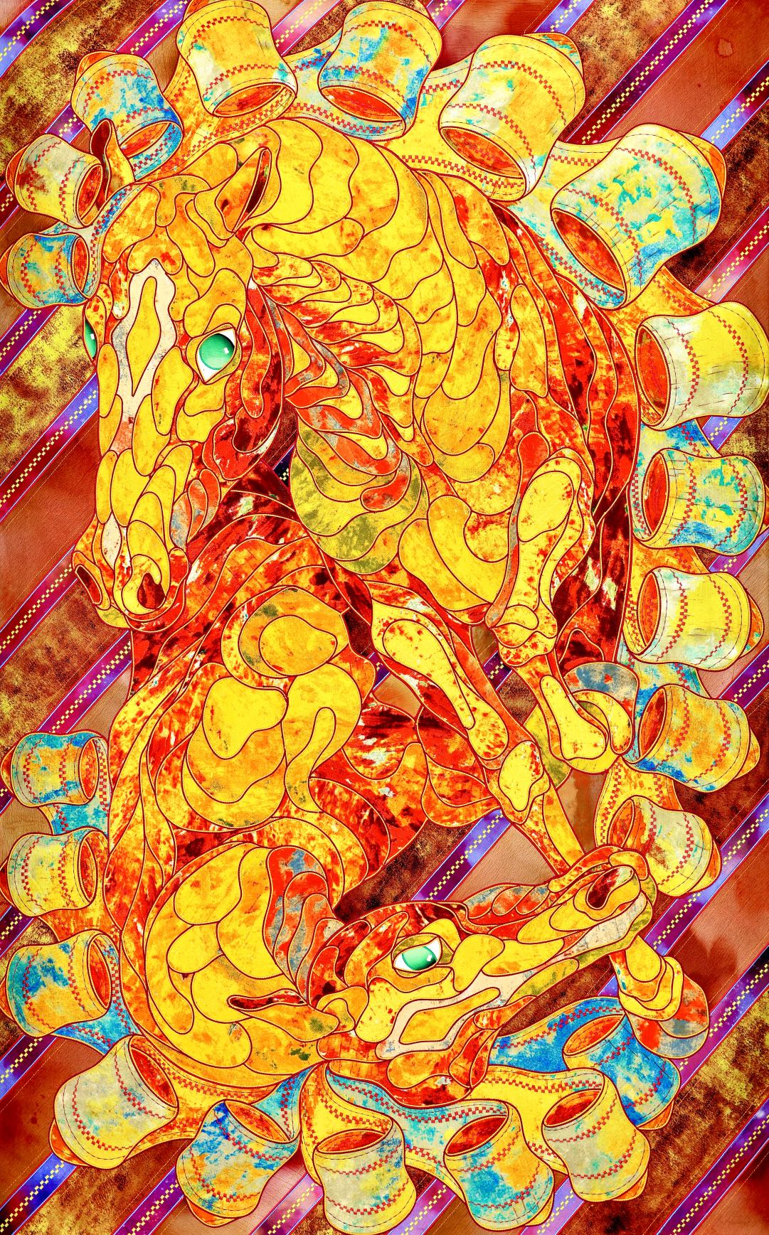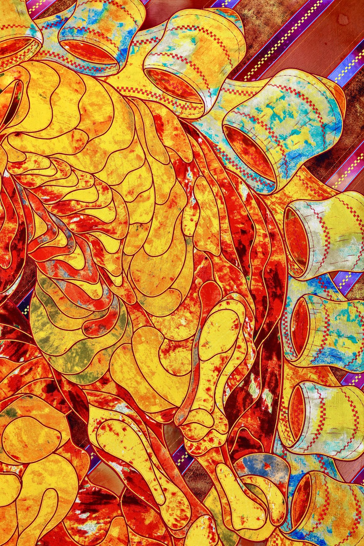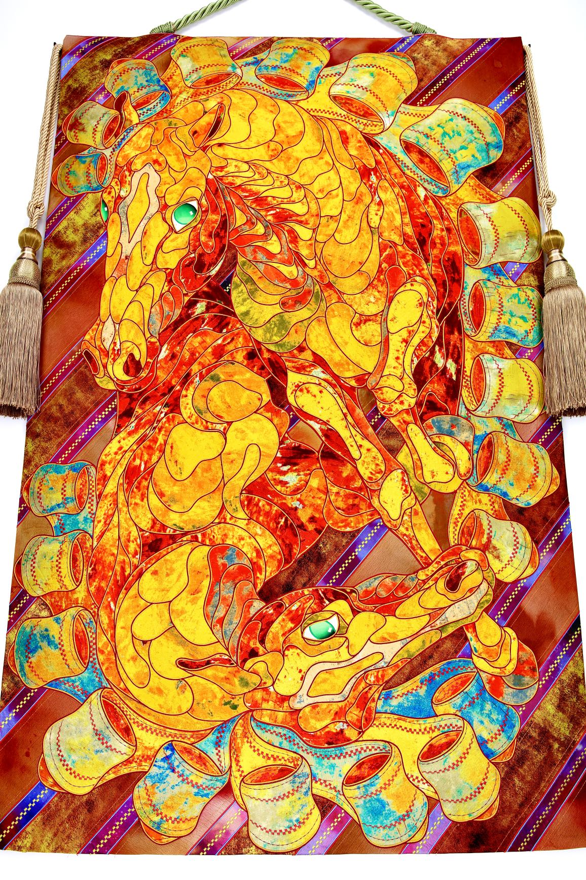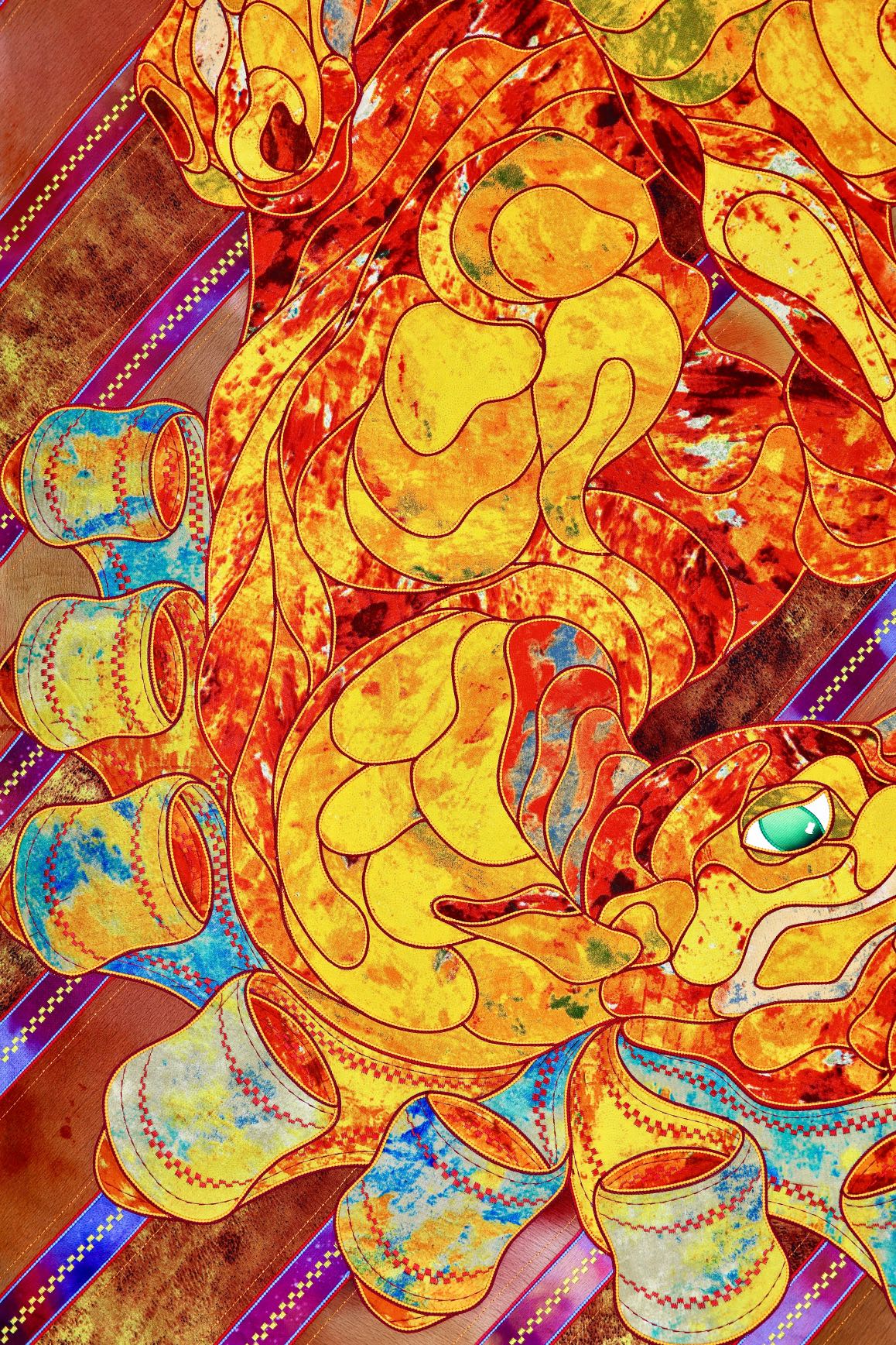 The artist is inspired by the works of Kinusaig. He developed and created a unique technique, the only one in the world in the field of textile art, combining original graphics and silk painting with factory paints of the highest class. This technology was developed using a special style of sewing. The work uses exclusive materials, silk, silk print and high-quality silk threads.