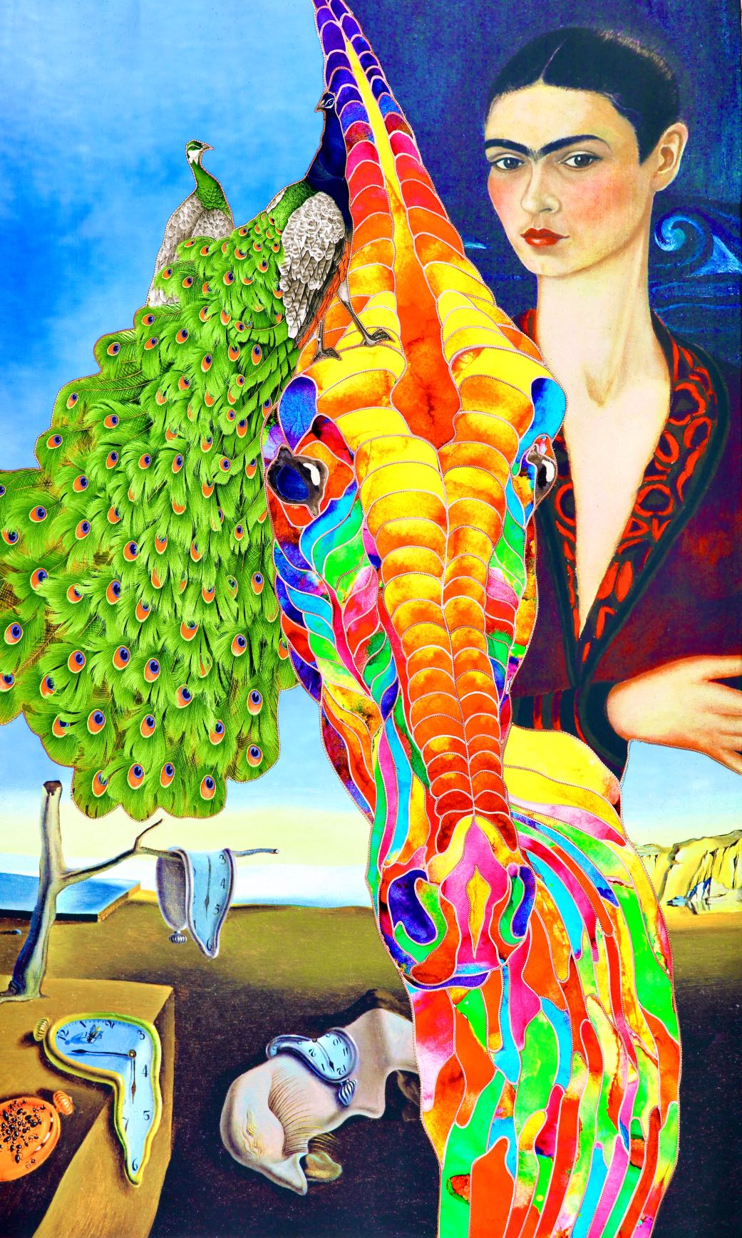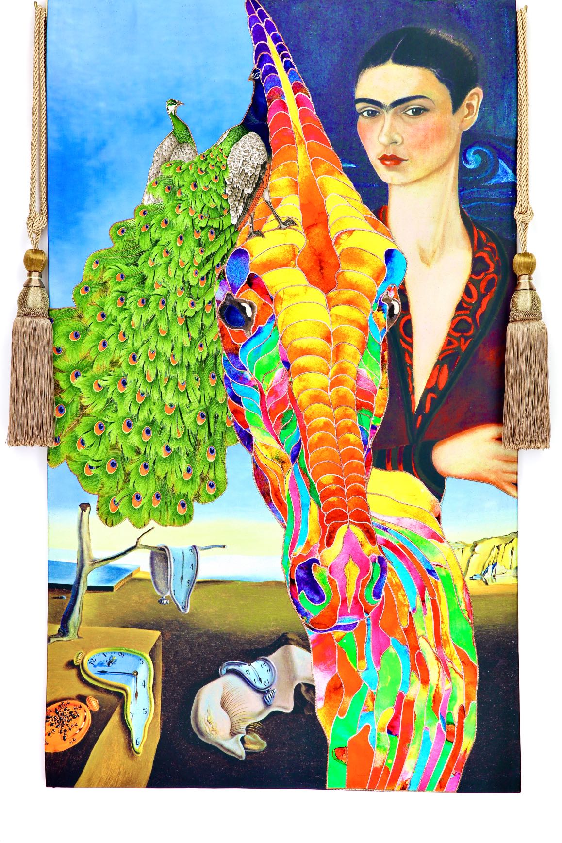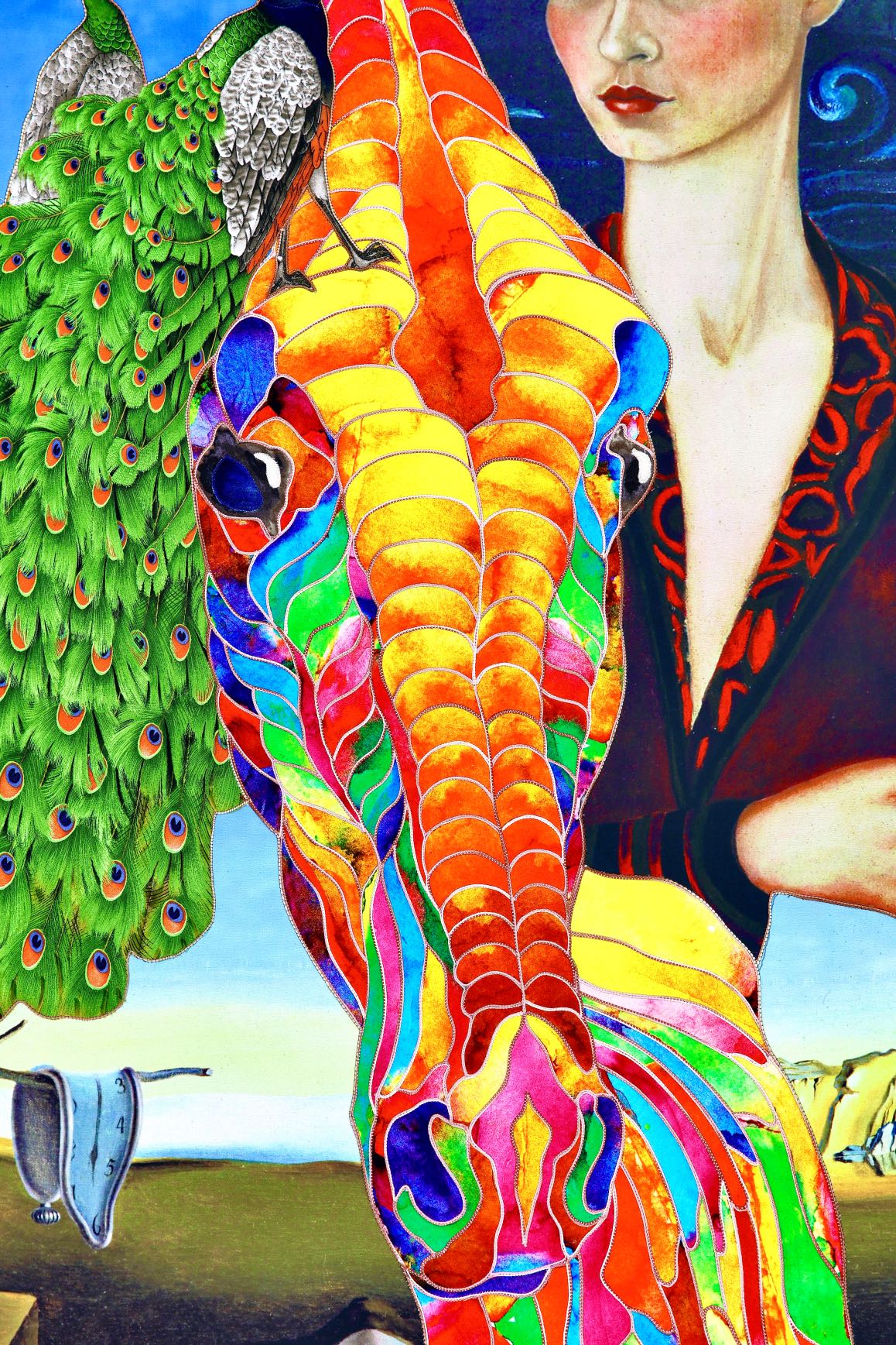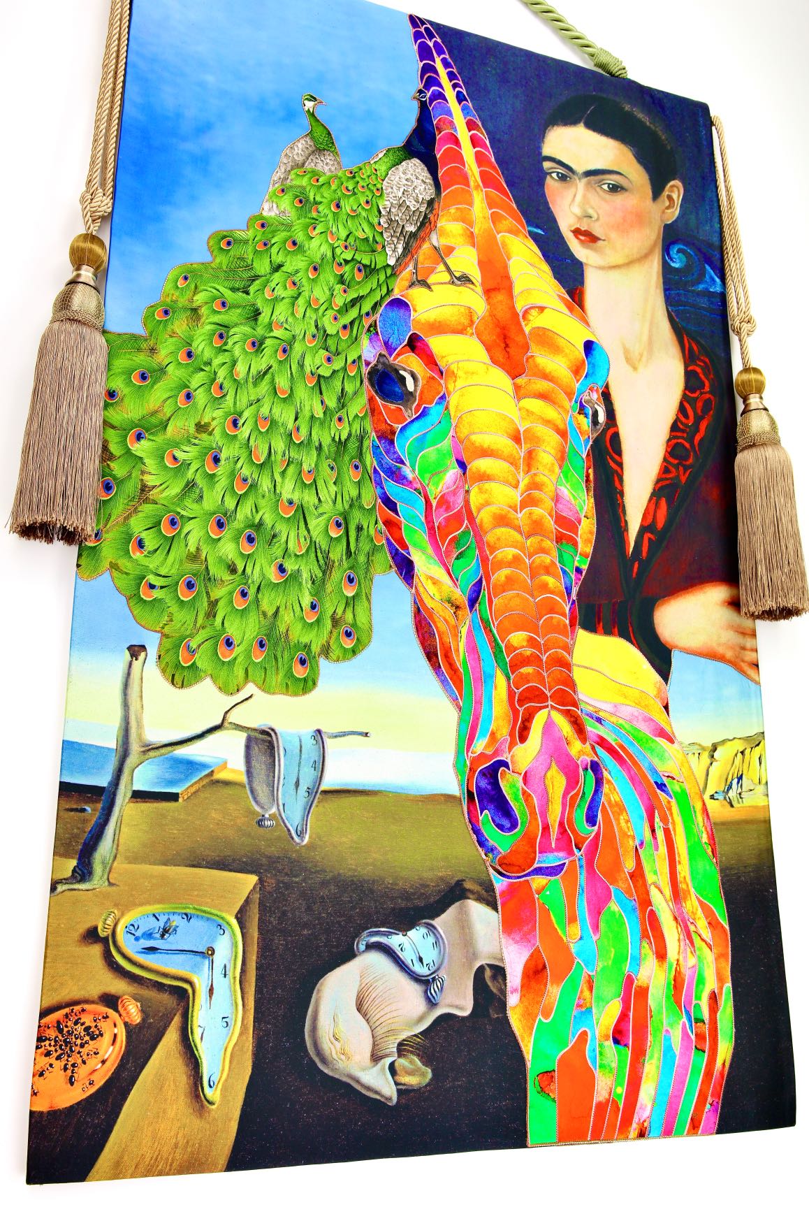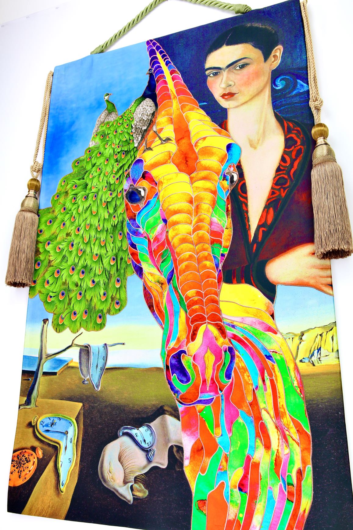 The artist is inspired by the works of Kinusaig. He developed and created a unique technique, the only one in the world in the field of textile art, combining original graphics and silk painting with factory paints of the highest class. This technology was developed using a special style of sewing. The work uses exclusive materials, silk, silk print and high-quality silk threads.