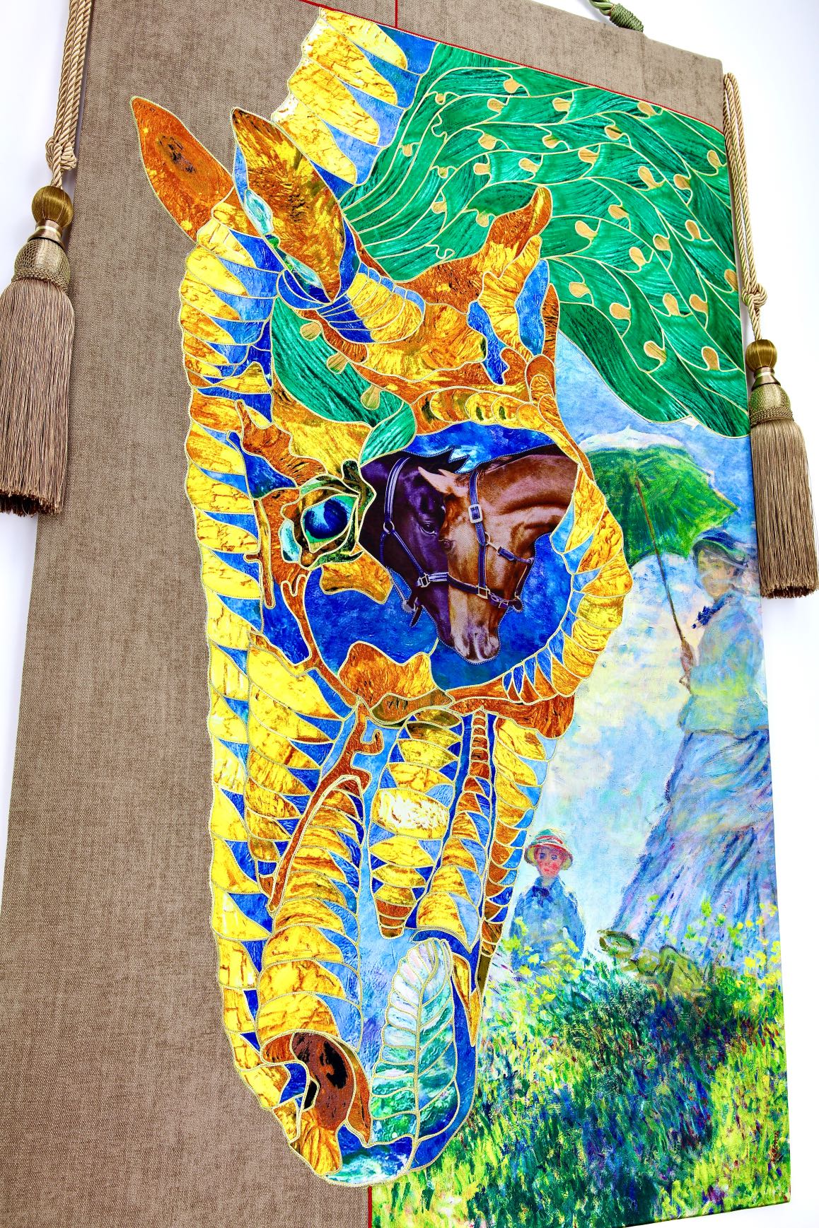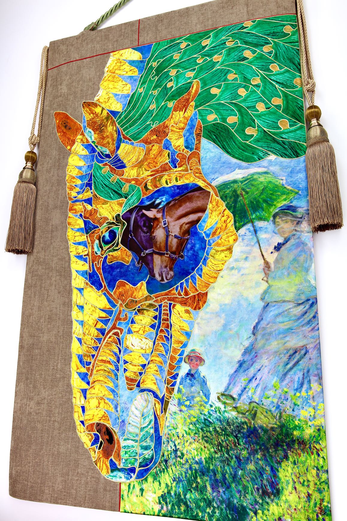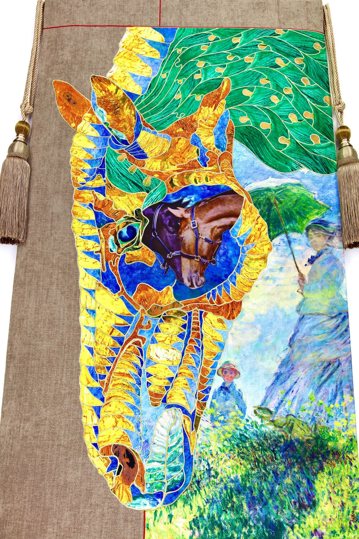 The artist is inspired by the works of Kinusaig. He developed and created a unique technique, the only one in the world in the field of textile art, combining original graphics and silk painting with factory paints of the highest class. This technology was developed using a special style of sewing. The work uses exclusive materials, silk, silk print and high-quality silk threads.