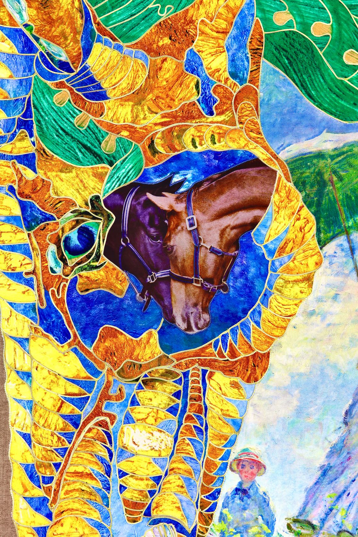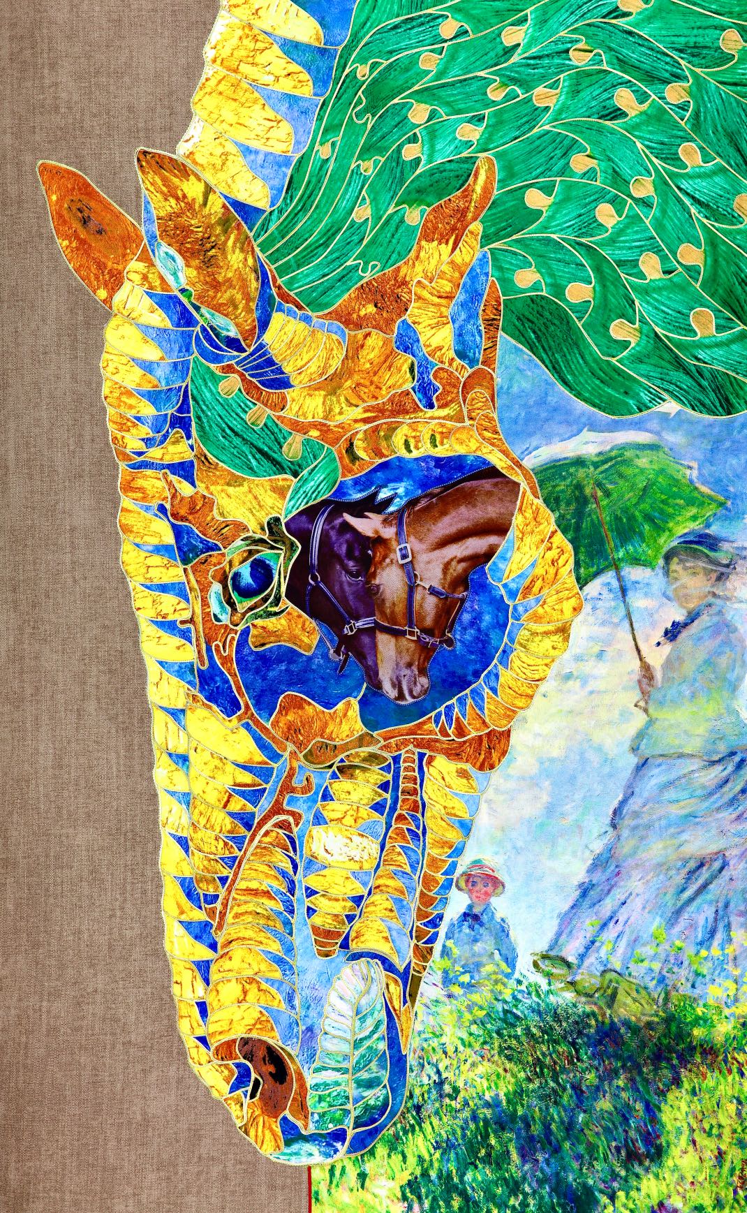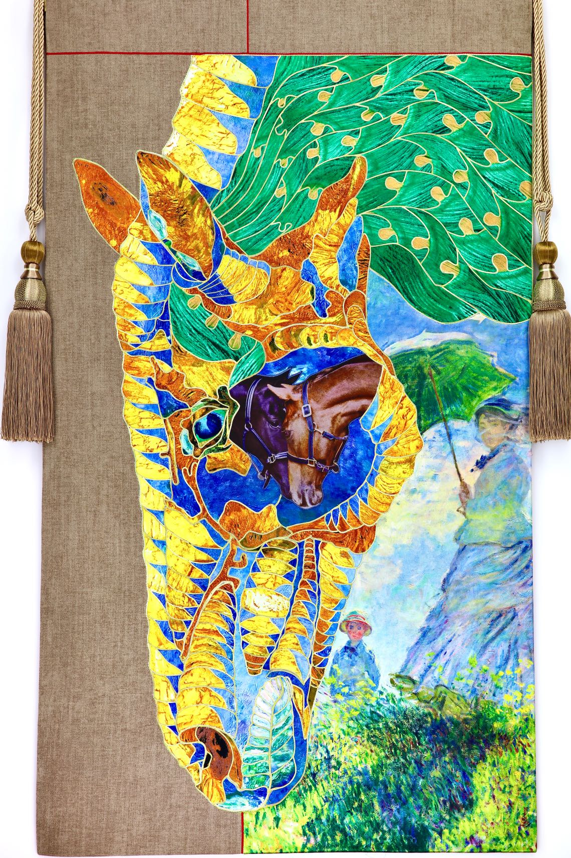 The artist is inspired by the works of Kinusaig. He developed and created a unique technique, the only one in the world in the field of textile art, combining original graphics and silk painting with factory paints of the highest class. This technology was developed using a special style of sewing. The work uses exclusive materials, silk, silk print and high-quality silk threads.